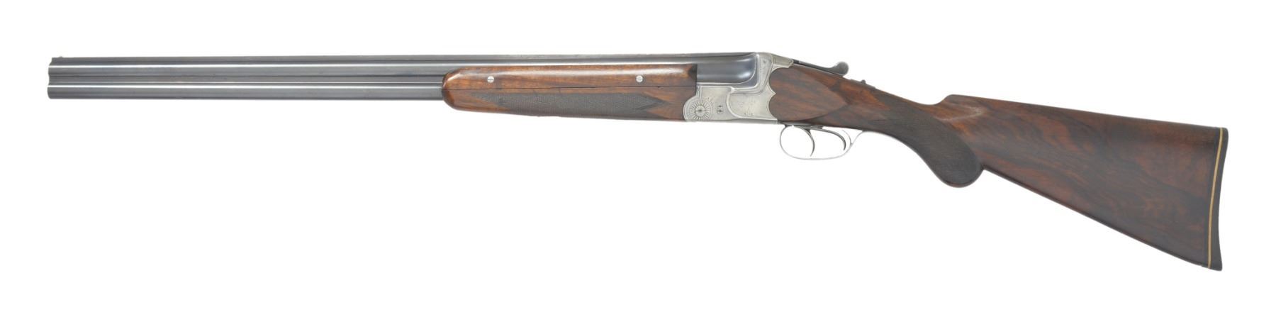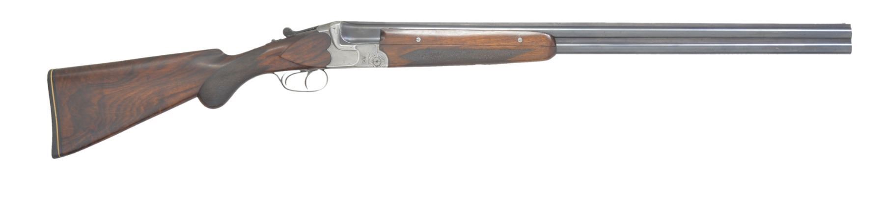 Cal. 16 Ga. S# 33531. Bbls. 27 1/4" w/ solid rib & colored white front sight. Fixed Mod. & Full chokes. Chambers are opened to 2 3/4" & forcing cones are lengthen. Scalloped boxlock action w/ crossbolt lock. Dbl. triggers & extractors. 3 Piece forearm & rnd. knob stock of fancy European walnut w/ point pattern hand checkering. LOP: 14 3/8" over aftermarket Pachmayr rifle pad. Pre World War II production, date code "1135" on bbls. indicates Nov. 1935 mfg. CONDITION: 80% lightly faded bbl. blue. Action has faded to gray retaining traces of case colors in protected areas. Refinished wood shows scratches & marks. Good bright bores. (19-5780/DS). CURIO. $600-900.