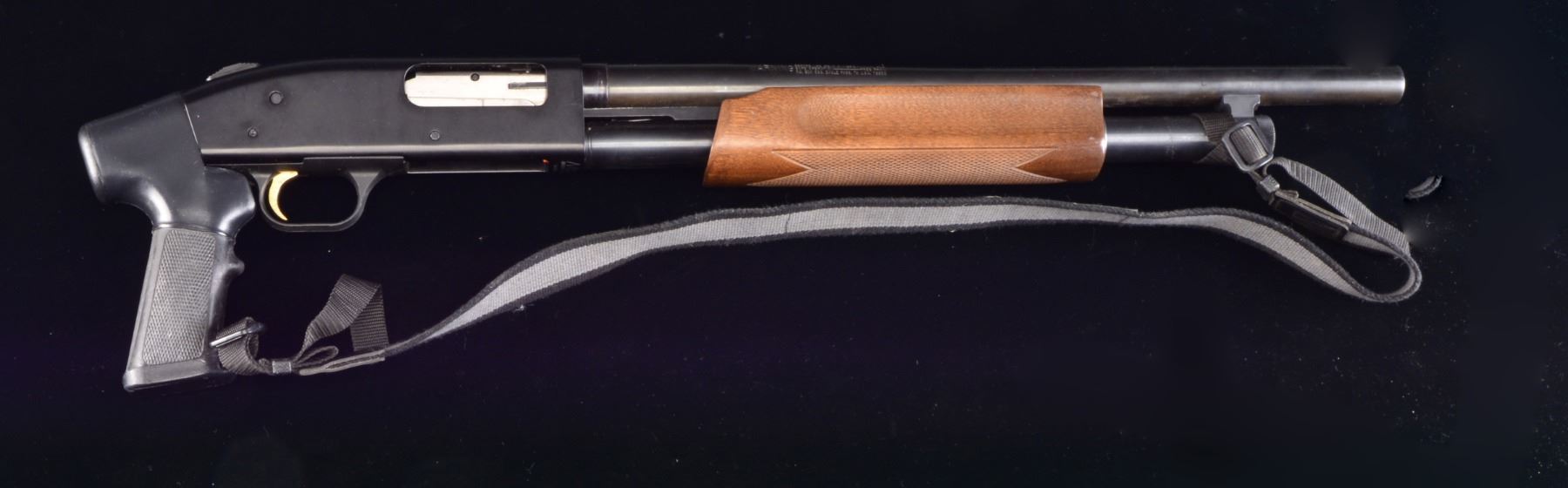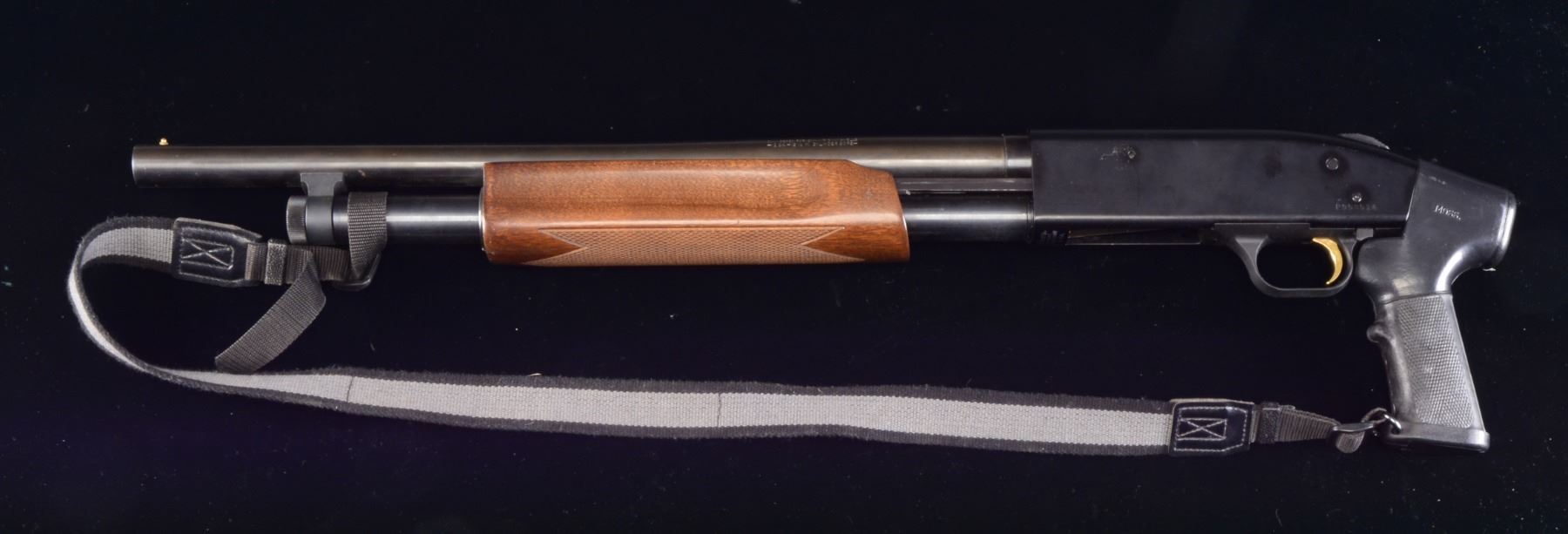 Cal. 12 Ga., 2 3/4" & 3". S# P953514. Bbl. 18 1/2" cyl. w/ brass front bead. Matte finished dark black alloy receiver, blued steel bbl. & mag. Gold wash trigger. Receiver drilled & tapped for scope mt. Hardwood checkered forend. Aftermarket Mossberg pistol grip assembly. CONDITION: finish on all exterior surfaces very good w/ minor thinning on some high spots. Hammer does not release, trigger does not pull; likely due to safety being installed backwards. Bright shiny bore. (20-110/JZ). MODERN. $100-200.