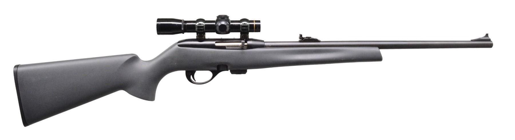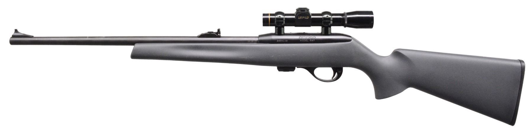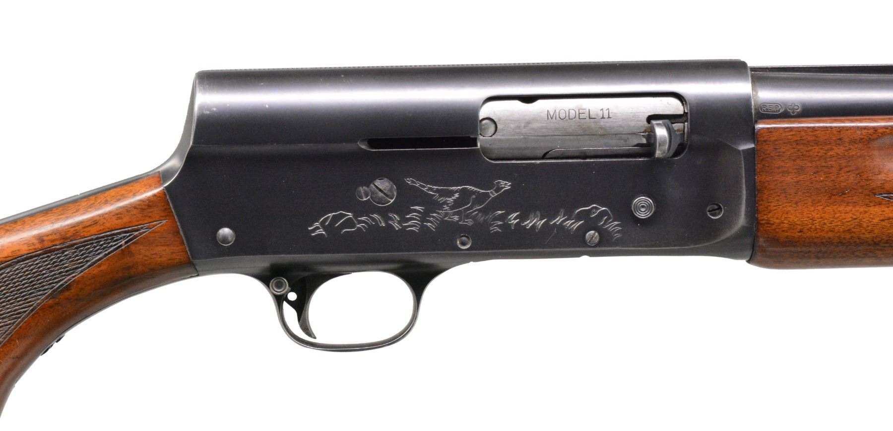 1) MODEL 597 AUTO LOADING RIFLE. Cal. 22 LR. S# 2664102. Bbl. 20". Blade front sight w/ adj. rear sight. Lepould M8-2.5x Compact gloss finish scope w/ duplex retical on tip off mounts. Matte black finish. Dark gray synthetic stock. MAGS: 1 staggered box 10 rd. detachable. CONDITION: over 98% finish. Near excellent bore. Scope has bright optics. (19-5972/DS). MODERN. 2) MODEL 11 AUTO LOADING SHOTGUN. Cal. 20 Ga., 2 3/4". S# 1081882. Bbl. 28" solid rib w/ fixed full choke & steel bead. Blued action w/ flying mallard on left side & pheasant on right. Walnut forearm & pistol grip stock w/ hand checkering. LOP: 14" over original buttplate. CONDITION: over 85% original blue showing edge wear & light fading. Original wood finish shows scattered scratches & handling marks. Very good bright bore. (19-5974/DS). CURIO. $500-800.