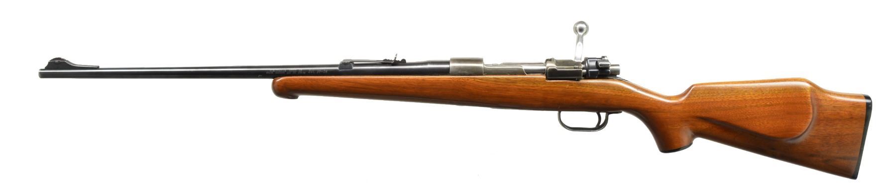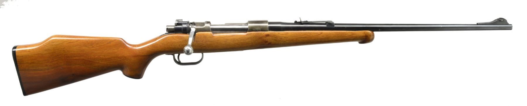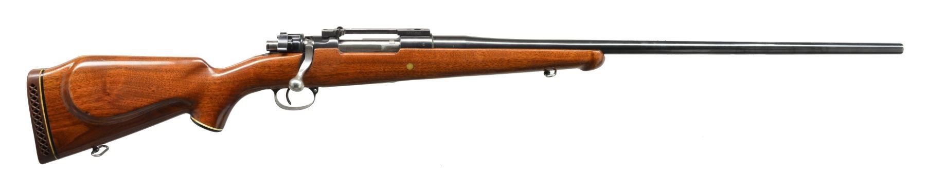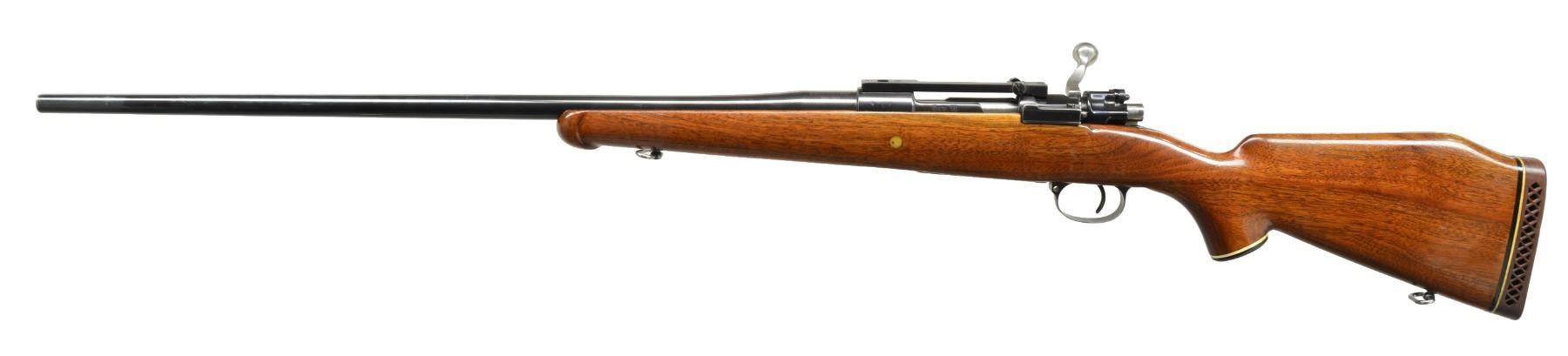 1) SPORTERIZED FN MAUSER 98 BOLT ACTION RIFLE. Cal. 30-06. S# 4485. Sporterized military FN Model 98 action w/ 22" JC. Higgins bbl. marked on left rail "FAB. NAT. D" ARMES de GUERRE HERSTAL-BELGIQUE". Bolt handle has been altered to lower profile. Trigger guard replaced w/ late WWII German sheet metal type w/ non removable floorplate. Open sporting rear sight. Blade front sight w/ ramp. Walnut sporter stock w/ cheekpiece & Monte Carlo comb. Schnabel forend tip, black plastic grip cap & buttplate. CONDITION: stock shows hobbyist gunsmith type workmanship w/ finish runs & open inletting. Has lg. cracks behind receiver tang repaired by epoxy. Action & bbl. have been glass bedded. Action has extensive pitting at wood line partially removed by polishing. Bbl. retains lg. degree of original blue finish. Very good shiny bore. (20-576/RW). 2) SPORTERIZED MODEL 98 MAUSER BOLT ACTION RIFLE. Cal. 7x61 Sharpe & Hart. S# 2313. Bbl. 25 3/4". Remodeled GEW 98 Mauser rifle. Receiver rail marked on left side "GEW 98". Receiver ring marked on right side w/ obscured German crown proofs. Bbl. marked on top left over chamber "SHERIDAN GUN SHOP 7x61 S&H." Action fitted w/ Redfield Junior scope base. Bolt handle replaced w/ low scope sporting type. Bueller low scope safety. No iron sights are fitted. Walnut stock has Monte Carlo comb w/ cheekpiece for left handed shooter. Schnabel forend tip. Black grip cap w/ white line spacer. Ventilated Pachmayr recoil pad. Action & bbl. are glass bedded. Recoil bolt area has epoxy filler. CONDITION: stock has light wear & handling marks. Metal retains 90% professional reblue finish w/ light wear & scattered sm. scratches. Very good shiny bore. (20-578/RW). BOTH MODERN. $400-600.