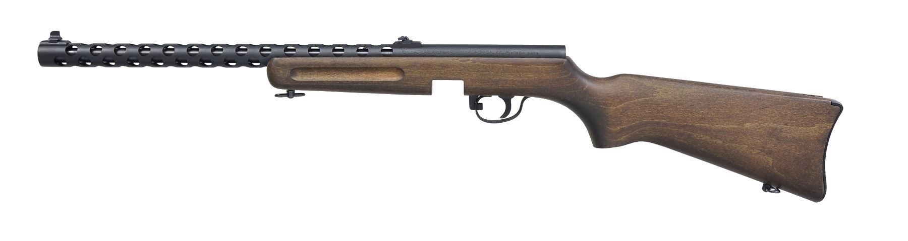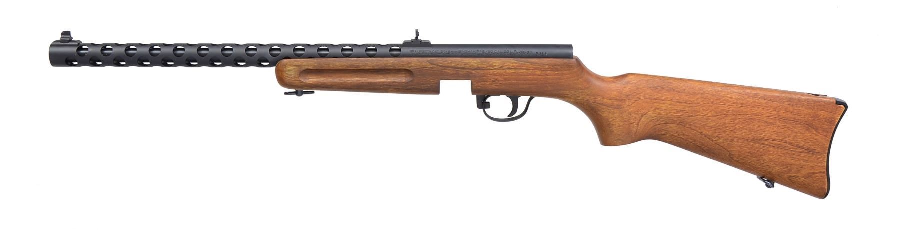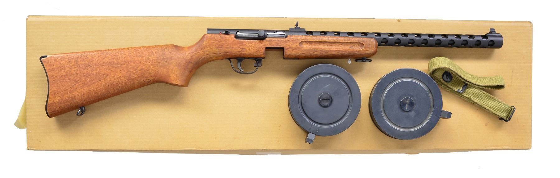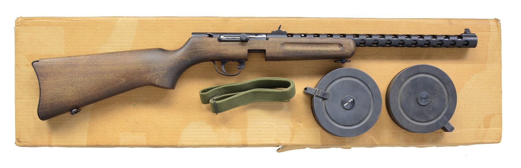 1) BINGHAM PPS/50 RIFLE DL GRADE. Cal. 22 LR. S# 6077. Bbl. 16 1/8". Parkerized receiver & full length bbl. shroud w/ circular vents are made from one piece of tubular steel. Dovetail mounted blade front sight windage adj. w/ folding leaf rear sight. Finger groove walnut stock w/ aluminum carbine buttplate. Bottom mounted sling swivels front & rear. MAGS: 2 detachable 50 rd. steel drums. UNATTACHED ACCESSORIES: green canvas sling, 2 sets of original sling swivels additional & styrofoam lined original factory box. CONDITION: parkerized finish on exposed metal surfaces unblemished. Wooden stock is free of any noticeable defects or impressions. Shiny bore w/ strong rifling. For all practical purposes this gun appears to have been lightly used, possibly just test fired. Fire control mechanism appears to function correctly when cycled by hand.(19-5899/JZ). 2) BINGHAM PPS/50 RIFLE GRADE S. Cal. 22 LR. S# 3859. Bbl. 16 1/8". Parkerized receiver & full length bbl. shroud w/ circular vents are made from one piece of tubular steel. Dovetail mounted blade front sight windage adj. w/ folding leaf rear sight. Finger groove walnut stock w/ aluminum carbine buttplate. Bottom mounted sling swivels front & rear. MAGS: 2 detachable 50 rd. steel drums. UNATTACHED ACCESSORIES: green canvas sling, drum loader & styrofoam lined original factory box. CONDITION: parkerized finish on exposed metal surfaces largely unblemished aside from a sm. scratch at 5 o'clock on bbl. shroud & a few light lines of thinning at 6 o'clock. Dark wooden stock appears unblemished. Good bore w/ strong rifling. Fire control mechanism appears to function correctly when cycled by hand. (19-5900/JZ). BOTH MODERN. $600-1,000.