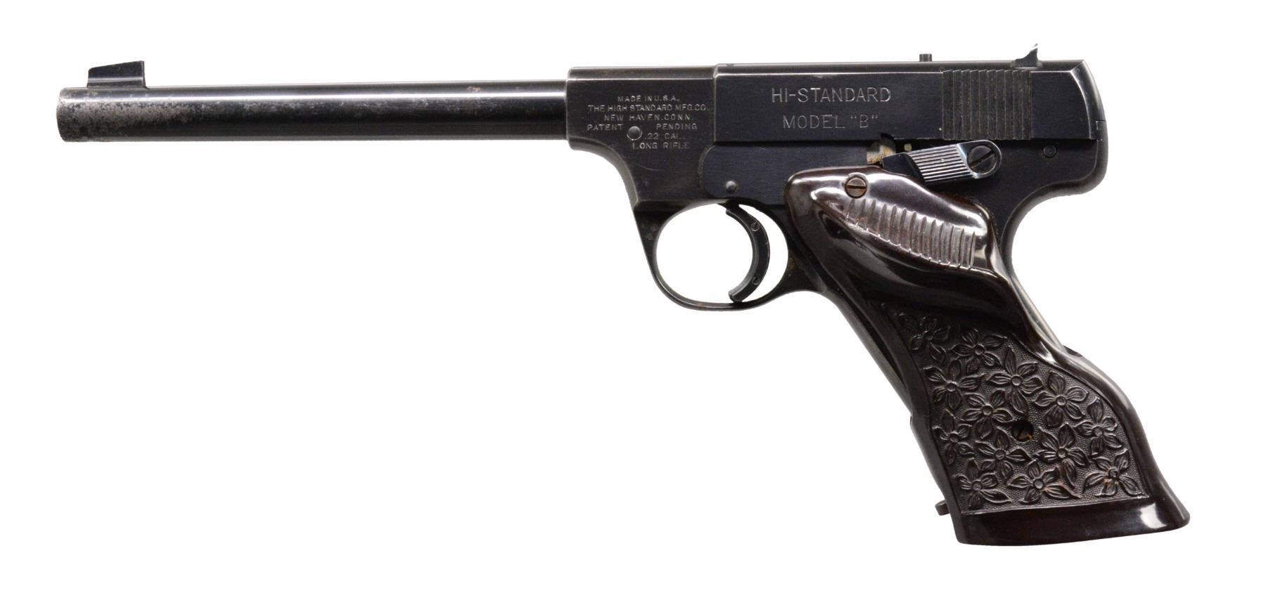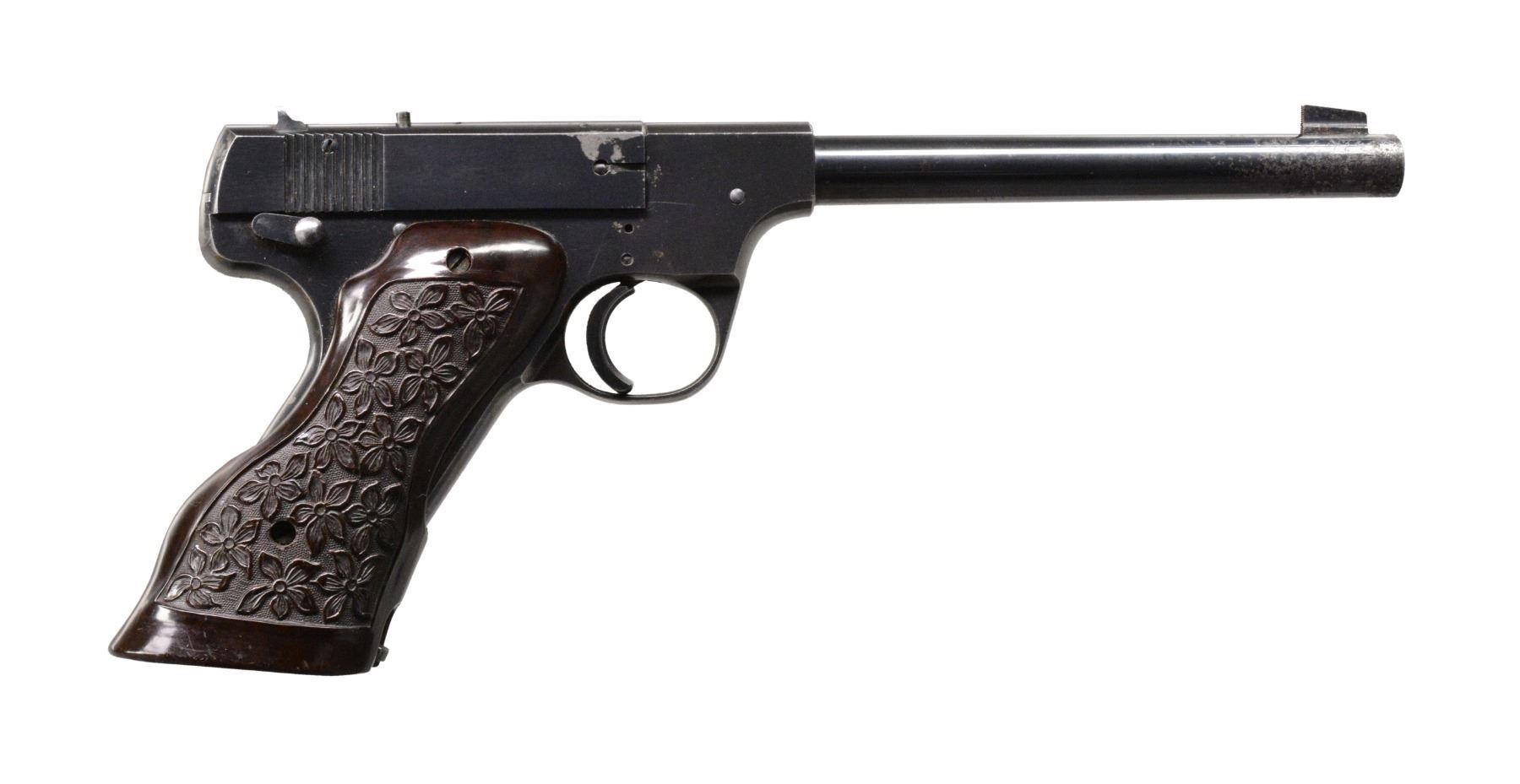 Cal. 22 LR. S# 52957. Bbl. 6 3/4" rnd. w/ blade front sight & fixed square notch rear sight. Blue finish. Added wide trigger shoe. Custom 2 piece bakelite thumb rest grips w/ daisy ornamentation. MAGS: 1 detachable 10 rd. CONDITION: 70% blue showing spots of finish loss & fading w/ area of light pitting near muzzle. Mag. shows scattered red rust. Grips show light wear & marks. Bore retains sound rifling. (19-5836/DS). CURIO. $250-400.