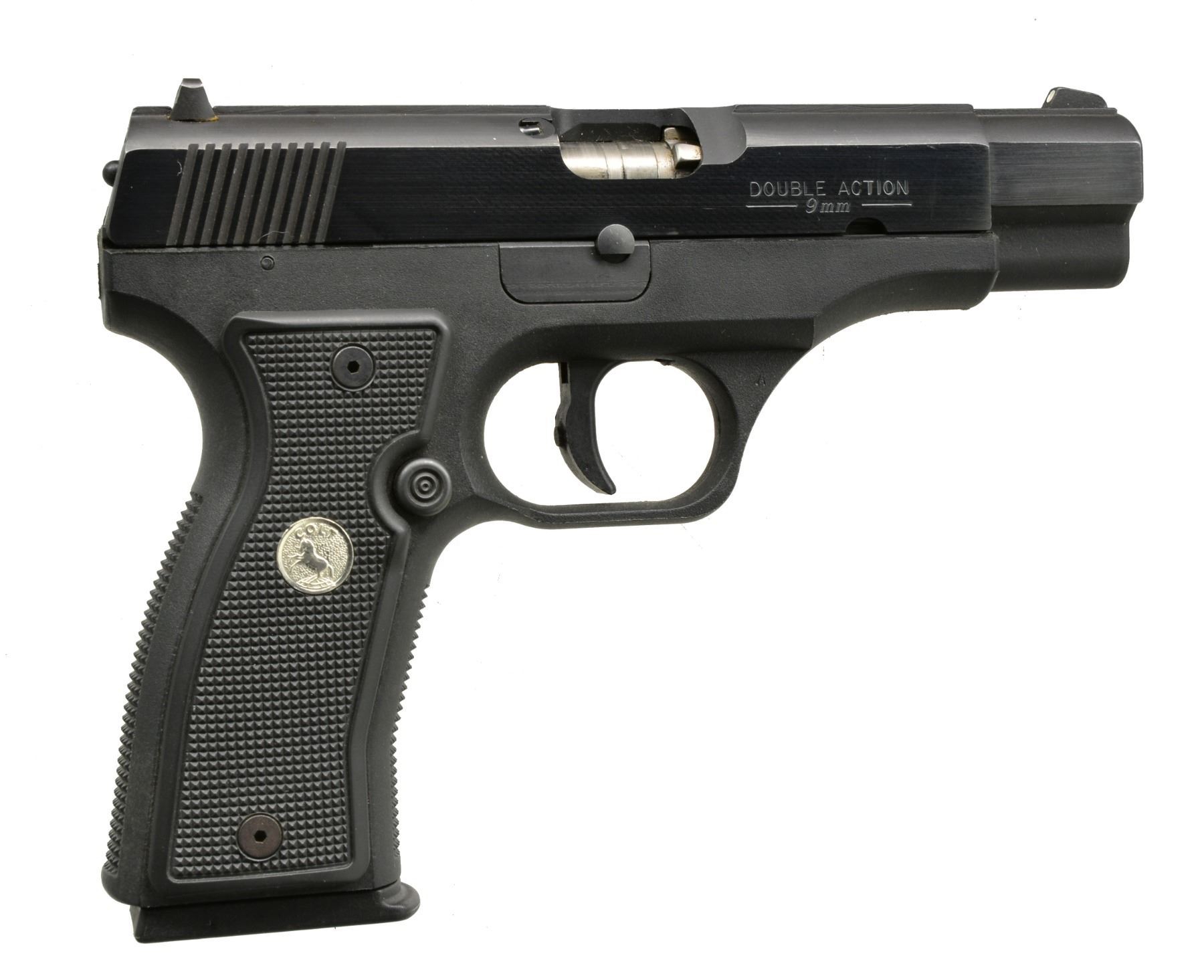 Cal. 9 mm Luger. S# PF04556. Bbl. 4 1/2". Blued slide. Matt finish receiver. 3 Dot sight system w/ fixed blade on front & drift adj. notch at rear. Dbl. action semi auto. Plastic grip w/ sliver colored Colt medallions. Stippled backstrap & front as well as sm. area of stippling on front of trigger guard. Currently set up w/ right side mag. release. Slide lock located on left side. MAGS: 1 factory 13 rd. CONDITION: bluing is complete & uniform on slide aside from a light thinning where there is mechanical relationship during operation. All aspects indicate very little usage w/out obvious holster wear. Shiny bore w/ strong rifling. (20-347/JZ). MODERN. $400-600.