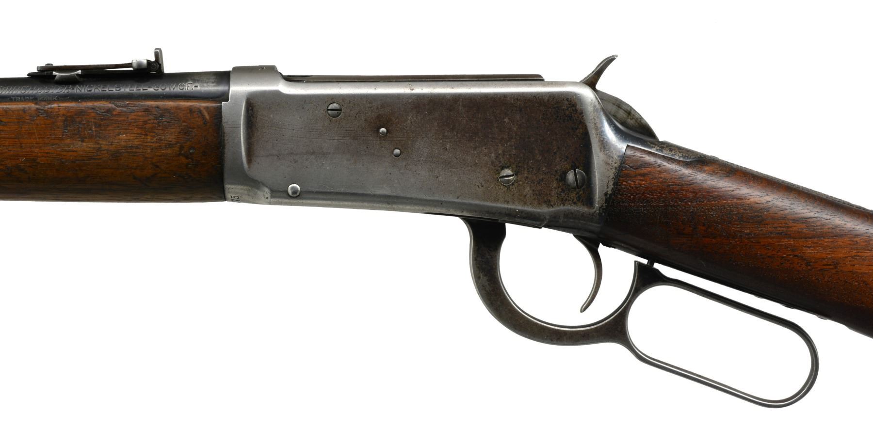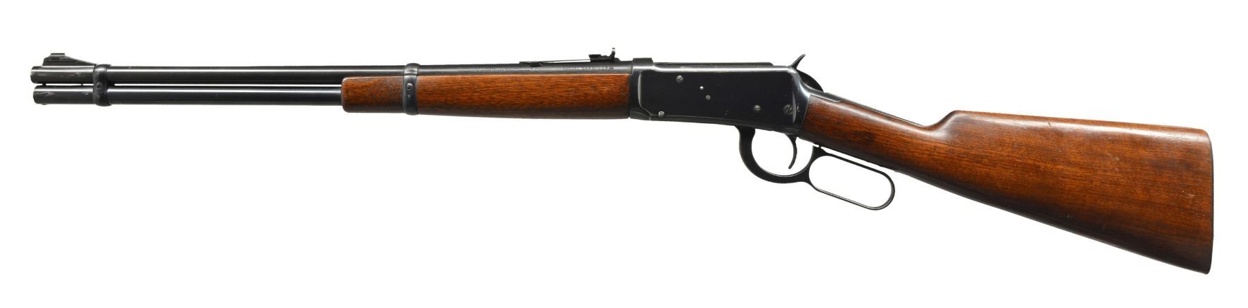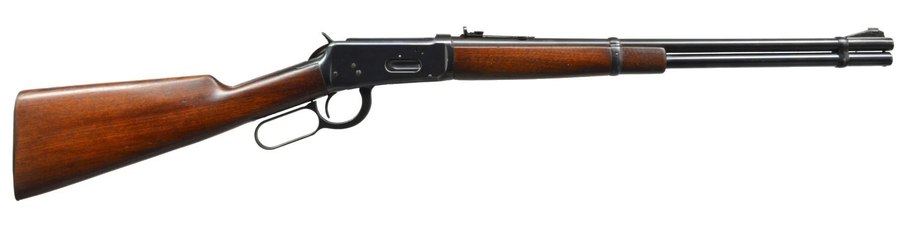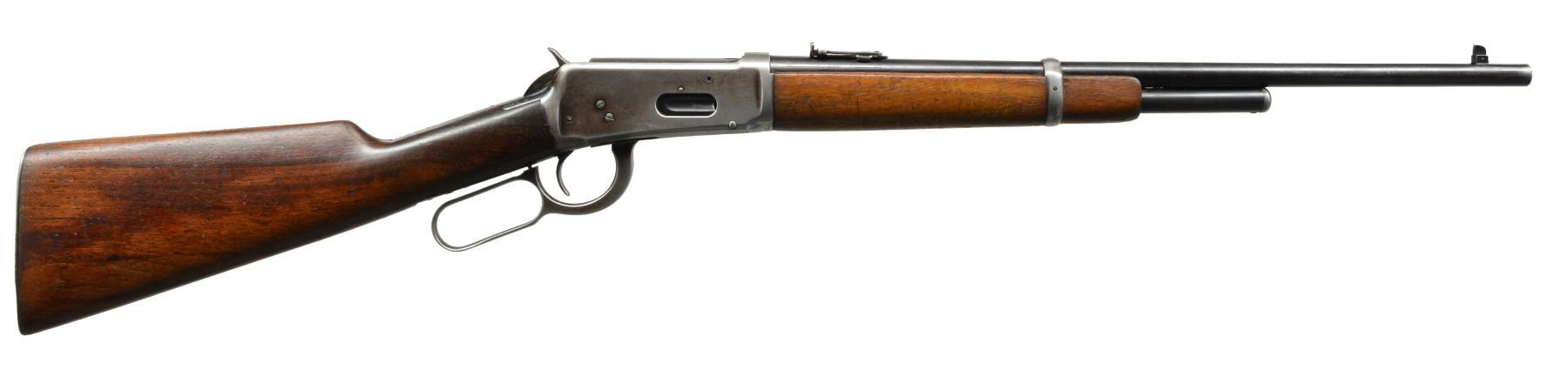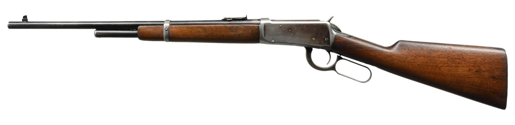 BOTH: cal. 30 WCF. Bbls. 20". 1) S# 1295247. Ramp mounted bead front sight w/ elevator adj. semi buckhorn rear sight. Full length mag. Blue finish. Longwood walnut forearm & straight grip stock w/ horizontal grooved steel buttplate. Mfg. during WWII era. CONDITION: 85% lightly worn blue showing edge wear & sm. scratches & spots of freckling. Stock has lightly worn finish showing numerous sm. scratches & handling marks. Bright bore w/ strong rifling. (20-283/DS). 2) S# 1019275. Pinned blade replacement front sight w/ folding leaf style carbine rear sight. 2/3 Length mag. Blue finish. Longwood forearm & straight grip walnut stock w/ horizontal grooved steel buttplate. Mfg. 1927. CONDITION: bbl. & mag. tube retain 70% dull fading blue. Action retains some flaking blue in protected areas w/ balance fading to gray. Stock & forearm have aged worn appearance w/ numerous scratches, gouges & handling marks. Bore retains sound rifling showing scattered light pitting near muzzle end. (20-284/DS). BOTH CURIO. $800-1,200.