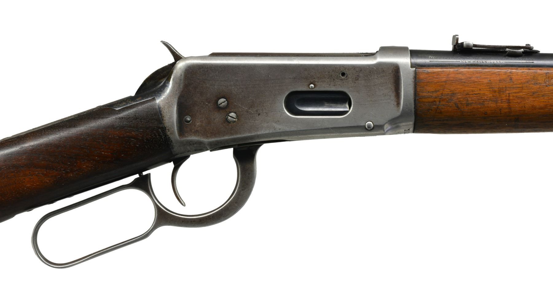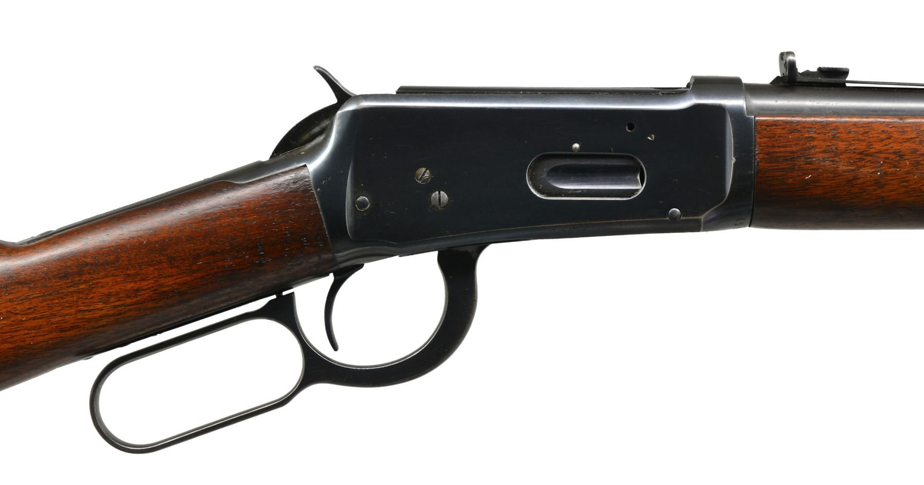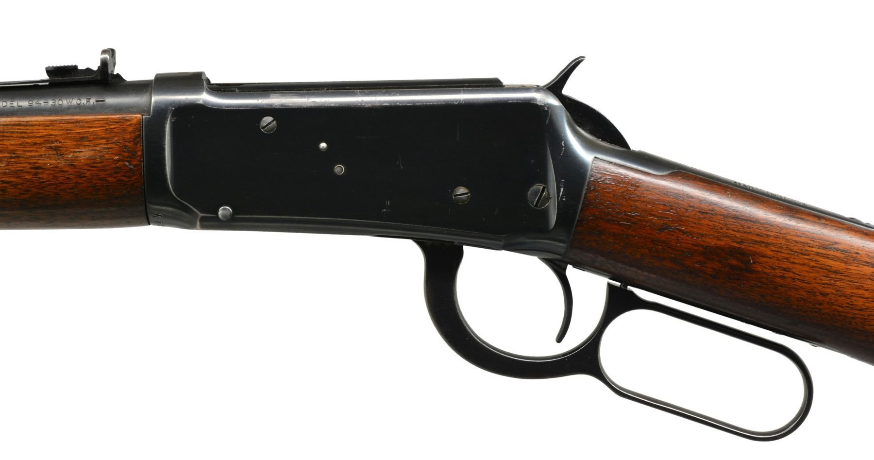 BOTH: cal. 30 WCF. Bbls. 20". 1) S# 1295247. Ramp mounted bead front sight w/ elevator adj. semi buckhorn rear sight. Full length mag. Blue finish. Longwood walnut forearm & straight grip stock w/ horizontal grooved steel buttplate. Mfg. during WWII era. CONDITION: 85% lightly worn blue showing edge wear & sm. scratches & spots of freckling. Stock has lightly worn finish showing numerous sm. scratches & handling marks. Bright bore w/ strong rifling. (20-283/DS). 2) S# 1019275. Pinned blade replacement front sight w/ folding leaf style carbine rear sight. 2/3 Length mag. Blue finish. Longwood forearm & straight grip walnut stock w/ horizontal grooved steel buttplate. Mfg. 1927. CONDITION: bbl. & mag. tube retain 70% dull fading blue. Action retains some flaking blue in protected areas w/ balance fading to gray. Stock & forearm have aged worn appearance w/ numerous scratches, gouges & handling marks. Bore retains sound rifling showing scattered light pitting near muzzle end. (20-284/DS). BOTH CURIO. $800-1,200.