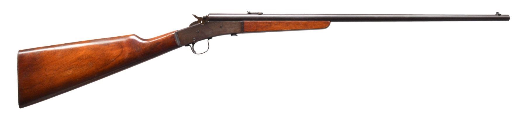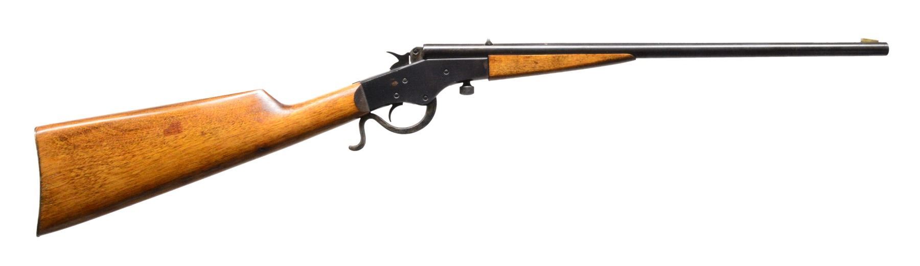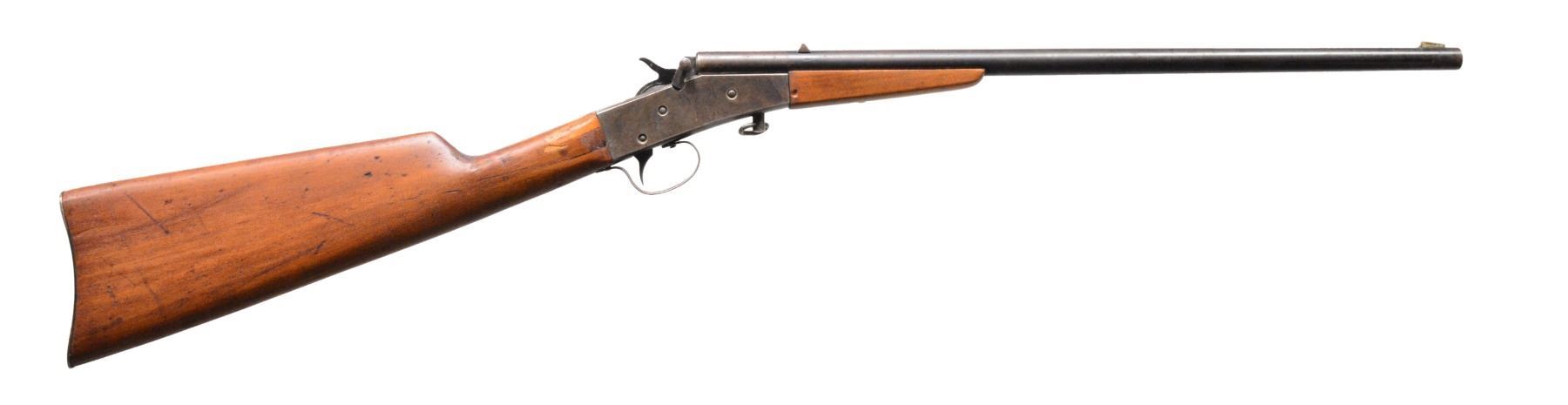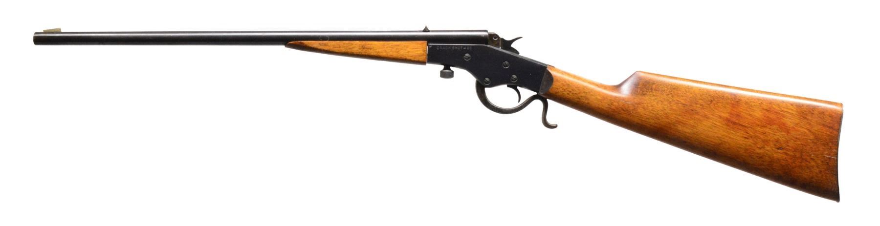 1) REMINGTON IMPROVED MODEL 6 ROLLING BLOCK. Cal. 22 S, L, LR. S# 507540. Bbl. 24" rnd. Blade front sight w/ elevation adj. V notch rear sight. Introduced in 1905, the Improved Model 6 featured a longer bbl., blued finish & heavier hardwood forearm & straight grip stock w/ steel buttplate. CONDITION: bbl. retains over 95% original blue. Action retains over 80% lightly faded blue showing scattered areas of discoloration. Original wood finish shows wear spots w/ scattered scratches & marks. Buttplate shows scattered light pitting. Bore is bright w/ strong rifling. (19-5744/DS). 2) STEVENS LITTLE SCOUT NO. 14 1/2. Cal. 22 LR. NSN. Bbl. 18" rnd. of takedown style. Blade front sight w/ fixed V notch rear sight. Case colored rolling block type action. Hardwood forearm & straight grip stock w/ steel buttplate. Mfg. 1911-1941. CONDITION: 70% dull lightly faded bbl. blue showing spots of darkening. Action retains 70% lightly faded blue showing case colors showing spots of corrosion. Wood is refinished showing scratches & handling marks. Stock is cracked through wrist area w/ plastic wood repair right of top tang. Bore is dark w/ worn rifling. (19-5756/DS). 3) STEVENS CRACK SHOT NO. 26. Cal. 22 LR. NSN. Bbl. 18" rnd. w/ German silver blade front sight & fixed V notch rear sight. Lever operated action w/ blue & case colored finish. Hardwood forearm & straight grip stock w/ steel buttplate. Mfg. 1912-1939. CONDITION: bbl. & action retain over 95% original blue showing a few sm. spots of corrosion. Hammer & lever retain 90% lightly faded case colors. Stock & forearm show scattered scratches & spots of darkening. Bore is generally bright w/ lightly worn rifling. (19-5762/DS). ALL CURIO. $600-1,000.