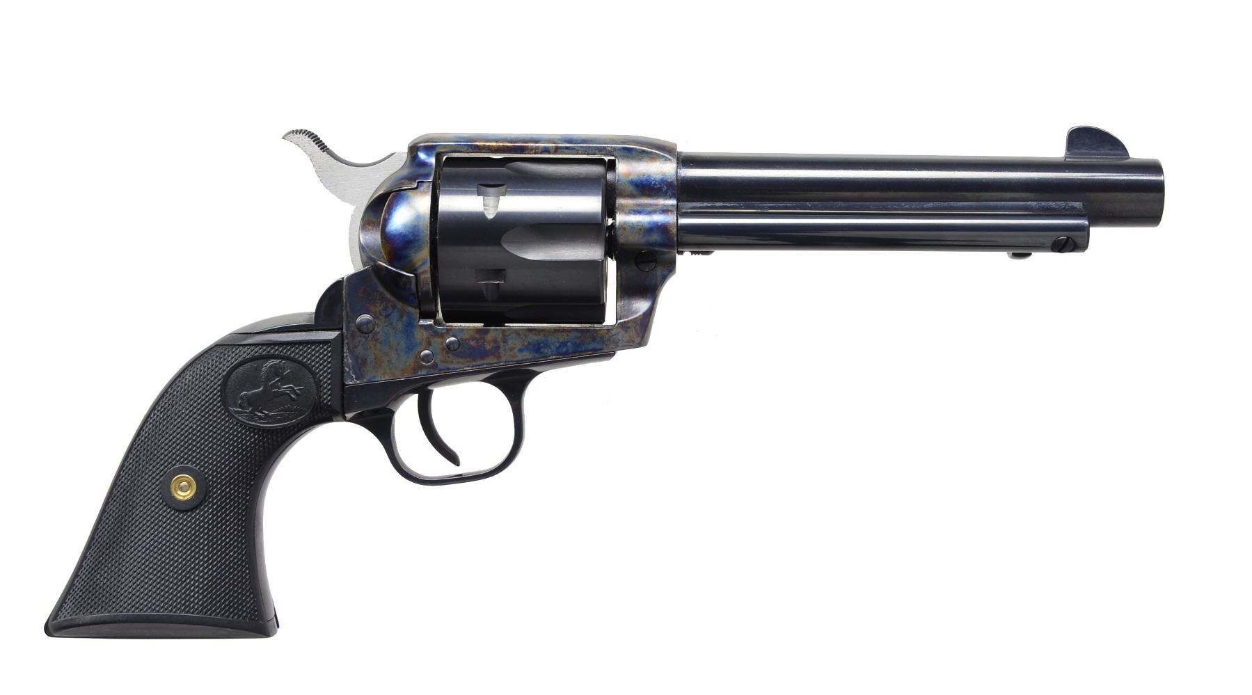 Cal. 45 Colt. S# TF00037. Bbl. 5 1/2" w/ blade front sight & square notched frame rear. Case colored frame & loading gate; balance blued having checkered black plastic grips w/ rampant Colt logo. Mfg. 2000 as special safety edition of SAA having transfer bar ignition. Steel offset ejector housing & half moon rod head. CONDITION: all aspects including bore near excellent; faint firing residue on cyl. face appearing test fired only. (20-1250/NW). MODERN. $600-850.