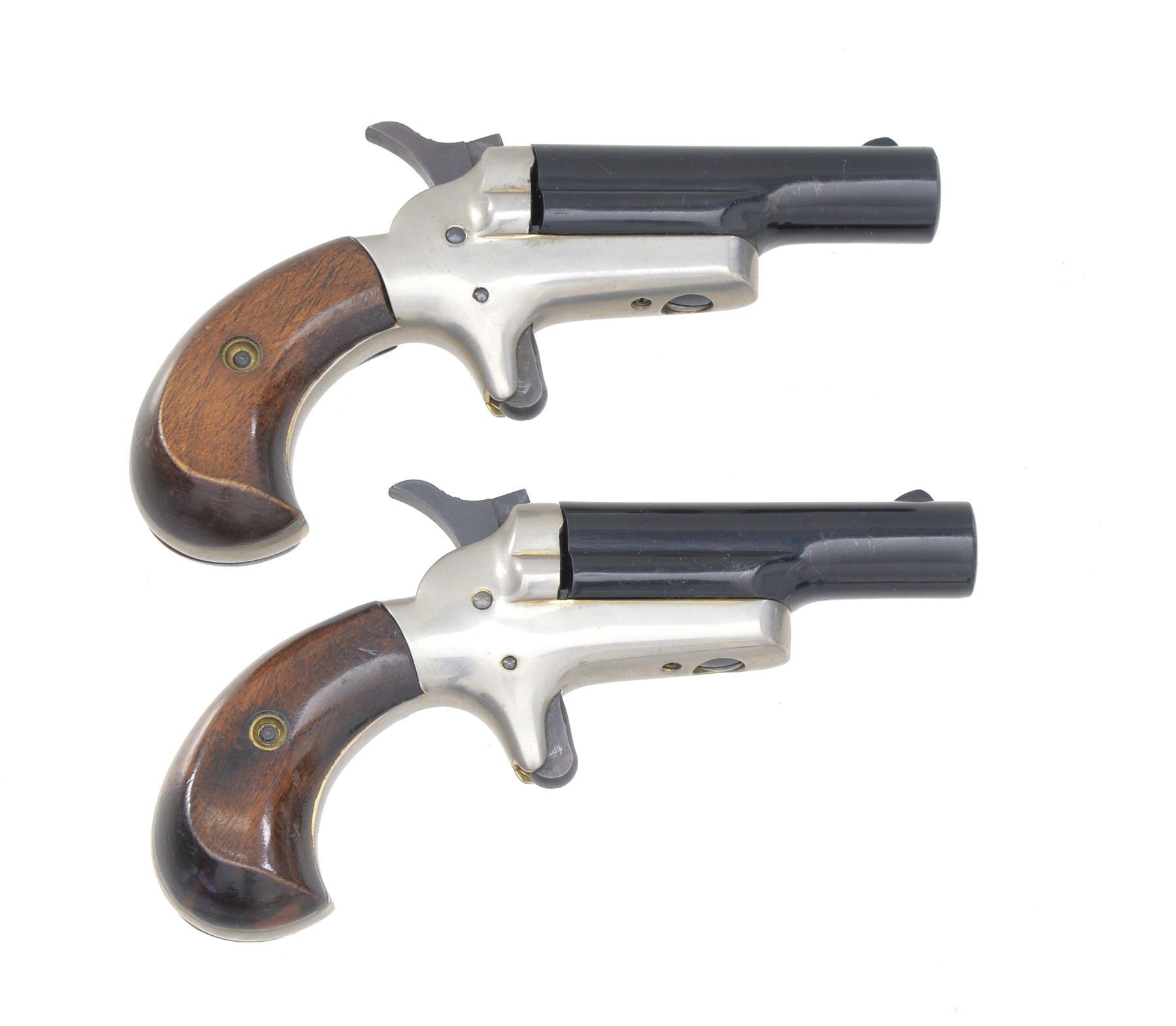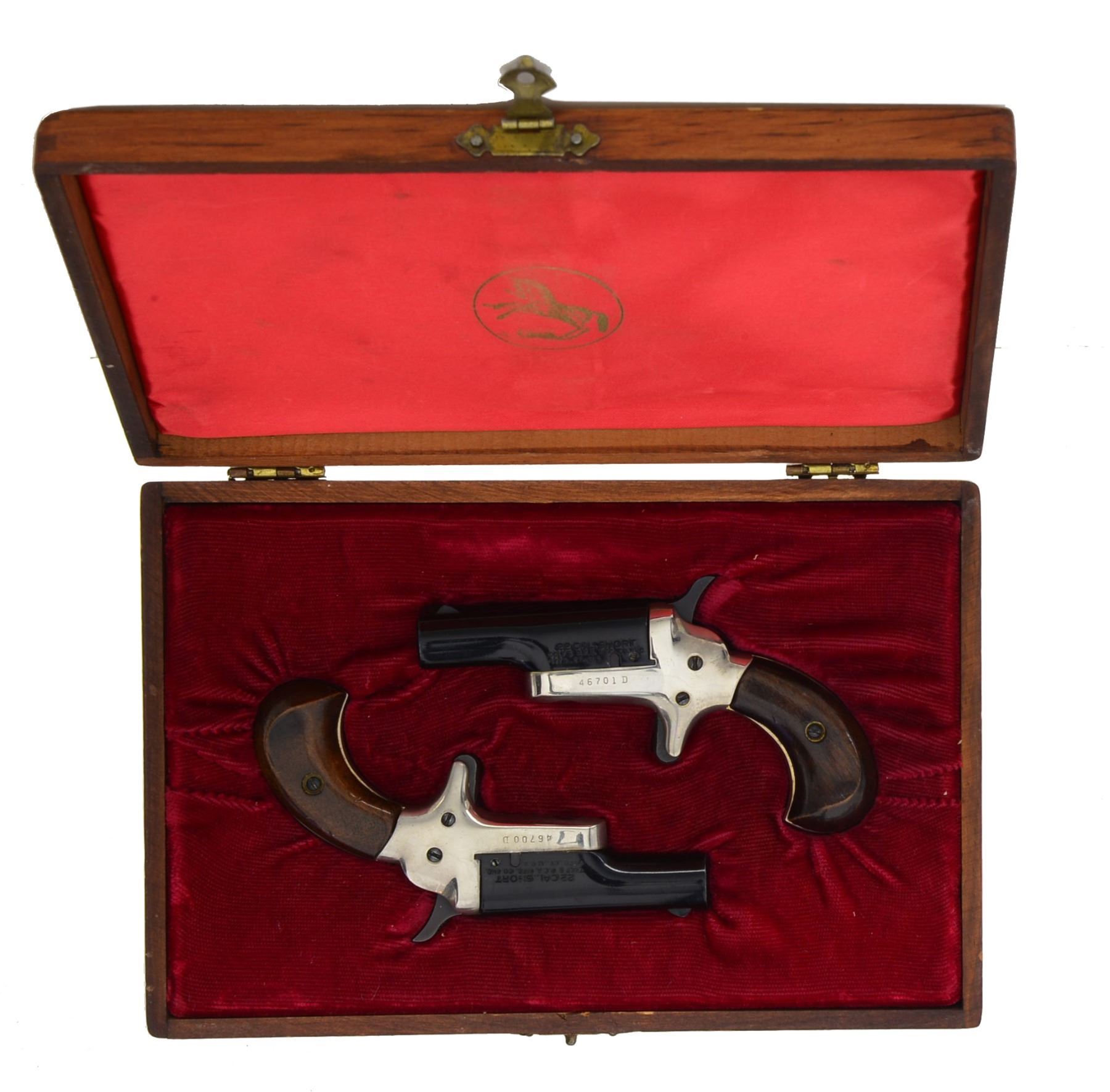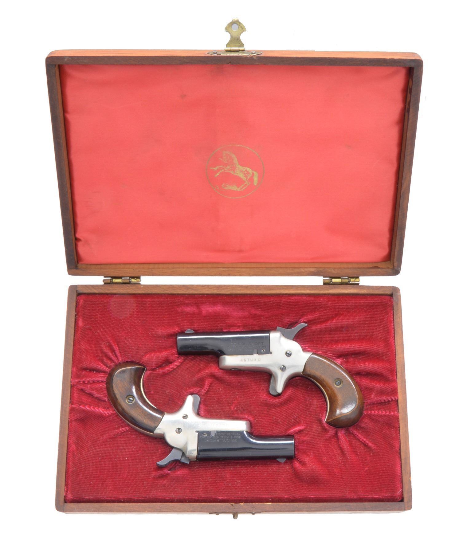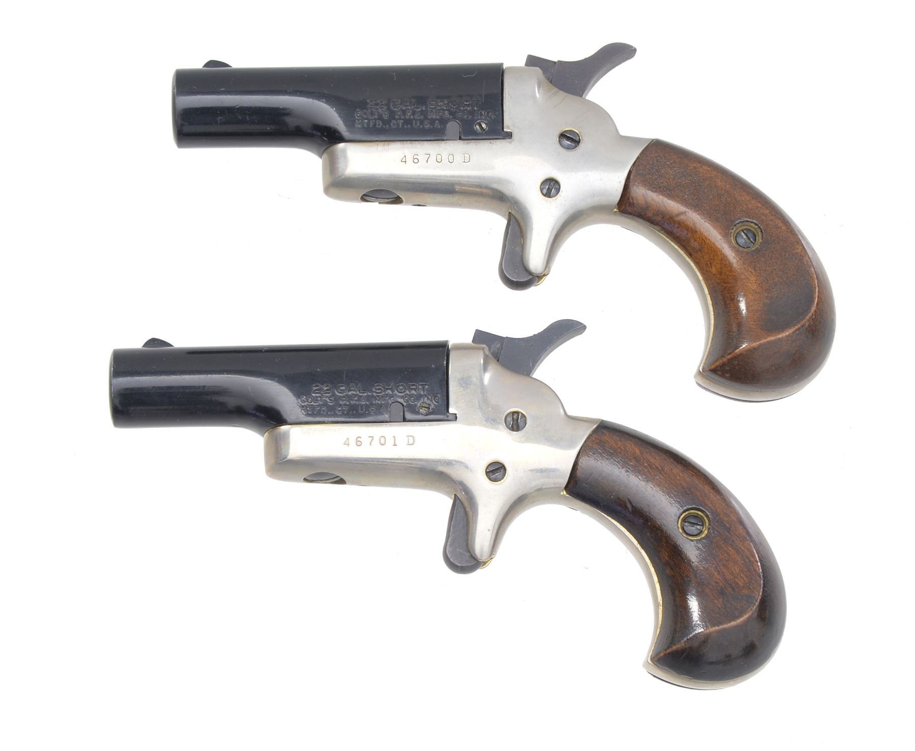 DERRINGERS. BOTH: cal. 22 Short RF. Bbl. 2 7/16" black chromed w/ blade sights. Mfg. 1960 (1959-1963) w/ nickeled frames & varnished walnut grips. Modern sm. cal. variation of Thuer 3rd Model. Backstraps of each machine engraved "L. H. Zemanek 1942". UNATTACHED ACCESSORIES: good Colt logo wood presentation case w/ satin Colt logo under lid & outlined corduroy base. Sealed bottle style bore brush. CONDITION: both very good having slightly dull appearance & near excellent bores. 1) S# 46700D. (20-449/NW). 2) S# 46701D. (20-450/NW). BOTH CURIO. $300-400.