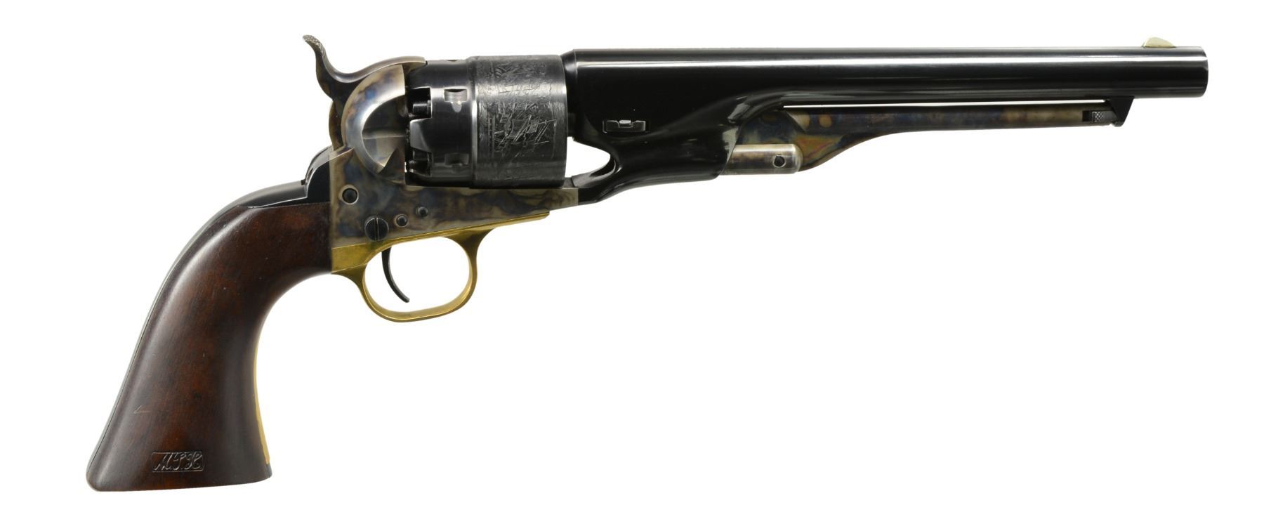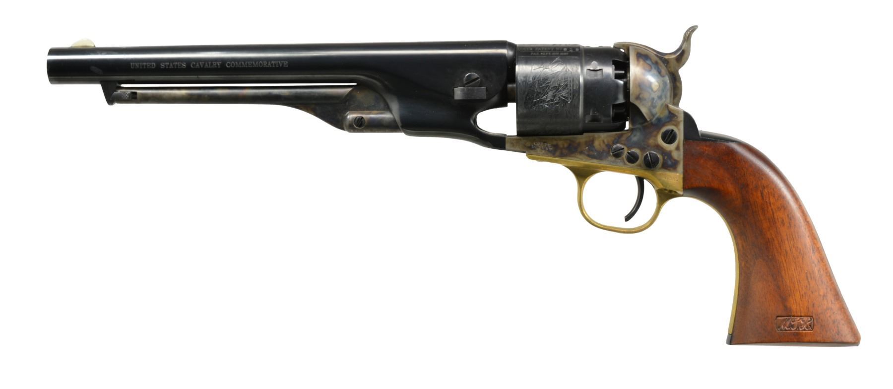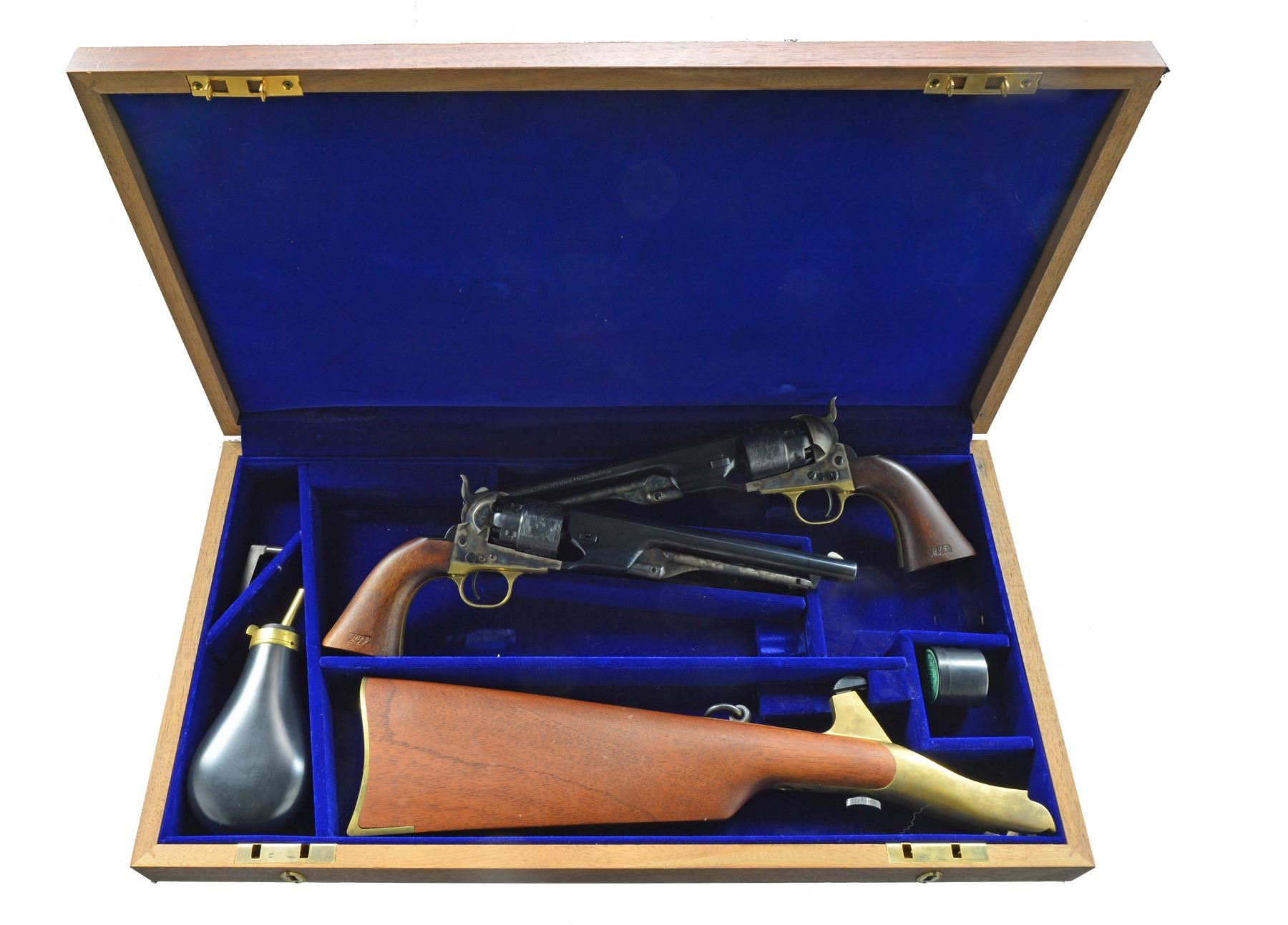1860 ARMY REVOLVERS W/ SHOULDER STOCK. BOTH: cal. 44. 1) S# 2315US. 2) S# US2315. A beautiful dbl. cased pair of model 1860 Colt percussion army revolvers w/ shoulder stock. This pair of armies & accompanying case plus accessories are like new retaining virtually all of their original case color & blue finish. Guns & casing marked "UNITED STATES CAVALRY COMMEMORATIVE", UNATTACHED ACCESSORIES: blue velvet lined case also houses reproduction. "Colts patent" cap tin & powder flask along w/ Colt L-Shaped gun tool & functioning key to case. 4 Page copy of brochure from Colt Industries offering suggestions on shooting included. CONDITION: extremely fine overall. Pistols retain virtually all of their blue & case finish, two cavity mold w/ screw cutter & Colts patent powder flask retain virtually all of their original finish, the shoulder stock is serial numbered to match the guns & has a couple tiny cosmetic blemishes in wood, iron hardware retains virtually all original blue, external casing has scattered scuffs & scrapes, mechanics & bore like new. (01-17413 & 01-17414/JS). BOTH ANTIQUE. $1,000-1,500.