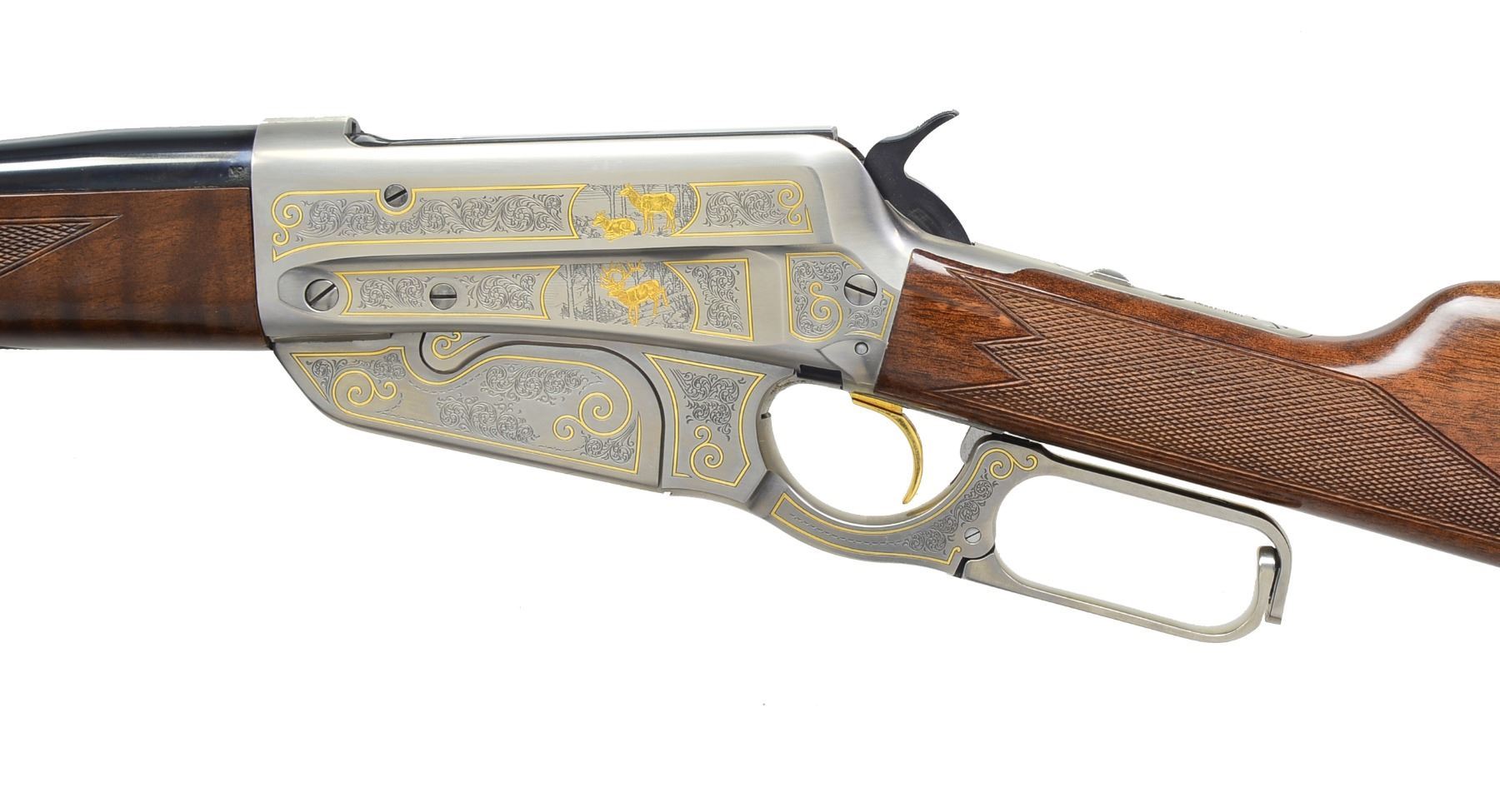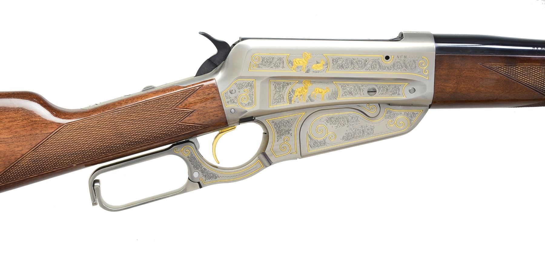 Cal. 30-06. S# NFH3790. Bbl. 24" w/ bead front sight & elevator adj. sporting rear sight. Grayed steel receiver featuring game scenes surrounded by vine type scroll engraving & gold lined borders, right side features scenes of big horn sheep, left side features scenes of elk. Schnabel tipped forearm & straight grip stock of gloss finished walnut w/ cut checkering & steel buttplate. Limited quantity of 1,000 mfg. 1984 only. CONDITION: retains over 99% wood & metal finish. Near excellent bore. (20-1226/DS). MODERN. $1,500-2,000.