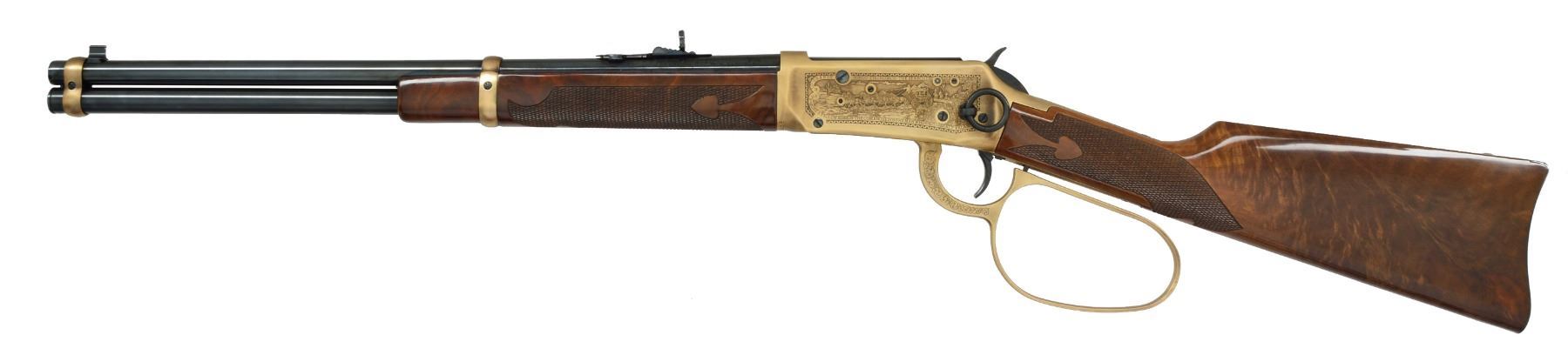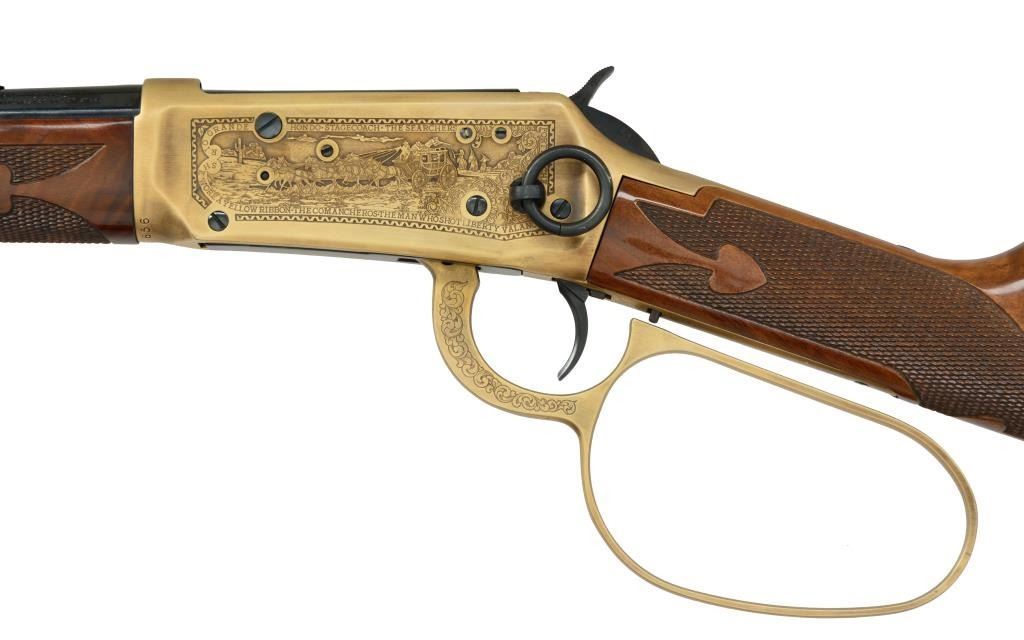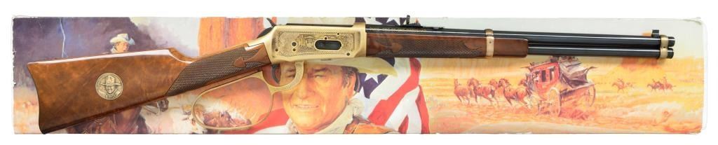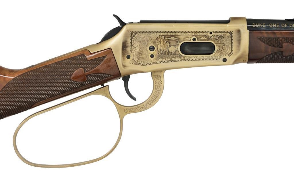 Cal. 32-40. S# DUKE656. Bbl. 18". Antique gold finished action w/ lg. loop lever & saddle ring featuring special John Wayne ornamentation. Bbl., mag. tube & carbine buttplate have high polish blue. Trapper style forearm & carbine stock of gloss finished fancy walnut w/ cut checkering having John Wayne medallion on right side of butt. Limited Edition of 1000 mfg. in 1981. UNATTACHED ACCESSORIES: original walnut display case w/ red velour fitted interior. Original foam lined box w/ special John Wayne decorative sheath containing instructions, registration card, service centers brochure & hang tag. Box cover shows some tattering at edges. CONDITION: near new & appears unfired. Receiver shows a few sm. marks. (18-905/DS). CURIO. $2,000-4,000.
