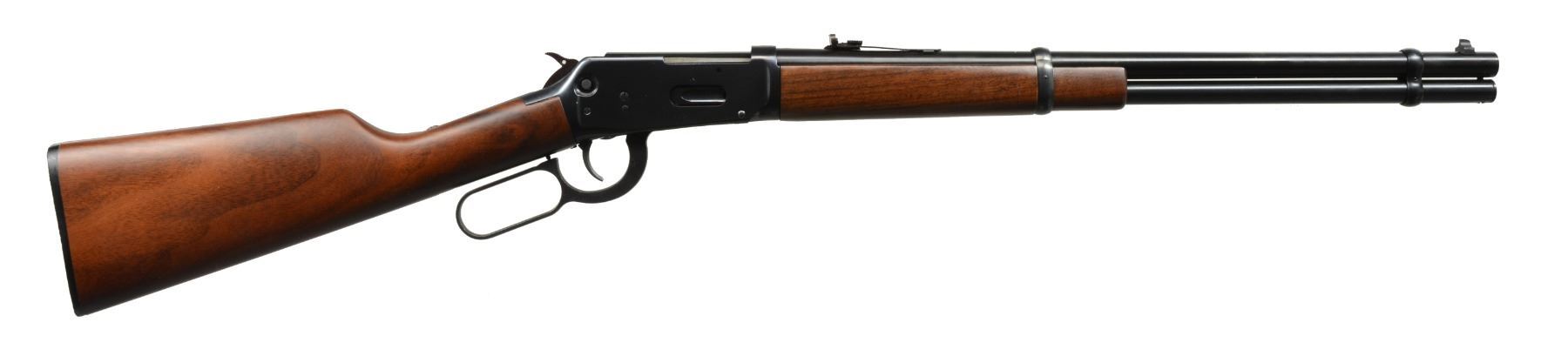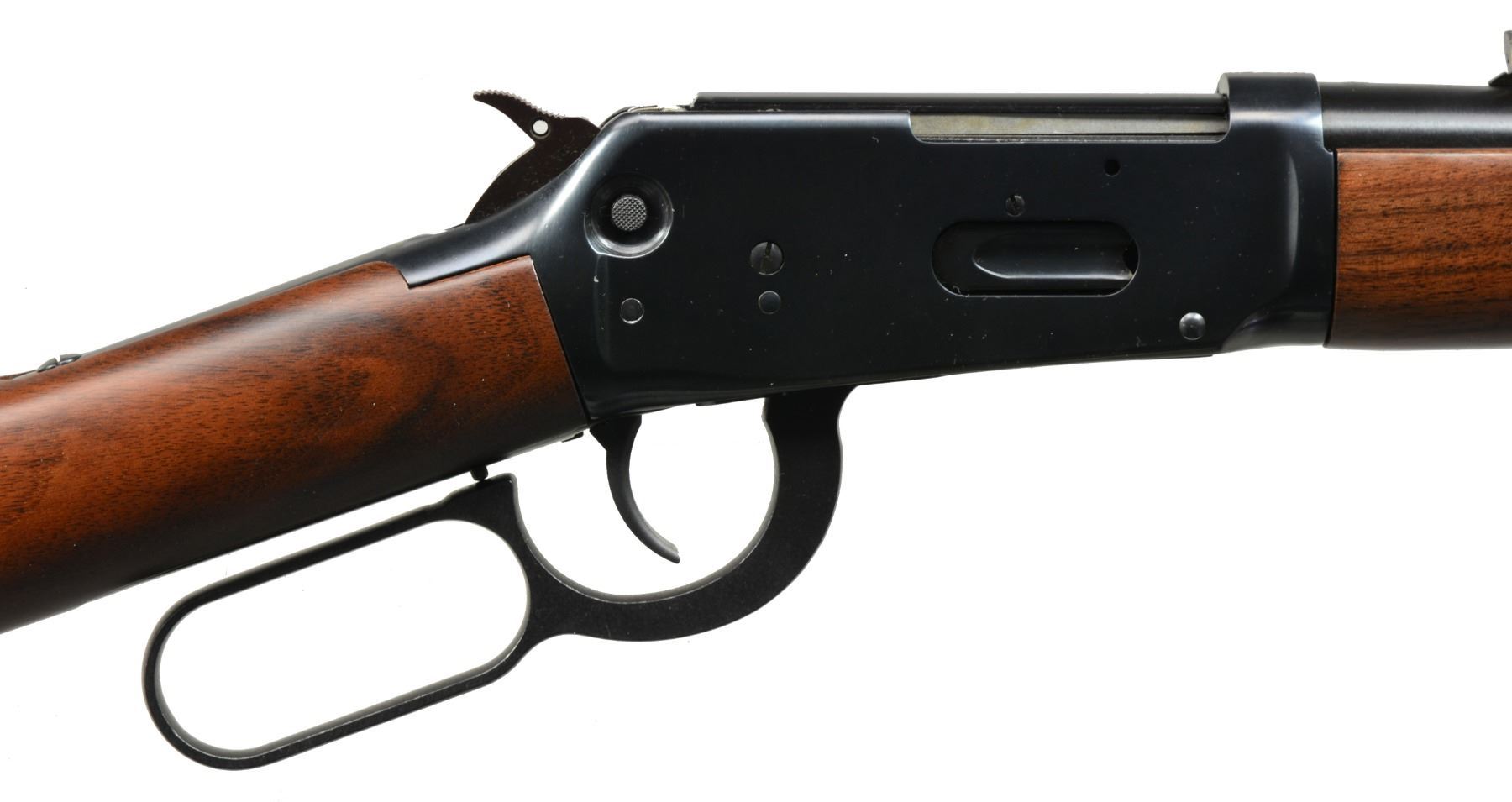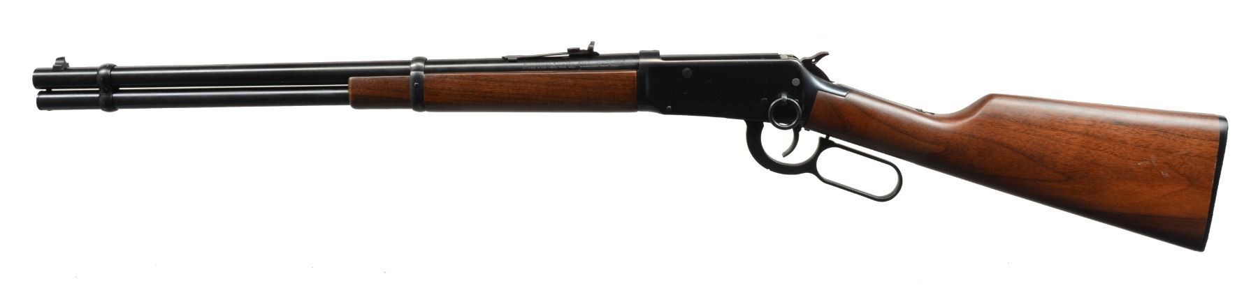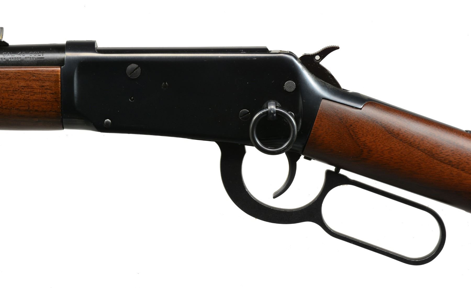 Cal. 45 Colt. S# 6445621. Bbl. 20" carbine style w/ sporting sights. Full length mag. Blued Angle Eject action w/ saddle ring & crossbolt safety. Longwood carbine forearm & straight grip satin finished walnut stock w/ plastic buttplate. Mfg. 1997-2006. UNATTACHED ACCESSORIES: foam lined box containing owner's manual, service center list & trigger lock. CONDITION: 99% blue. Forearm shows sm. handling marks. Near excellent bore. (20-1378/DS). MODERN. $800-1,100.
