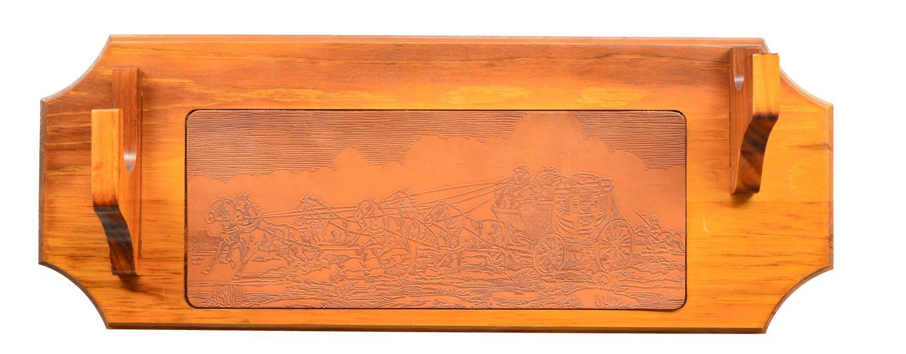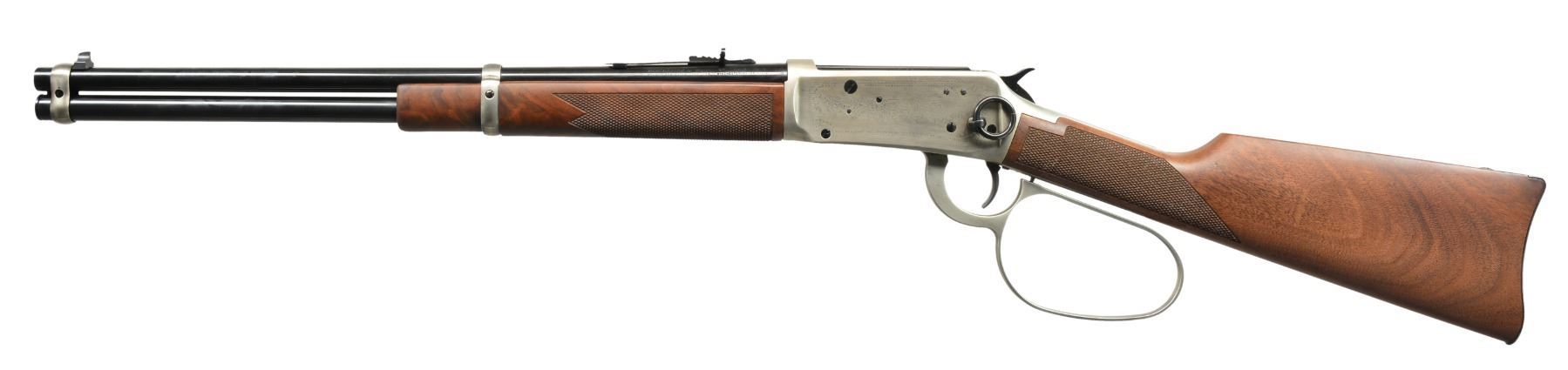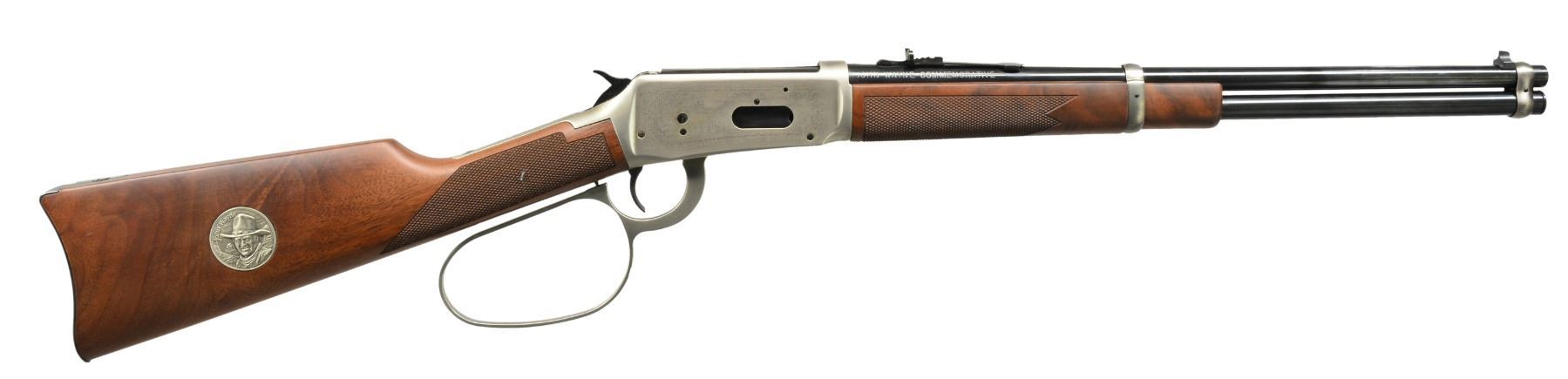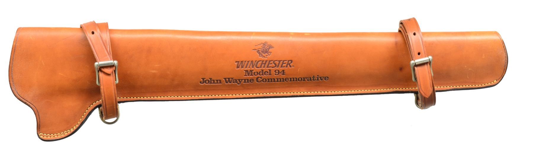 ACTION RIFLE WITH WALL RACK & SCABBARD. Cal. 32-40. S# JW188. Bbl. 18" w/ sporting sights. Bbl. bands & lg. lever loop action w/ saddle ring are pewter plated. Ornamentation consists of John Wayne & cattle drive scene on right side & stagecoach Indian chase scene on left side. Scenes are surrounded by names of John Wayne movies, foliate scroll & chain link borders. Right side of bbl. marked "JOHN WAYNE COMMEMORATIVE". Satin finished walnut carbine style stock & forearm. Right side of stock has pewter medallion w/ portrait of John Wayne. Limited Edition of 49,000 mfg. 1981. UNATTACHED ACCESSORIES: richly finished single gun wooden wall rack designed exclusively for the John Wayne carbine. A beautifully embossed leather stagecoach scene in set onto the rack face. Hand molded leather scabbard designed for the John Wayne carbine is embossed w/ the Winchester horse, rider & John Wayne markings. Foam box w/ decorative sleeve containing leather thong, instruction manual, hunter's pocket guide, special offer pamphlet, warranty card & hang tag. 1 Box of John Wayne 32-40 ammo. Sleeve is tattered on one end. CONDITION: near new in box appears unfired. (20-446/DS). CURIO. $1,750-2,250.