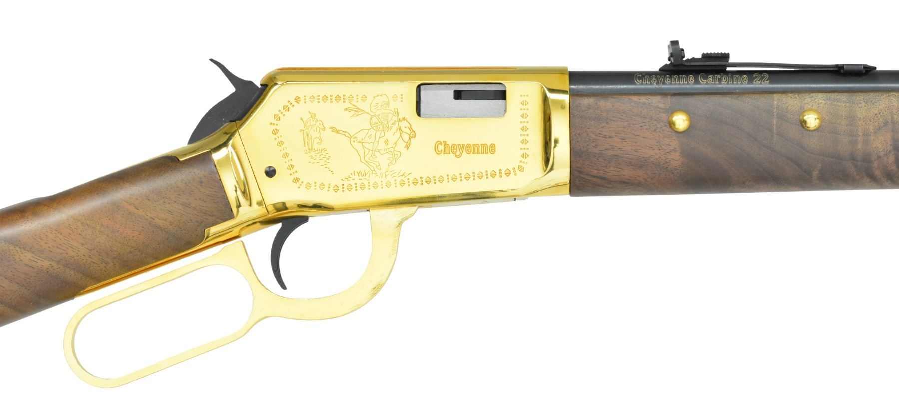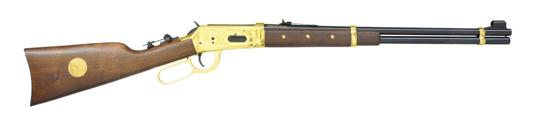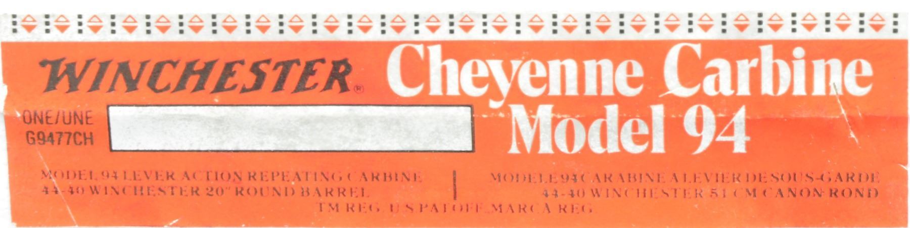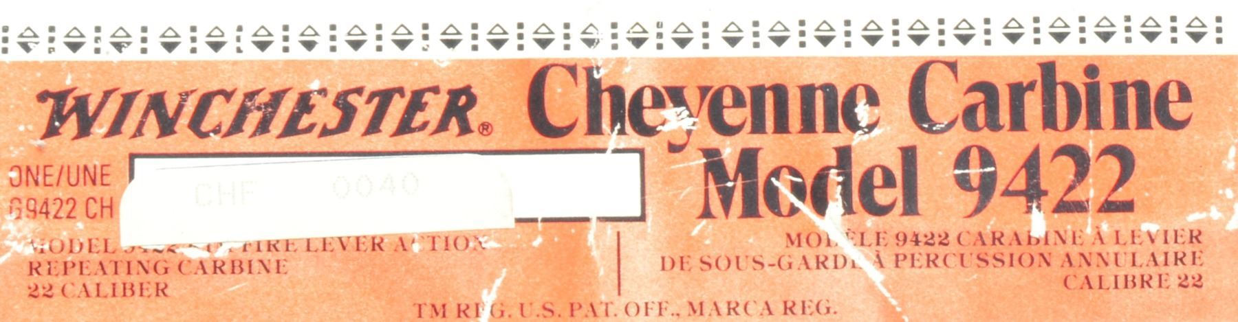 SET. Limited edition mfg. in 1977 for Canadian sales. Gold finished actions have special Indian themed ornamentation. Tubular mags. Hooded ramp bead front sights w/ sporting rear sights. Satin finished fancy walnut forearms & straight grip stocks. Forearms are ornamented w/ brass tacks & right side of stocks have medallions depicting a Cheyenne chief. 1) MODEL 94. Cal. 44-40. S# CH00040. Bbl. 20". Action is fitted w/ saddle ring & folding tang sight. Blued crescent steel buttplate. UNATTACHED ACCESSORIES: foam lined box w/ decorative sleeve containing instruction manual, hang tags, service papers & hunters pocket guide. Also includes a poster titled "CHEYENNE" by Ferrara. CONDITION: as new appears unfired. (19-5928/DS). 2) MODEL 9422. Cal. 22 S, L, LR. S# CHF0040. Bbl. 20 1/2". Receiver is grooved for tip off scope mts. Plastic buttplate. UNATTACHED ACCESSORIES: foam lined box containing saddle ring & leather thong. Box has decorative sleeve having tattered & torn ends. CONDITION: as new appears unfired. (19-5930/DS). BOTH CURIO. $1,400-2,000.