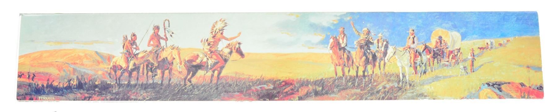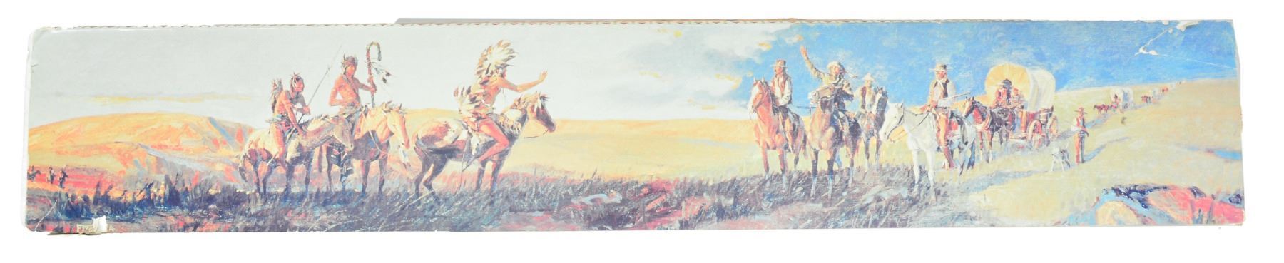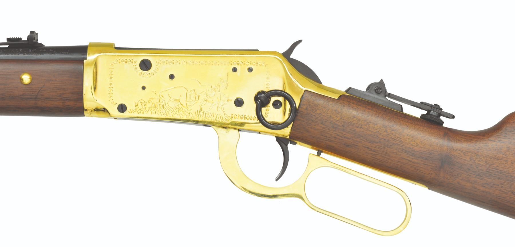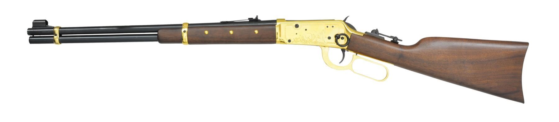 SET. Limited edition mfg. in 1977 for Canadian sales. Gold finished actions have special Indian themed ornamentation. Tubular mags. Hooded ramp bead front sights w/ sporting rear sights. Satin finished fancy walnut forearms & straight grip stocks. Forearms are ornamented w/ brass tacks & right side of stocks have medallions depicting a Cheyenne chief. 1) MODEL 94. Cal. 44-40. S# CH00040. Bbl. 20". Action is fitted w/ saddle ring & folding tang sight. Blued crescent steel buttplate. UNATTACHED ACCESSORIES: foam lined box w/ decorative sleeve containing instruction manual, hang tags, service papers & hunters pocket guide. Also includes a poster titled "CHEYENNE" by Ferrara. CONDITION: as new appears unfired. (19-5928/DS). 2) MODEL 9422. Cal. 22 S, L, LR. S# CHF0040. Bbl. 20 1/2". Receiver is grooved for tip off scope mts. Plastic buttplate. UNATTACHED ACCESSORIES: foam lined box containing saddle ring & leather thong. Box has decorative sleeve having tattered & torn ends. CONDITION: as new appears unfired. (19-5930/DS). BOTH CURIO. $1,400-2,000.