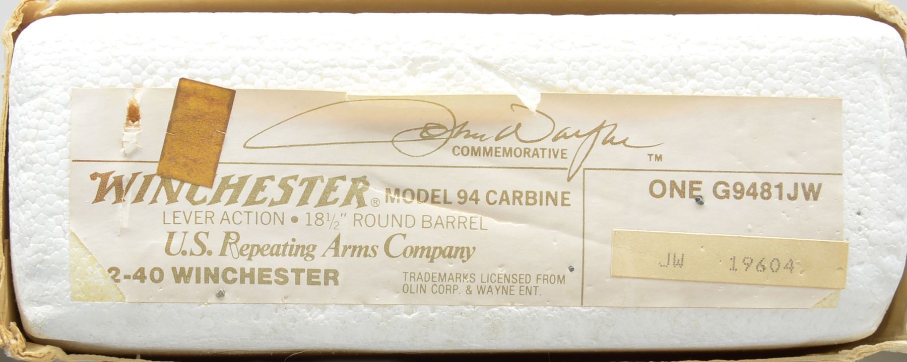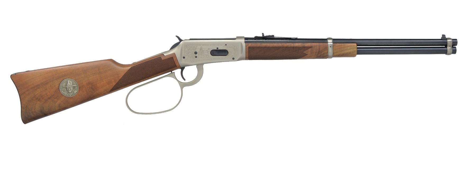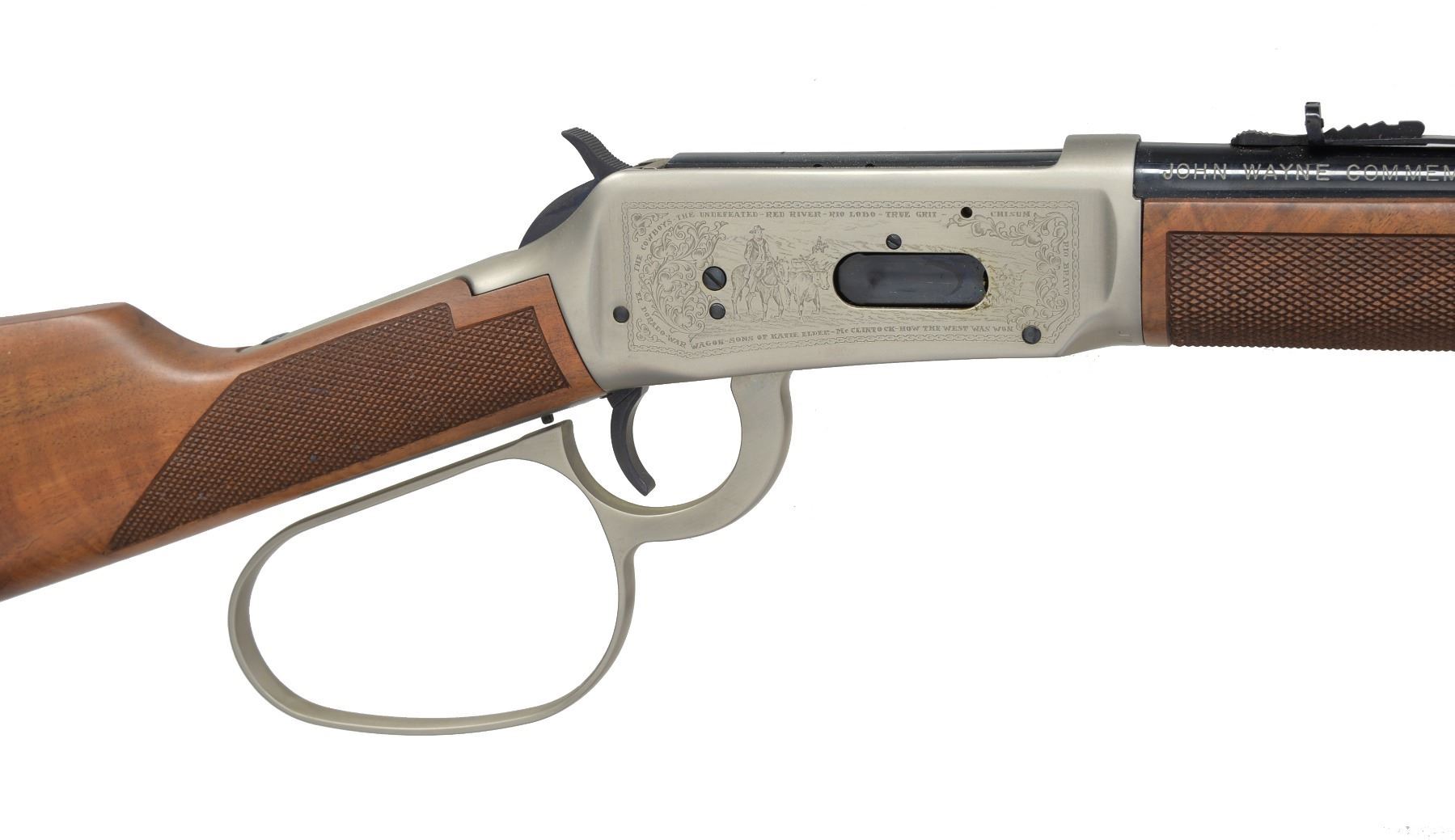ACTION RIFLE. Cal. 32-40. S# JW19604. Bbl. 18" w/ sporting sights. Bbl. bands & lg. lever loop action w/ saddle ring are pewter plated. Ornamentation consists of John Wayne & cattle drive scene on right side & stagecoach Indian chase scene on left side. Scenes are surrounded by names of John Wayne movies, foliate scroll & chain link borders. Right side of bbl. marked "JOHN WAYNE COMMEMORATIVE". Satin finished walnut carbine style stock & forearm. Right side of stock has pewter medallion w/ portrait of John Wayne. Limited Edition of 49,000 mfg. 1981. UNATTACHED ACCESSORIES: foam box w/ decorative sleeve containing instruction manual, special offer pamphlet, service center pamphlet, leather thong & hang tag. 1 Box of John Wayne 32-40 ammo. CONDITION: near new in box appears unfired. (20-445/DS). CURIO. $1,200-1,800.