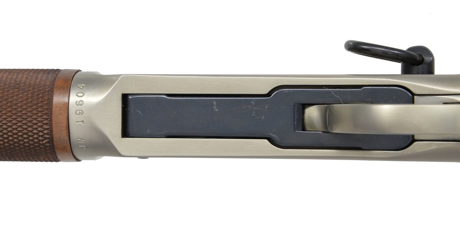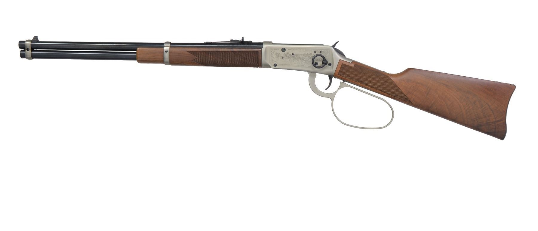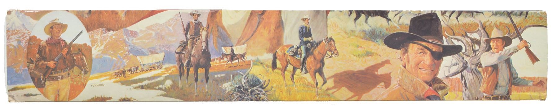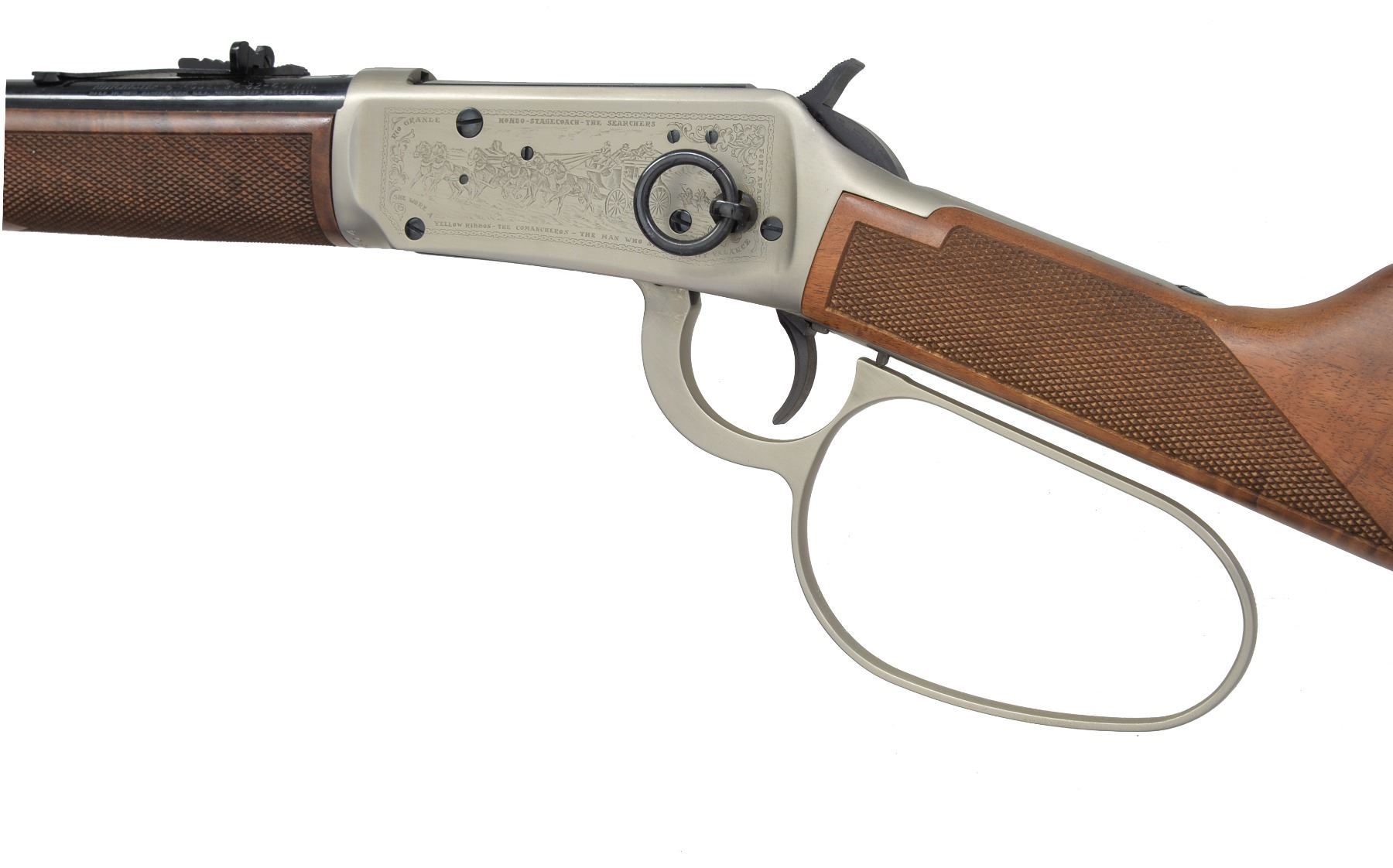ACTION RIFLE. Cal. 32-40. S# JW19604. Bbl. 18" w/ sporting sights. Bbl. bands & lg. lever loop action w/ saddle ring are pewter plated. Ornamentation consists of John Wayne & cattle drive scene on right side & stagecoach Indian chase scene on left side. Scenes are surrounded by names of John Wayne movies, foliate scroll & chain link borders. Right side of bbl. marked "JOHN WAYNE COMMEMORATIVE". Satin finished walnut carbine style stock & forearm. Right side of stock has pewter medallion w/ portrait of John Wayne. Limited Edition of 49,000 mfg. 1981. UNATTACHED ACCESSORIES: foam box w/ decorative sleeve containing instruction manual, special offer pamphlet, service center pamphlet, leather thong & hang tag. 1 Box of John Wayne 32-40 ammo. CONDITION: near new in box appears unfired. (20-445/DS). CURIO. $1,200-1,800.
