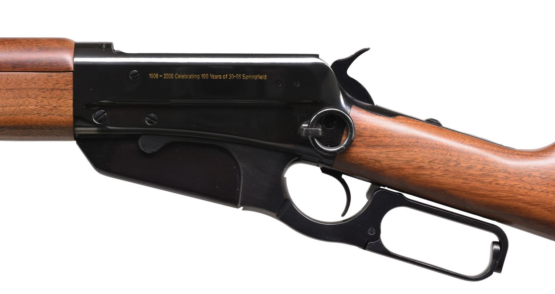ACTION SRC. Cal. 30-06. S# 00302MT95M. Bbl. 22". Left side of receiver has gold filled marking "1906 - 2006 Celebrating 100 Years of 30-06 Springfield". Blue finish. Action features slide top tang safety & saddle ring on left side. Brass pinned blade front sight w/ military style ladder rear sight. Grooved walnut forearm, hand guard & straight grip stock w/ trapdoor steel buttplate have satin finish. UNATTACHED ACCESSORIES: original red 2 piece box containing instructions, safety brochure, offer cards & trigger lock. CONDITION: near new, appears unfired. (20-141/DS). MODERN. $1,000-1,500.