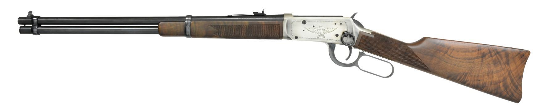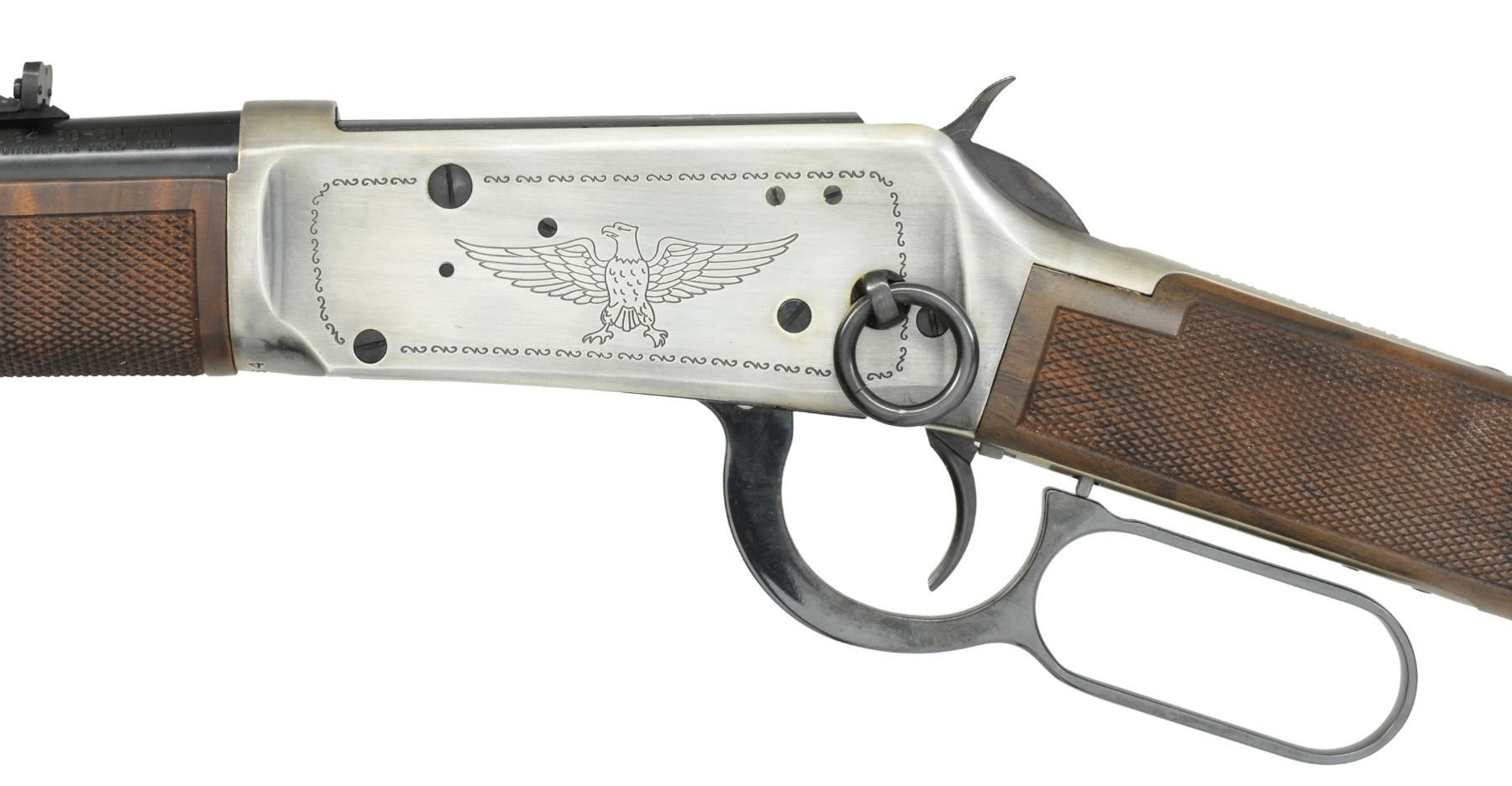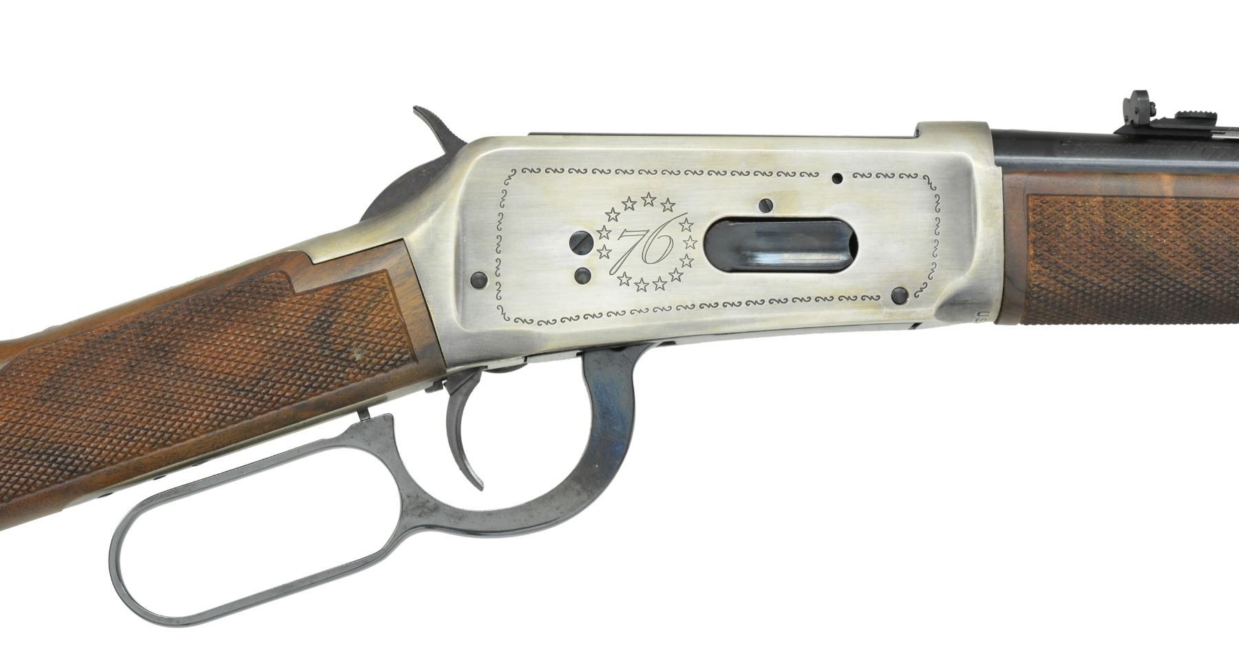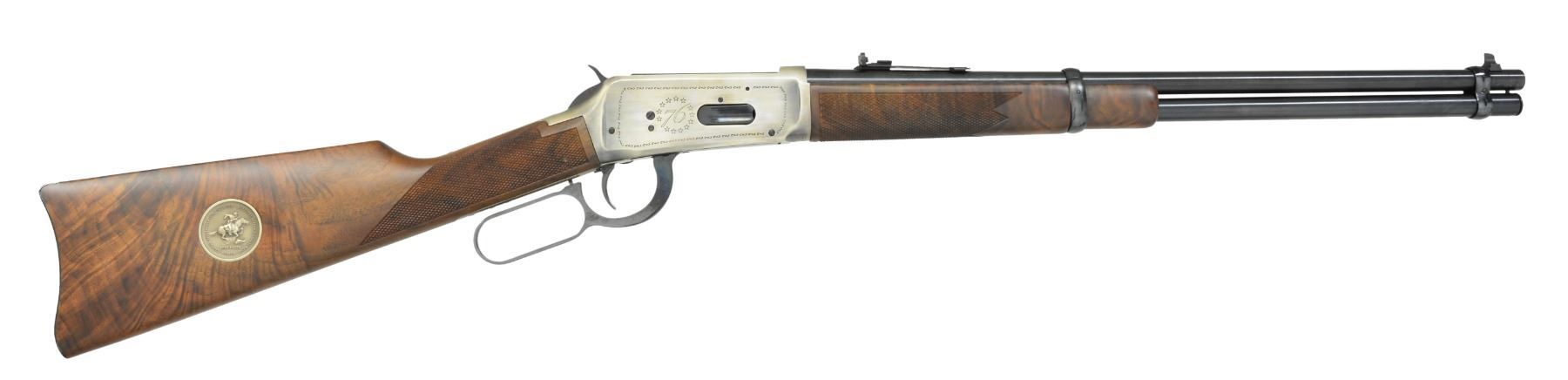 CARBINE. Cal. 30-30. S# USA64. Bbl. 20" w/ blade front sight & elevator adj. rear sight. Antique silver finished action w/ saddle ring has American eagle on left side w/ "76" circled by stars on right side. Satin finished carbine stock & forearm of fancy black walnut w/ cut checkering. Right side of stock has Winchester Horse & Rider Bicentennial medallion. Limited edition of 19,999 mfg. in 1976, the US Bicentennial year. UNATTACHED ACCESSORIES: foam lined box w/ decorative sleeve. CONDITION: as new w/ box. (19-5929/DS). CURIO. $500-800.