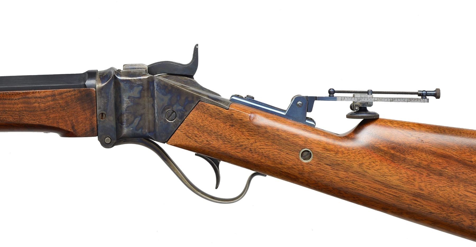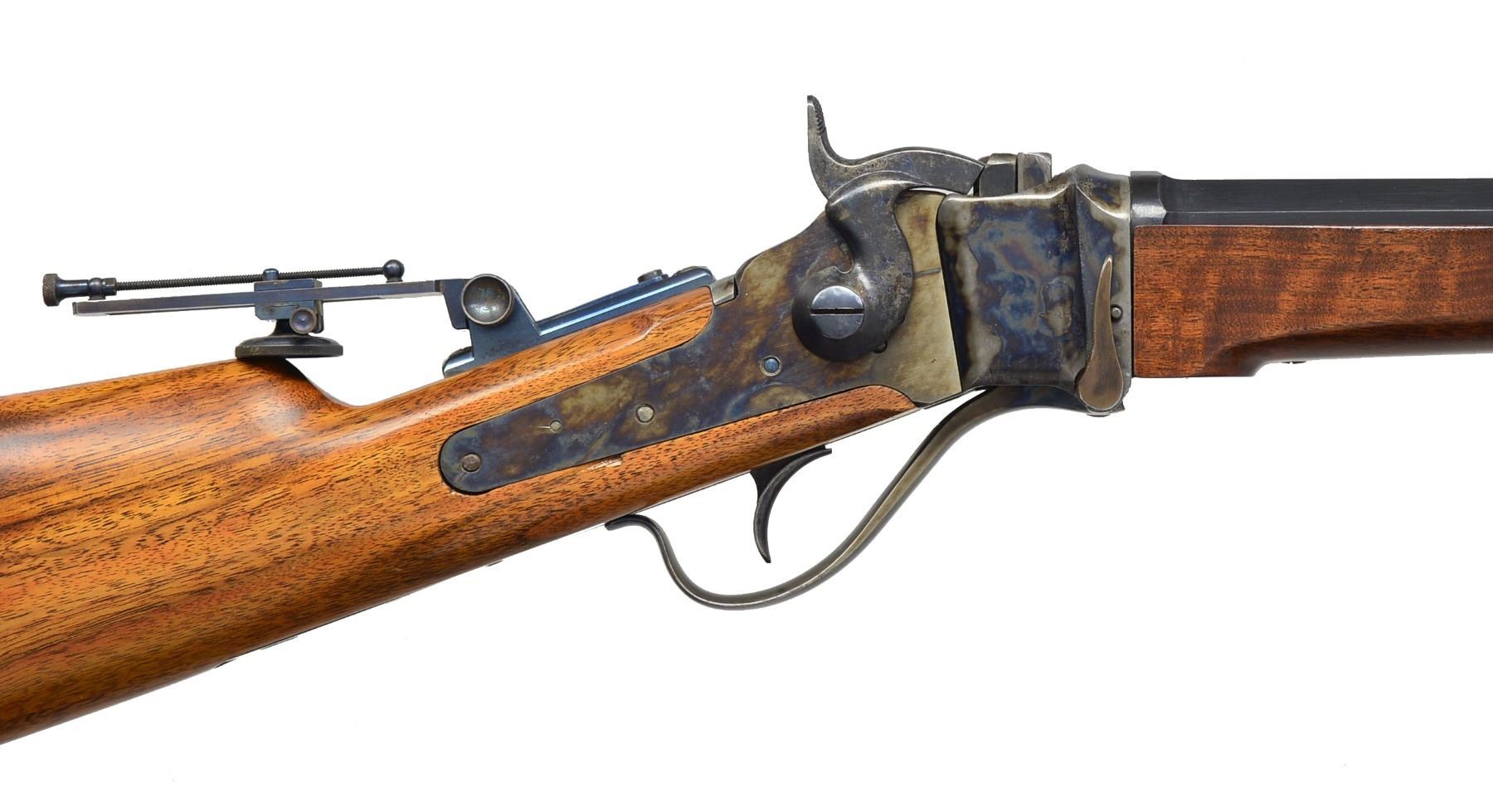 Cal. 45-70. S# 004. Bbl. 30" oct. Top flat is marked "OLD RELIABLE" & "SHARPS RIFLE CO. BRIDGEPORT, CONN.". Case colored action. Top tang is marked "ROCKY MT. ARMORY / COLORADO SPGS CO". Win. gauge globe front sight, open rear dovetail & mid-range Vernier tang sight. Walnut forearm & straight grip stock w/ steel buttplate. UNATTACHED ACCESSORIES: optional long range sight staff. CONDITION: bbl. & action retain over 98% original finish. Stocks show a few sm. handling marks. Bright bore w/ strong rifling. (20-1227/DS). MODERN. $1,400-1,900.