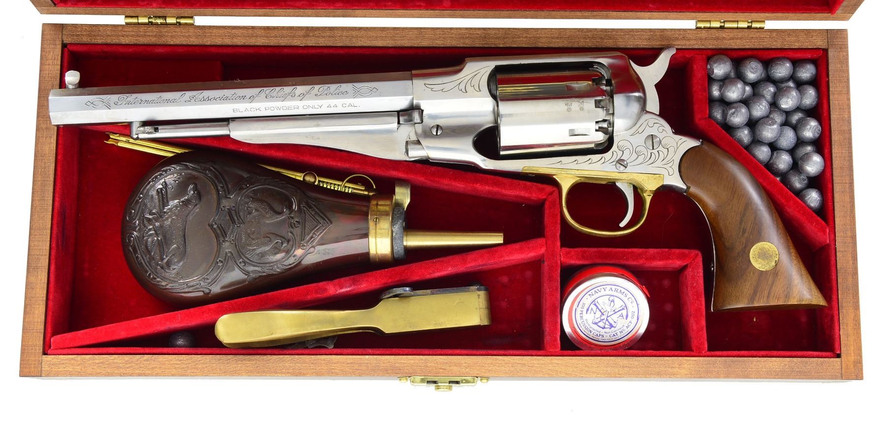 NEW MODEL REVOLVER. Cal. 44. S# 0898. Bbl. 7 3/4" oct. w/ blade front sight. Reproduction of Rem. New Model revolver. 6 Shot fluted cyl., stainless steel construction w/ trigger guard. 2 Piece walnut grips. Left bbl. marked "INTERNATIONAL ASSOCIATION OF CHIEFS OF POLICE". Right bbl. flat has date of "1981". Action has open pattern scroll ornamentation. Butt is marked "IACP 0898 OF 1000". Left grip panel has gold medallion w/ IACP crest. Mfg. in Italy by Navy Arms. UNATTACHED ACCESSORIES: hardwood presentation box w/ red velour fitted interior having IACP label in lid. Top of lid has IACP crest. Box contains powder flask, 2 cavity bullet mold, inline capper, cap tin, rnd. balls, instructions & box labels. CONDITION: stainless finish shows scattered light scratches & marks. Bore is bright w/ strong rifling. (01-17438/DS). ANTIQUE. $200-300.