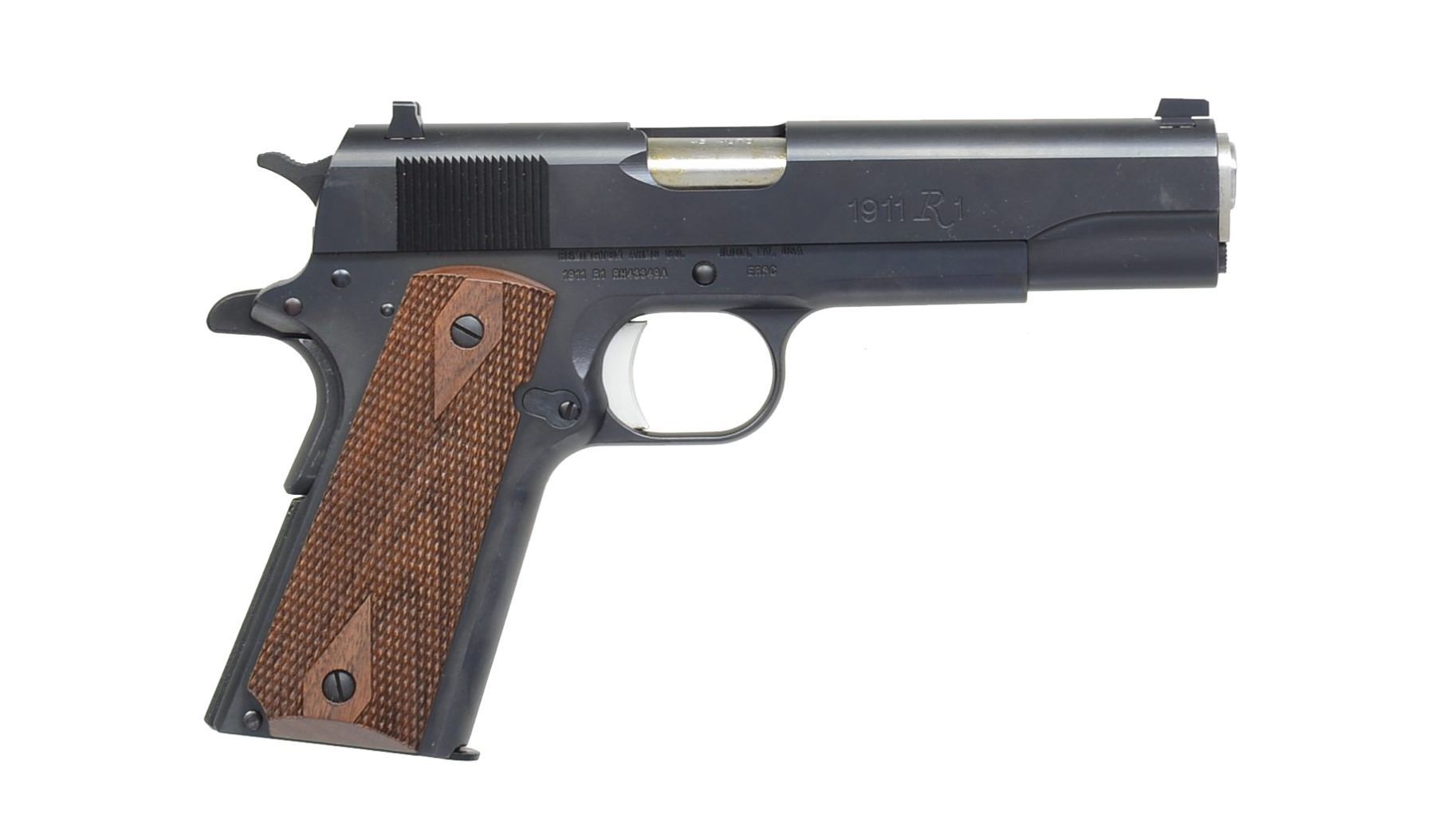 Cal. 45 ACP. S# RH43349A. Bbl. 5" throated satin stainless. Mfg. 2010 to date w/ appearance of vintage 1911 A1 but w/ modern improvements. Dovetailed 3 dot high profile sight set. Grooved flat mainspring housing, short reach grooved aluminum trigger plus flared & lowered ejection port. Checkered dbl. diamond walnut grips. MAGS: 4 total; near excellent (unless noted) blued 7 rd.; 2 factory Remington, 1 aftermarket w/ rnd. top follower & base marked "COLT / 45 AUTO" plus slightly used military contract numbered. UNATTACHED ACCESSORIES: factory green plastic case & packaging to include bushing wrench. CONDITION: all aspects near excellent including bore; new unfired appearance. (20-1353/NW). MODERN. $450-600.