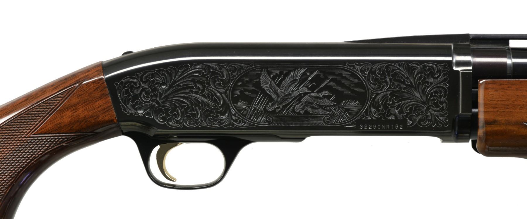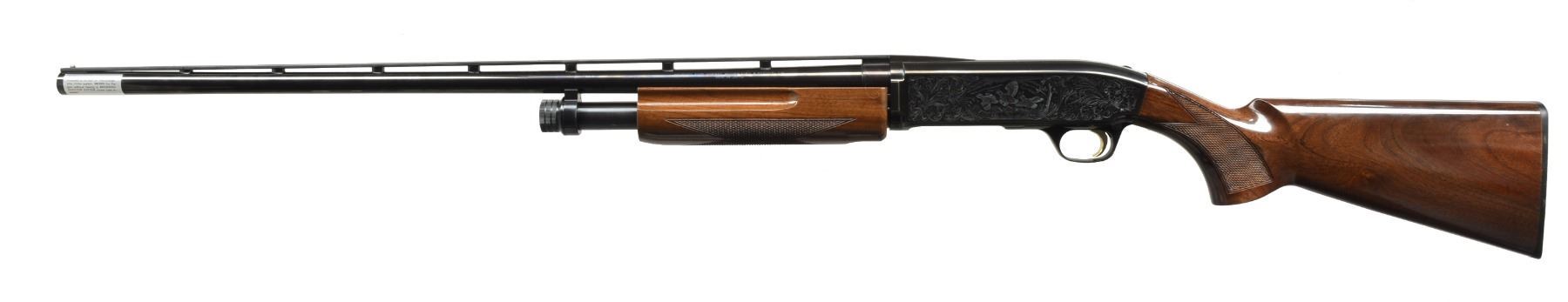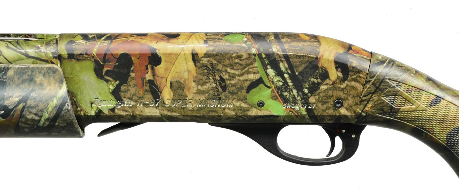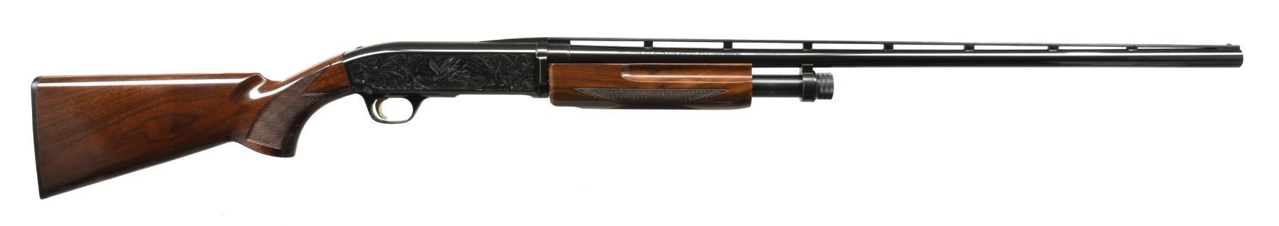 1) BROWNING BPS PUMP. Cal. 20 Ga., 3". S# 32260NR162. Bbl. 28" VR w/ Invector-Plus choke; IC. tube included. Blued steel action w/ scroll ornamentation surrounding vignettes of mallards on right side & quail on left side. Sliding top safety. Gold finished trigger. Forearm & pistol grip stock of gloss finished walnut w/ cut checkering & original buttplate. CONDITION: near excellent retaining over 98% blue. Stock shows a few sm. scratches & marks. Near excellent bore. (20-1373/DS). 2) REMINGTON 11-87 SUPER MAG AUTOLOADING. Cal. 12 Ga., 3 1/2". S# SM061727. Bbl. 27 3/4" VR w/ steel front & mid beads. Bbl. is fitted for Remchokes; Full, Mod., IC & Skeet tubes included. Bbl., action & synthetic stocks have Mossy Oak Obsession camouflage finish. Features include swivel bases & Remington marked Limbsaver pad. UNATTACHED ACCESSORIES: original box containing padded camo sling, owner's manuals, spare chokes & choke wrench. CONDITION: 98% stock & metal finish. Pad shows areas of heat distortion. Bright bore. (20-1402/DS). BOTH MODERN. $800-1,200.