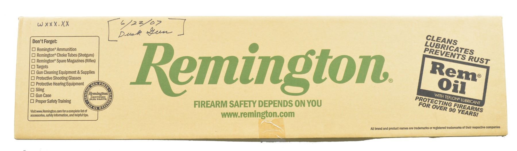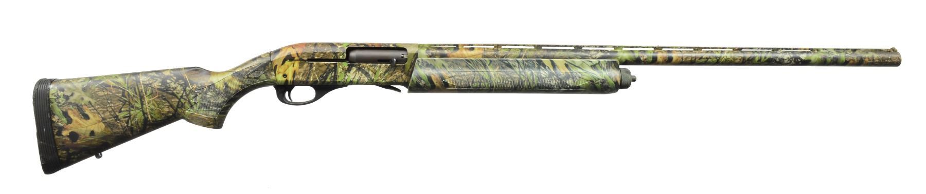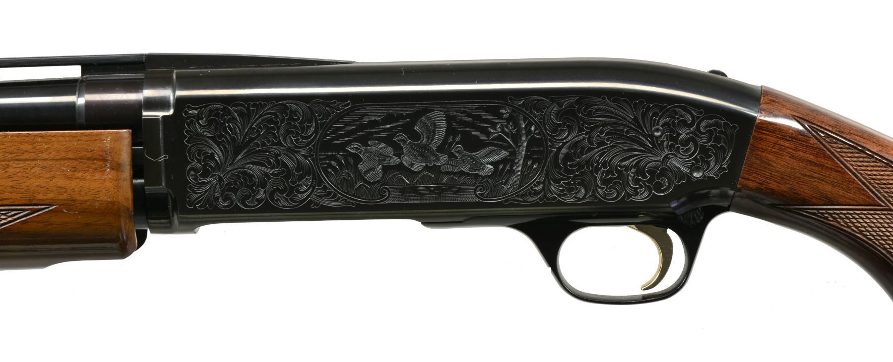 1) BROWNING BPS PUMP. Cal. 20 Ga., 3". S# 32260NR162. Bbl. 28" VR w/ Invector-Plus choke; IC. tube included. Blued steel action w/ scroll ornamentation surrounding vignettes of mallards on right side & quail on left side. Sliding top safety. Gold finished trigger. Forearm & pistol grip stock of gloss finished walnut w/ cut checkering & original buttplate. CONDITION: near excellent retaining over 98% blue. Stock shows a few sm. scratches & marks. Near excellent bore. (20-1373/DS). 2) REMINGTON 11-87 SUPER MAG AUTOLOADING. Cal. 12 Ga., 3 1/2". S# SM061727. Bbl. 27 3/4" VR w/ steel front & mid beads. Bbl. is fitted for Remchokes; Full, Mod., IC & Skeet tubes included. Bbl., action & synthetic stocks have Mossy Oak Obsession camouflage finish. Features include swivel bases & Remington marked Limbsaver pad. UNATTACHED ACCESSORIES: original box containing padded camo sling, owner's manuals, spare chokes & choke wrench. CONDITION: 98% stock & metal finish. Pad shows areas of heat distortion. Bright bore. (20-1402/DS). BOTH MODERN. $800-1,200.