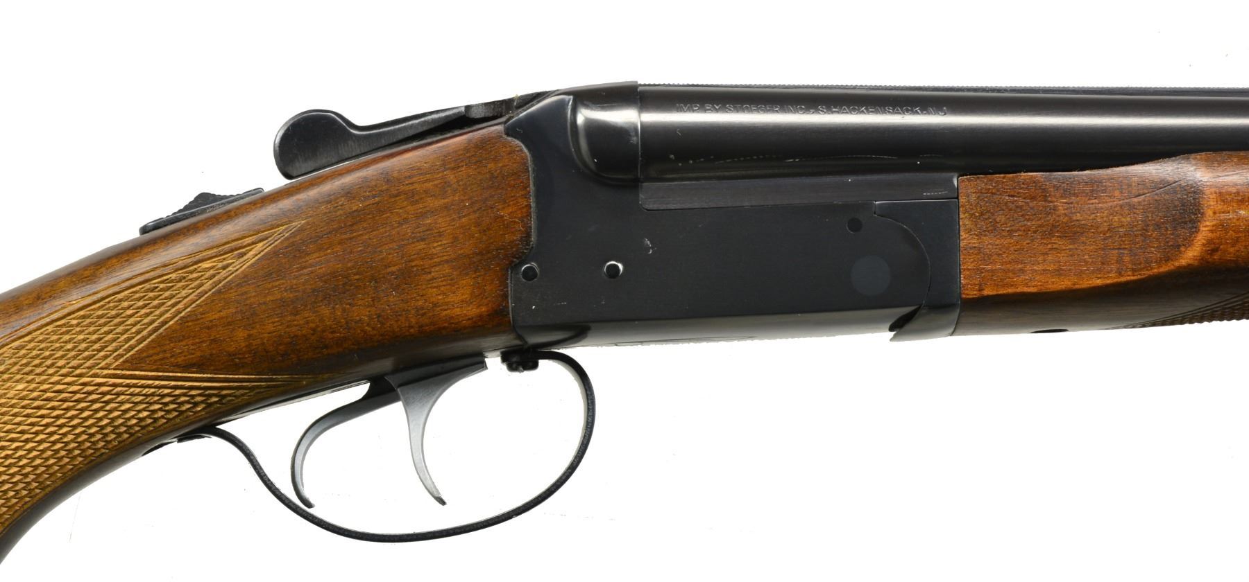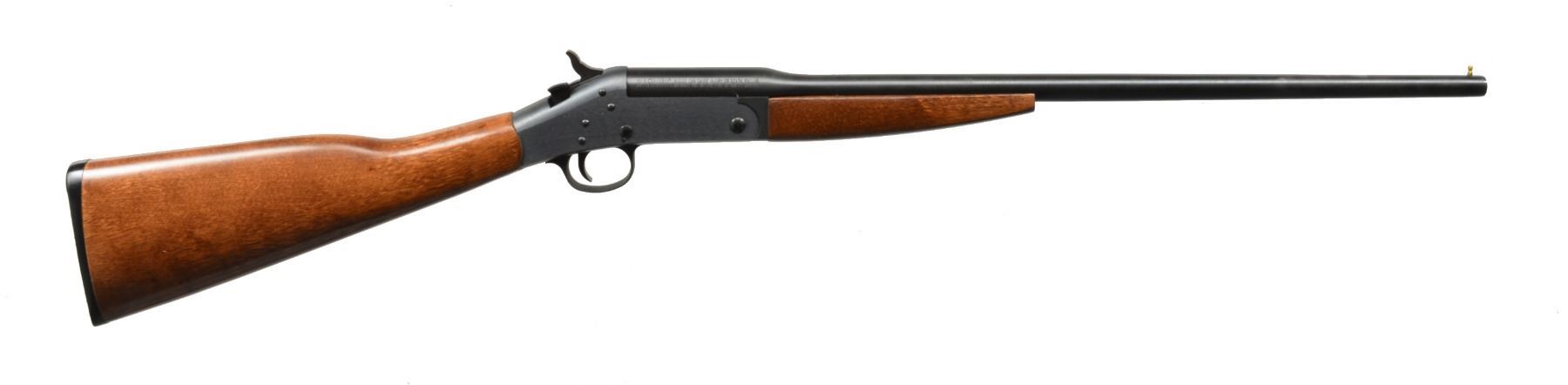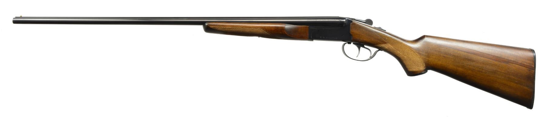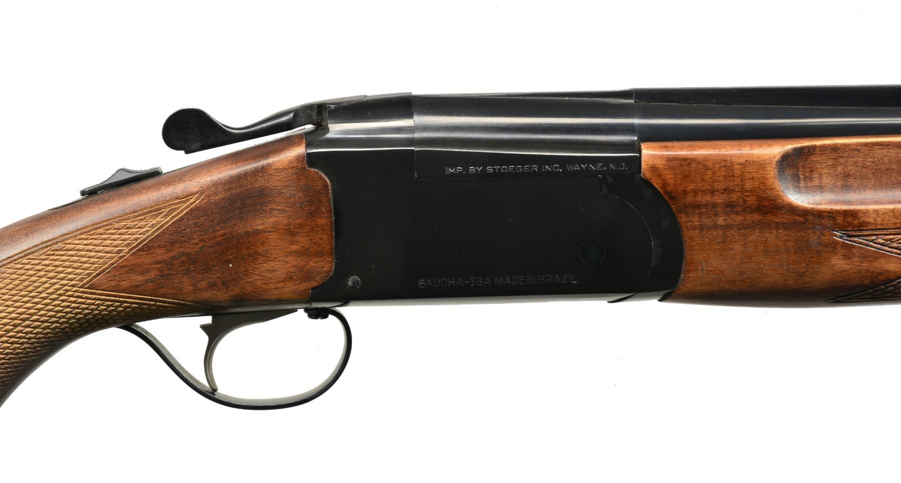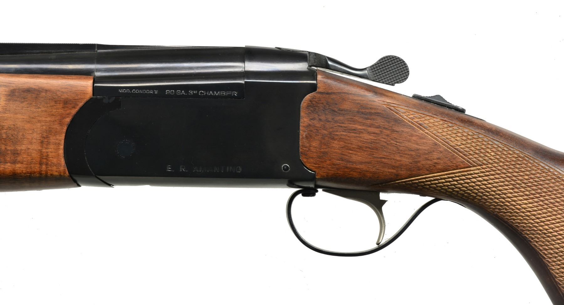1) STOEGER UPLANDER FIELD SXS. Cal. 410, 3". S# 372520. Bbls. 26" w/ steel bead, fixed Full & Full chokes. Blued boxlock action. Dbl. triggers. Extractors. Trim beavertail forearm & pistol grip hardwood stock w/ cut checkering, plastic grip cap & plastic buttplate. Floorplate is marked "GAUCHA-IGA MADE IN BRAZIL". Right side of receiver marked "E.R. AMANTINO". CONDITION: bbl. & action retain 98% blue showing sm. scratches. Stock shows a few sm. handling marks. Bright near excellent bores. (20-1366/DS). 2) HARRINGTON & RICHARDSON 088 SINGLE SHOT. Cal. 20 Ga., 3". S# AZ582365. Bbl. 26" plain w/ brass bead. Case colored exposed hammer action w/ push button style action release. Hardwood forearm & rnd. knob stock w/ original buttplate. CONDITION: near excellent retaining over 98% metal finish. Stock has sm. marks. Near excellent bore. (20-1369/DS). 3) STOEGER CONDOR I O/U. Cal. 20 Ga., 3". S# 41360. Bbls. 26" VR w/ open side ribs & brass bead. Interchangeable choke tubes; Mod. & Full tubes included. Blued boxlock action. Right side is marked "E.R. AMANTINO". Left side is marked "GAUCHA - IGA MADE IN BRAZIL". Single non selective trigger. Extractors. Field style forearm & pistol grip stock of checkered hardwood w/ original black pad. UNATTACHED ACCESSORIES: original box containing owner's manual, choke information & warranty papers. CONDITION: over 99% original blue w/ light scratch on left side of frame. Stock shows series of light marks on left ear. Near excellent bores. (20-1390/DS). 4) HARRINGTON & RICHARDSON PARDNER SINGLE SHOT. Cal. 410, 3". S# HX365335. Bbl. 22" plain w/ steel bead & fixed Full choke. Blued exposed hammer action w/ push button opening lever. Hardwood forearm & youth length straight grip stock. LOP: 12 1/2" over original buttplate. CONDITION: near excellent retaining over 99% metal finish. Stock shows a sm. mark. Near excellent bore. (20-1397/DS). ALL MODERN. $700-1,000.