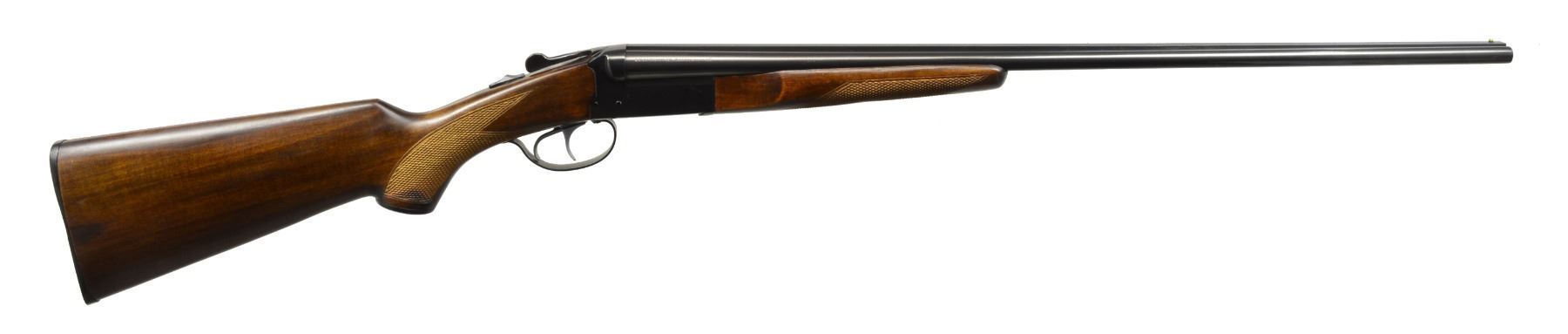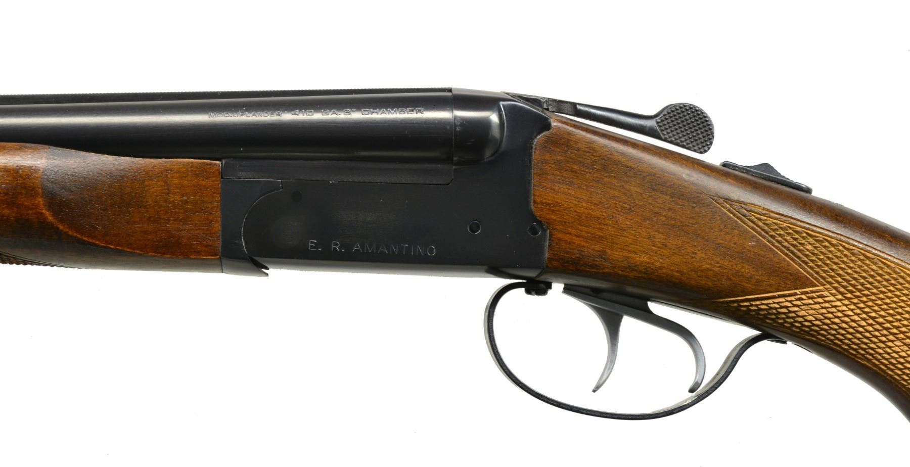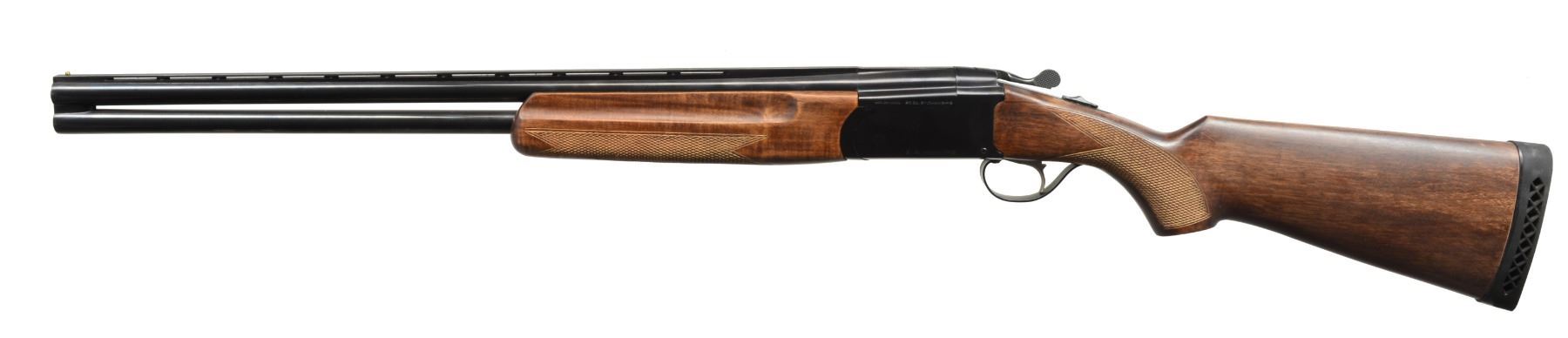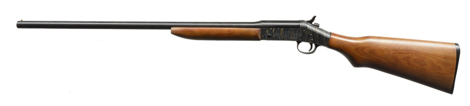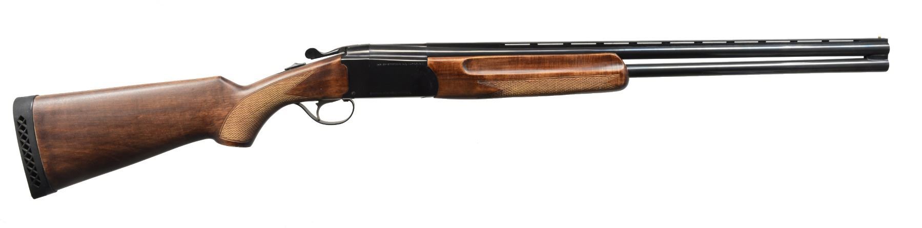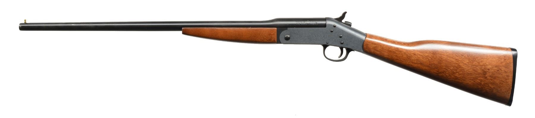 1) STOEGER UPLANDER FIELD SXS. Cal. 410, 3". S# 372520. Bbls. 26" w/ steel bead, fixed Full & Full chokes. Blued boxlock action. Dbl. triggers. Extractors. Trim beavertail forearm & pistol grip hardwood stock w/ cut checkering, plastic grip cap & plastic buttplate. Floorplate is marked "GAUCHA-IGA MADE IN BRAZIL". Right side of receiver marked "E.R. AMANTINO". CONDITION: bbl. & action retain 98% blue showing sm. scratches. Stock shows a few sm. handling marks. Bright near excellent bores. (20-1366/DS). 2) HARRINGTON & RICHARDSON 088 SINGLE SHOT. Cal. 20 Ga., 3". S# AZ582365. Bbl. 26" plain w/ brass bead. Case colored exposed hammer action w/ push button style action release. Hardwood forearm & rnd. knob stock w/ original buttplate. CONDITION: near excellent retaining over 98% metal finish. Stock has sm. marks. Near excellent bore. (20-1369/DS). 3) STOEGER CONDOR I O/U. Cal. 20 Ga., 3". S# 41360. Bbls. 26" VR w/ open side ribs & brass bead. Interchangeable choke tubes; Mod. & Full tubes included. Blued boxlock action. Right side is marked "E.R. AMANTINO". Left side is marked "GAUCHA - IGA MADE IN BRAZIL". Single non selective trigger. Extractors. Field style forearm & pistol grip stock of checkered hardwood w/ original black pad. UNATTACHED ACCESSORIES: original box containing owner's manual, choke information & warranty papers. CONDITION: over 99% original blue w/ light scratch on left side of frame. Stock shows series of light marks on left ear. Near excellent bores. (20-1390/DS). 4) HARRINGTON & RICHARDSON PARDNER SINGLE SHOT. Cal. 410, 3". S# HX365335. Bbl. 22" plain w/ steel bead & fixed Full choke. Blued exposed hammer action w/ push button opening lever. Hardwood forearm & youth length straight grip stock. LOP: 12 1/2" over original buttplate. CONDITION: near excellent retaining over 99% metal finish. Stock shows a sm. mark. Near excellent bore. (20-1397/DS). ALL MODERN. $700-1,000.
