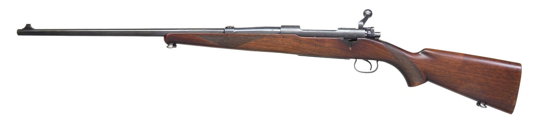 Cal. 30-06. S# 2757. Bbl. 24" w/ pinned blade front sight & Lyman No. 6 folding leaf rear sight. Schnabel tipped pistol grip walnut stock w/ hand checkering & sling swivels. LOP: 13 1/4" to end of wood, no buttplate or pad is installed. Mfg. 1925. CONDITION: bbl. & action have 80% lightly faded blue. Floorplate has 30% dull fading blue. Stock has dull worn appearance w/ scratches & marks. Bore is bright w/ strong rifling. (19-5884/DS/NW). CURIO. $300-450.