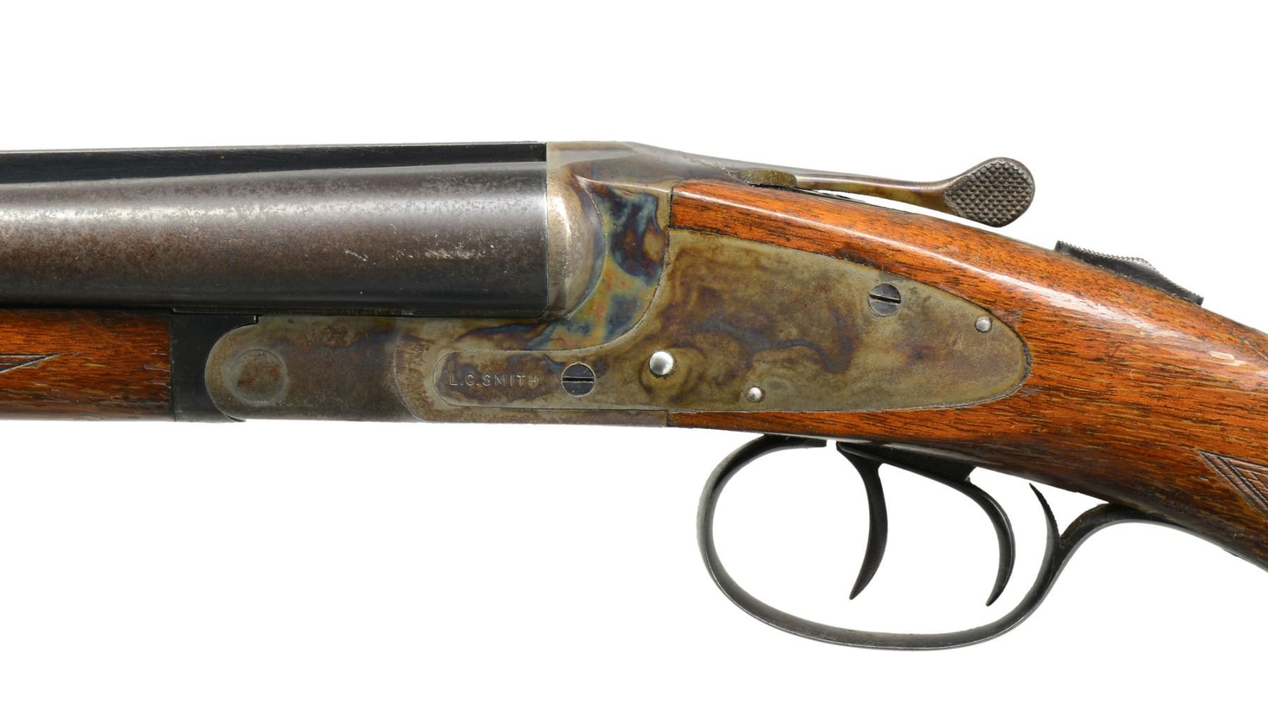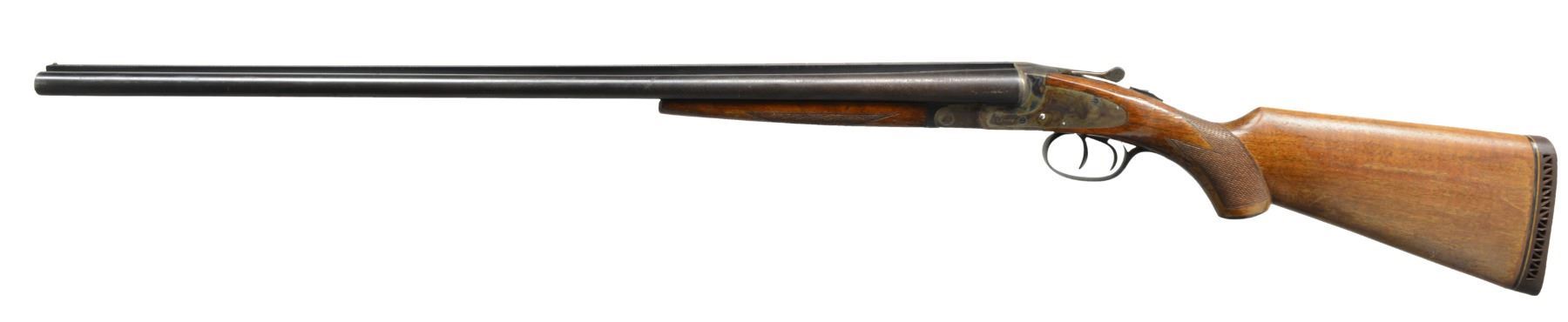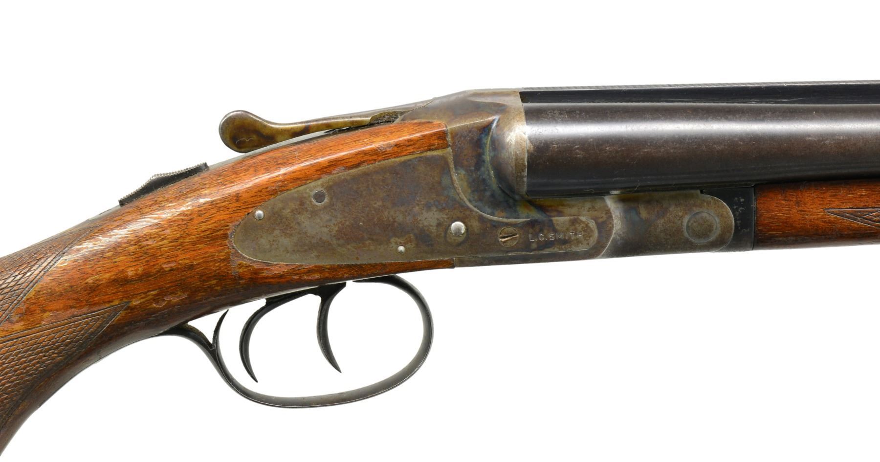 SIGHTING PLANE RIB. Cal. 16 Ga. S# FWS20548. (1947). Bbls. 28" have raised matted solid rib, marked �L. C. SMITH FIELD GRADE" on top of right bbl. Bbl. flats stamped w/ grade, S# & proofs, bottoms of bbls. marked "ARMOR STEEL". Casehardened featherweight action has all correct marks on water table & lockplates. Plain American walnut capped pistol grip buttstock measures 14 5/8" over white line pad. Flat top point pattern checkering is at grip. Matching splinter forend has J-spring release. Bore diameters: left -.657, restriction: .027 (Mod), right - .658, restriction: .024 (mod). Minimum wall thickness: left -.034, right - .033. DAH: 2 3/8". DAC: 1 7/16". WEIGHT: 7 lbs. 0 oz. CONDITION: fine, w/ evidence of poor storage. Metal parts retain most of their original finishes, considerably rusted & cleaned to stop active rust. Stocks have most of their original varnish, lifted & crazed. Newer pad is poorly fitted. Bores are shiny w/ evidence of a few dents. Mechanically fine. 16 Ga. L. C. Smith's are almost as hard to find as 20 bores w/ 38000 being made vs 30000 in field grade. (20-882/MGM106). CURIO. $300-600.