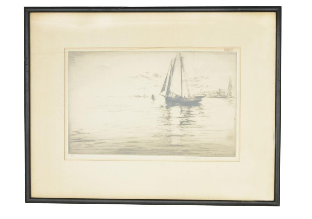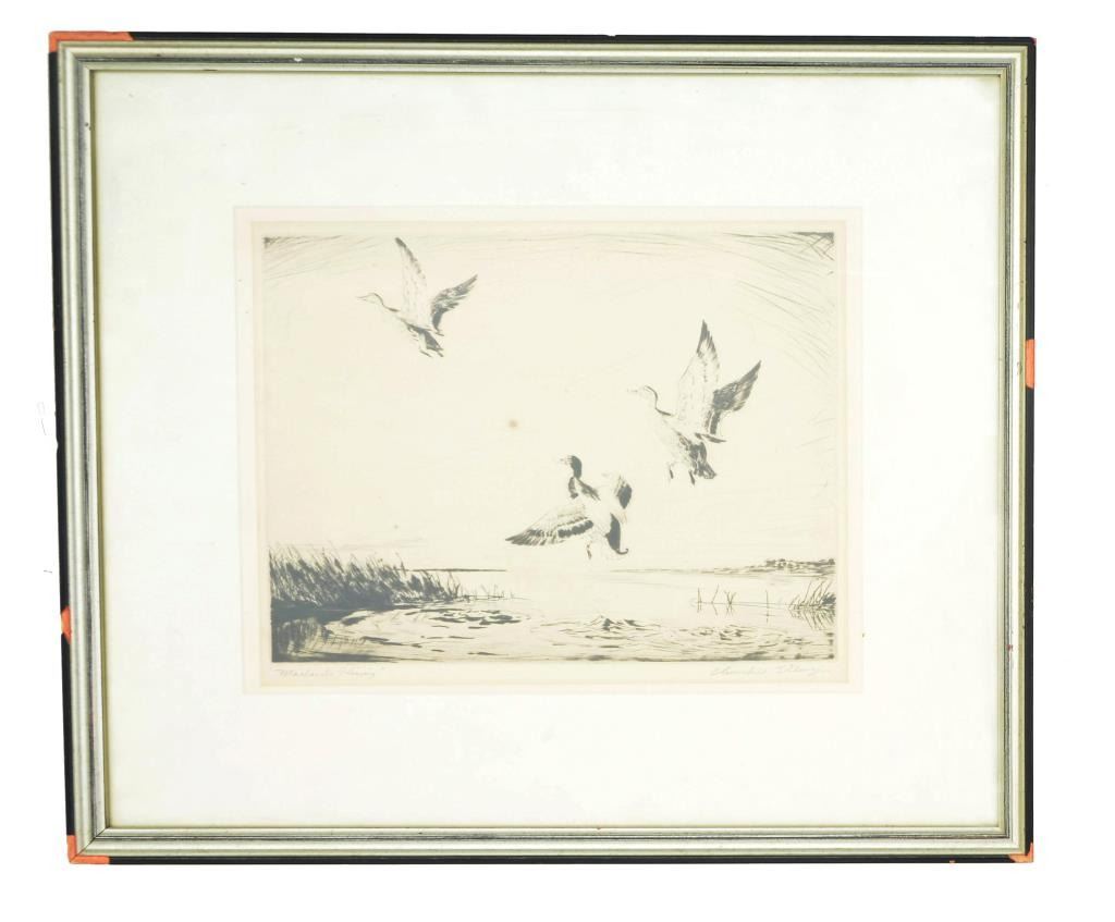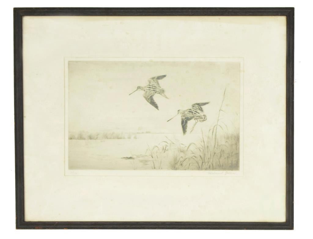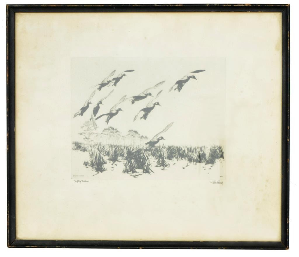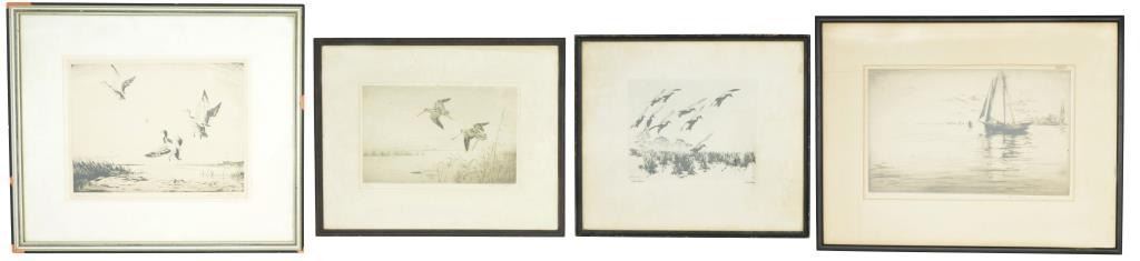 1) Signed & numbered print titled "Woodcocks in Flight" by Roland Green. The signature appears in pencil at the lower right. Lower left has"34/75". Image depicts 2 woodcocks apparently landing in a marshy area. Image size is 11" x 7". 2) Signed print titled "]Mallards Rising" by Churchill Ettinger. The signature appears in pencil at the lower right. Lower left has the title in pencil. Image depicts a male & 2 female mallard ducks rising from a pond. Image size is 12" x 9 1/4". 3) Reproduced print by Richard Bishop titled "Drifting Mallards". The printed signature appears in the lower right. Lower left has the title also printed. Image depicts 9 mallards about to land in what appears to be a marshy area. Image size is 8" x 6 1/4". 4) Signed & numbered print by Levon West. The signature appears in pencil at the lower right. Lower left is inscribed "63." in pencil. Image depicts a sizeable sailing yacht apparently at anchor in a harbor. Image size is 14 1/4 " x 9". CONDITION: all prints have worn frames. Images show very slight discoloration & fading. Yacht print has a rectangular spot in the upper right resembling tape residue that does not affect the image. (02-11174/BF). $300-500 for lot.