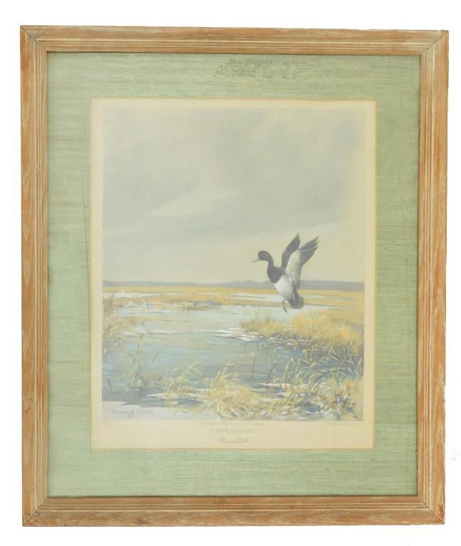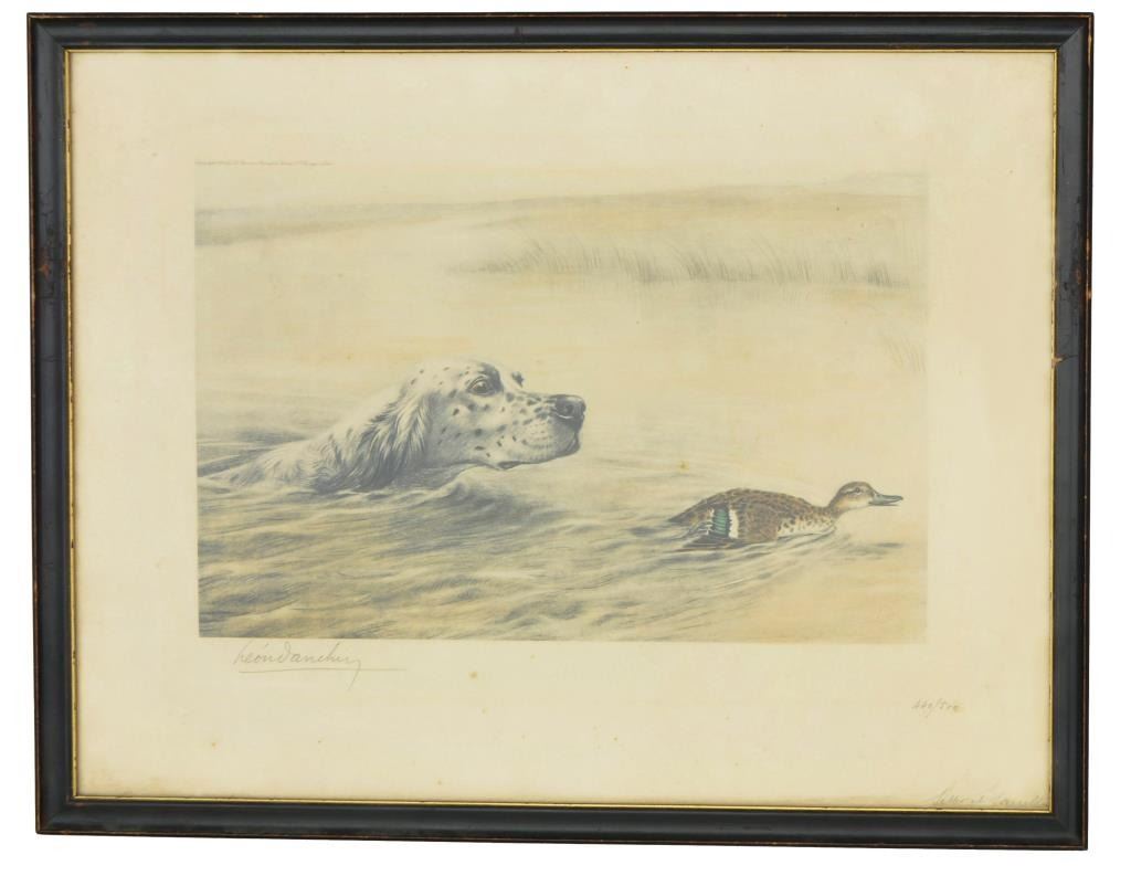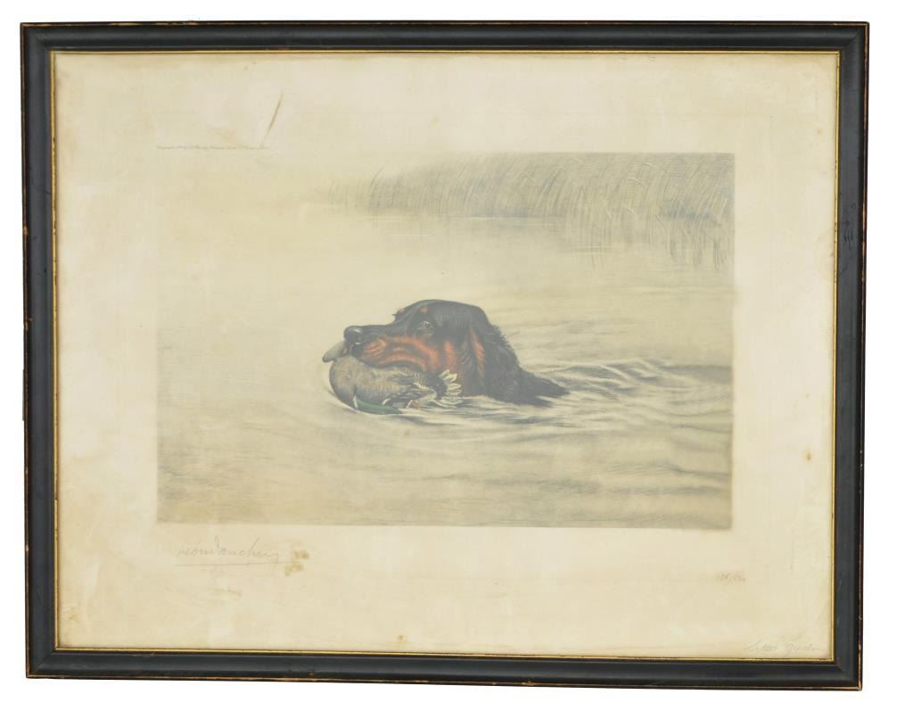 CLARK. L"on Danchin (1887-1938) was a French artist famous for his animal drawings, mostly featuring sporting dogs. Danchin was born in Lille (France) then moved to Chantilly (France) near Paris. His initial works were very popular in France, England, Belgium & the United States. Later in life Danchin moved to the French Flanders area, where he often hunted & found inspiration for the hunting scenes for which he is known so well. 1) Etching of an English Setter pursuing a European Eider duck. Print was limited to 500 impressions. This example is signed & numbered in pencil "Leon Danchin" and 440/500. Bottom right of print appears to read "Setter et Lawellyn" also in pencil possibly in the hand of Danchin. Upper left corner reads "Copyright 1932 by "La Gravure Francaise" 41, rue St. Georges Paris". Size of frame is 20 1/8" x 15 3/4". Image is 14"x 8 7/8". 2) Etching of a Gordon Setter swimming w/ a mallard duck in his mouth. Print was limited to 500 impressions. This example is signed & numbered in pencil "Leon Danchin" & 186/500. Bottom right of print reads "Setter Gordon". Upper left corner reads Copyright 1932 by "La Gravure Francaise" 41, rue St. Georges Paris". Size of frame is 20 1/8" x 15 3/4". Image is 14" x 8 7/8". Roland Clark was born in 1874 in the town of New Rochelle, NY. He attended the William Kellogg School & pursued formal art instruction at the Art Students League. He garnered international acclaim for his sporting paintings and etchings. He was a Federal Duck Stamp designer & is regarded as one of the finest sporting artist of the 20th Century. 3) Aqua tint etching of a broadbill duck landing in a marsh. Print was limited to 250 impressions. This example is signed & numbered in pencil"Roland Clark" & "136" following a printed "250/". The print has the name "Roland Clark" in the left corner & centrally below the image reads "New York, Published & Copyrighted 1940 by The Derrydale Press" w/ the title"A STRAGGLER BROADBILL". Size of frame is 22 1/2"x 26 1/4". Image size is 14" x 16 3/4". CONDITION: the Lewellyn setter print shows minor discoloration. The Gordon setter print has a slight water stain not affecting the image. The broadbill duck shows minor darkening. (02-11175/BF). $600-1000 for lot.