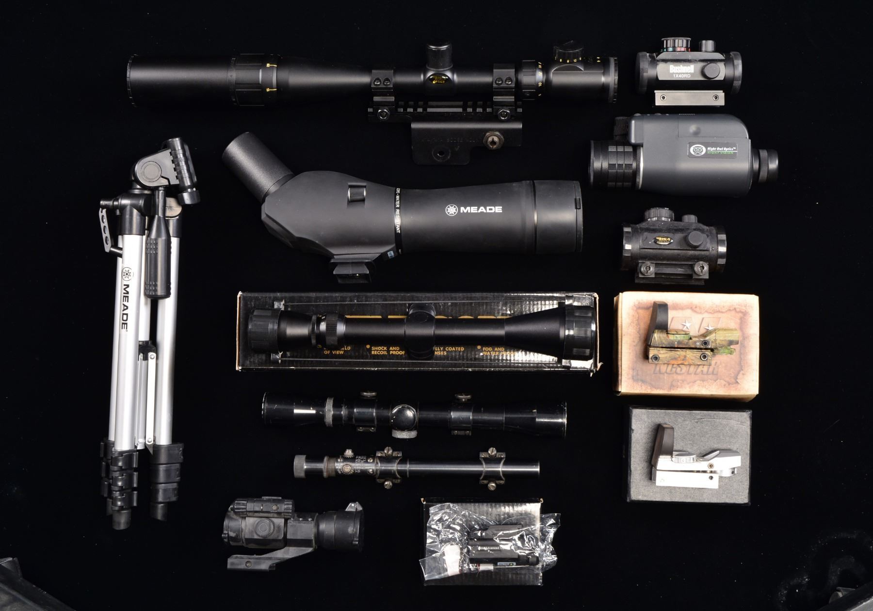 NIGHT SIGHT. 1) BSA Mil Dot 4-16 X40IR matte finished scope w/ M14/M1A scope mt. 2) Valor 4x32 scope w/ standard cross hairs & Ruger rings. 3) W. R. Weaver M1X Rimfire rifle scope w/ Dot reticle & scope mts. for unidentified rifle. 4) Chinese 3-9x40 matte finished rifle scope w/ Mil Dot type reticle. As new in box w/ scope covers & rings. 5) Bushnell 1x40RD optical sight. Battery is dead. 6) BSA Red Dot sight. Battery functions. 7) Air Gun plastic optical sight. Battery is dead. 8) NcStar 4 reticle reflex sight. Model D4S. In box w/ scope rail & instructions. 9) Ada Advance Optics. Laser sight in box w/ instructions. 10) NcStar Electro Dot sight. Satin stainless finish, in box. 11) Kel-Tec box, paper & accessories only for PMR-30 Red Dot sight. 12) Night Owl Optics night vision spotting scope, in nylon zippered pouch. 13) Spotting scope tri pod in nylon zippered bag. 14) Meade 20-60x60mm zoom water resistant spotting scope, in nylon bag. CONDITION: electronic items cannot be checked w/out batteries. Non electronic items have clear optics. (02-13715/DS). $400-800.