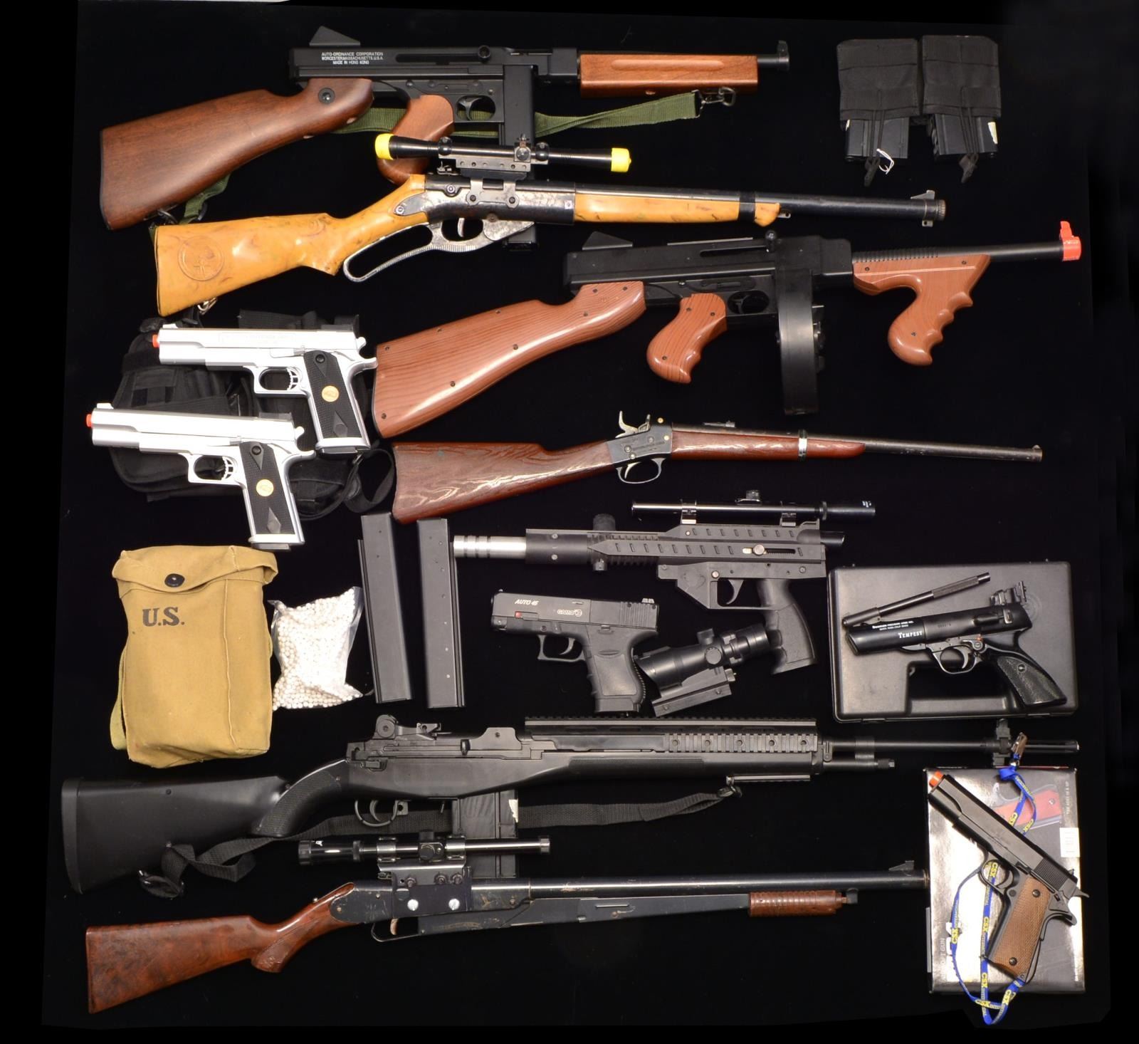 1) AUTO ORDNANCE AIR SOFT THOMPSON SUB-MACHINE GUN. Cal. 6mm Air Soft BB. Bbl. 11". Metal construction w/ walnut stock, pistol grip & forearm giving it the look & feel of a real sub machine gun. Green web sling. UNATTACHED ACCESSORIES: 3 total: stick mags., over 2000 rds. of air soft 6mm BB's in a US marked OD green ammo pouch. CONDITION: 98% finish. Not checked for operation. 2) CHINESE M14 AIR SOFT RIFLE. Cal. 6mm Air Soft BB. Black plastic construction w/ quad rails. UNATTACHED ACCESSORIES: 3 total: box mags.; 2 held in a Cordua mag. pouch. 3) No. 8903A AIR SOFT THOMPSON SUB-MACHINE GUN. Cal. 6mm Air Soft BB. Plastic construction w/ drum mag. Mfg. in China. UNATTACHED ACCESSORIES: original box. CONDITION: stock has an open seam. 4) DAISY M25 PUMP ACTION BB RIFLE. Cal. 177 BB. Black painted finish w/ gold decals. Plastic pump handle & stock Daisy x415 air gun scope. CONDITION: 80% paint showing scratches. Stock is warped. 5) DAISY 96 LEVER ACTION BB RIFLE. Cal. 177 BB. Black painted finish w/ ivory colored plastic stocks. Daisy plastic scope type sight. CONDITION: blistering & flaky paint. Stock shows warpage. Forearm is held by black electrician tape. 6) MATTEL ROLLING BLOCK CAP GUN. In fair condition. 7) STINGRAY PAINT BALL GUN CO2 POWERED. No canister, includes black plastic construction Natural finish aluminum bbl. Bushnell 4x15 scope. UNATTACHED ACCESSORIES: original box that shows water damage. 8) GAMO AUTO 45 CO2 POWERED PISTOL. Cal. 177. S# 044C105800-00. Polymer construction, metal slide & a Glock appearance. Made in Spain. 9) BEEMAN TEMPEST PELLET PISTOL. Cal. 177. S# 055272. Bbl. 6 3/4", serves as cocking lever. UNATTACHED ACCESSORIES: foam lined plastic box & 3 partial boxes of pellets. 10) CHINESE M21 AIR SOFT PISTOL W/ M1911 APPEARANCE. Cal. 6mm Air Soft BB. UNATTACHED ACCESSORIES: near new in original box & papers. 11) 2 DOUBLEEAGLE 2000 A1 AIR SOFT PISTOLS. Cal. 6mm Air Soft BB. Silver finished w/ black plastic grips styled to look like the Desert Eagle. Mfg. in China. UNATTACHED ACCESSORIES: nylon dbl. shoulder holster rig. CONDITION: none have been function tested. (02-13743/DS). NON-GUN. $300-600.