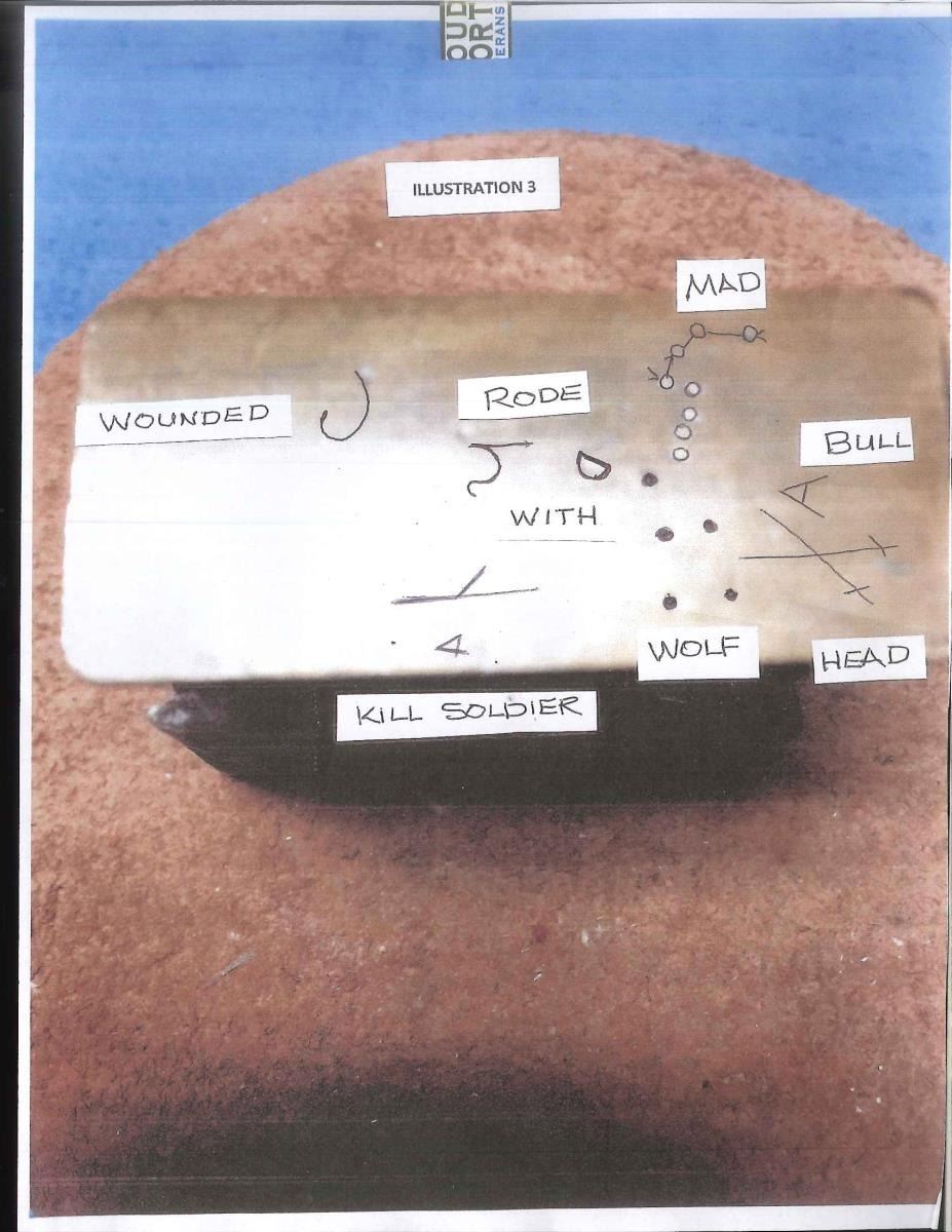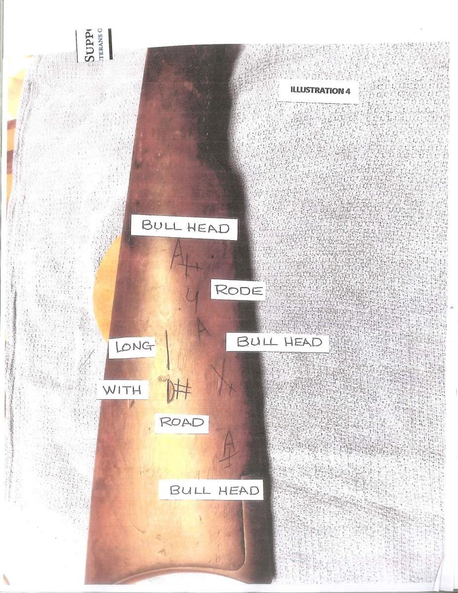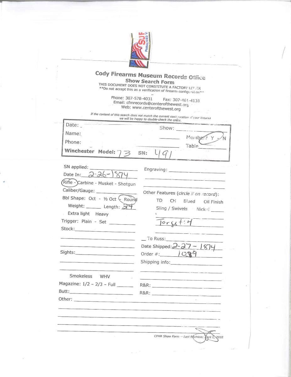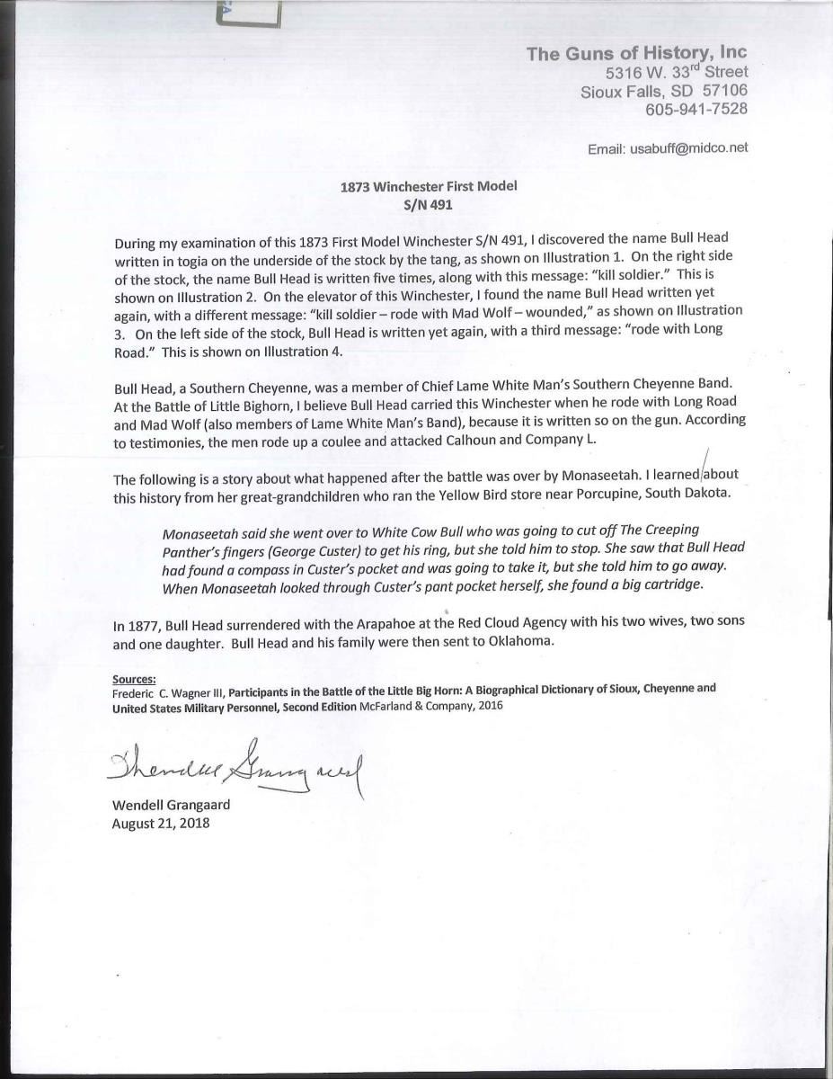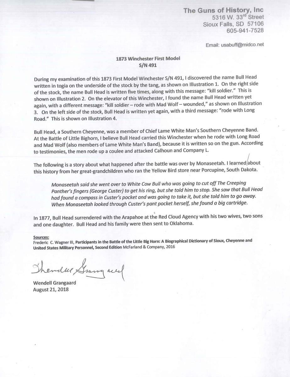 Cal. 44 WCF. S# 491. Bbl. 24" rnd. w/ brass blade replacement front sight & elevator adj. sporting rear sight. Full length mag. 1st Model action w/ mortised dust cover having raised thumb print. Walnut forearm & straight grip stock w/ crescent steel buttplate. Wendell Grangaard of South Dakota has unlocked the key to "togia", the pictographic language of the Cheyenne & Sioux Plains Indians. In his book "Documenting the Weapons used at the Little Big Horn", Mariah Press, 2015, Mr. Grengaard opens a window on Western History by translating the togia markings on historic Indian used weapons. The togia markings on this rifle, as translated by Mr. Grengaard, indicate the rifle was used by Bull Head, a Southern Cheyenne, at the Battle of the Little Big Horn. UNATTACHED ACCESSORIES: folder of provenance titled "BATTLE of the LITTLE BIG HORN / A HISTORIC NATIONAL TREASURE" includes letters by Wendell Grangaard of Guns of History Inc. Photographs overlaid w/ diagrams of the togia markings show their meanings as translated by Mr. Grengaard. Cody Firearms Museum records search showing the following information: "Model: 73 SN: 491 / Date In: 2-26-1874 / Rifle / Bbl. shape: Round. / Length: 24 / Target: 4 / Date Shipped 2-27-1874 / Order #: 1039". CONDITION: metal has gray brown appearance from touch up finish over some very light pitting. Stock & forearm have age darkened appearance showing numerous marks including the lightly visible & difficult to discern togia marks as identified & translated by Mr. Grangaard. Forearm has long crack extending from left side of tip. Bottom of carrier shows numerous dents & scratches including those interpreted as togia marks by Mr. Grangaard. Bore has worn, lightly pitted appearance over intact rifling. (01-16345/DS). ANTIQUE. $8,000-12,000.