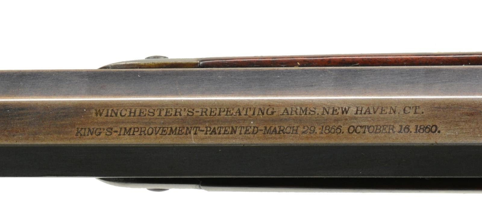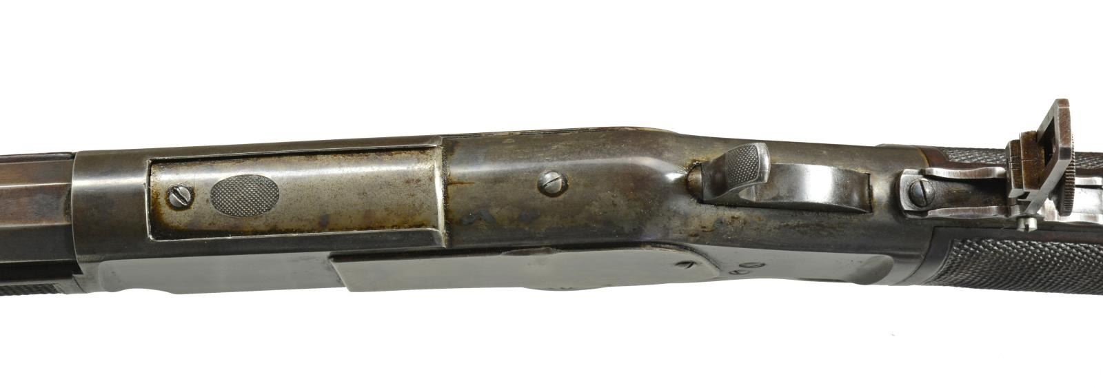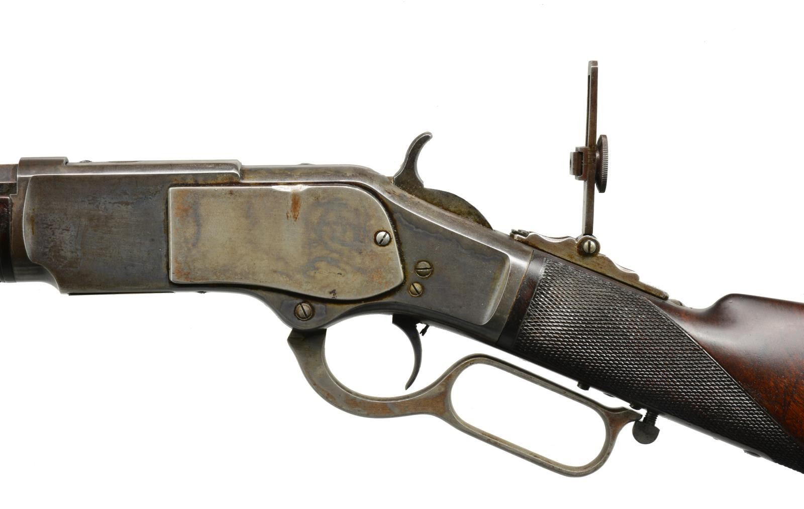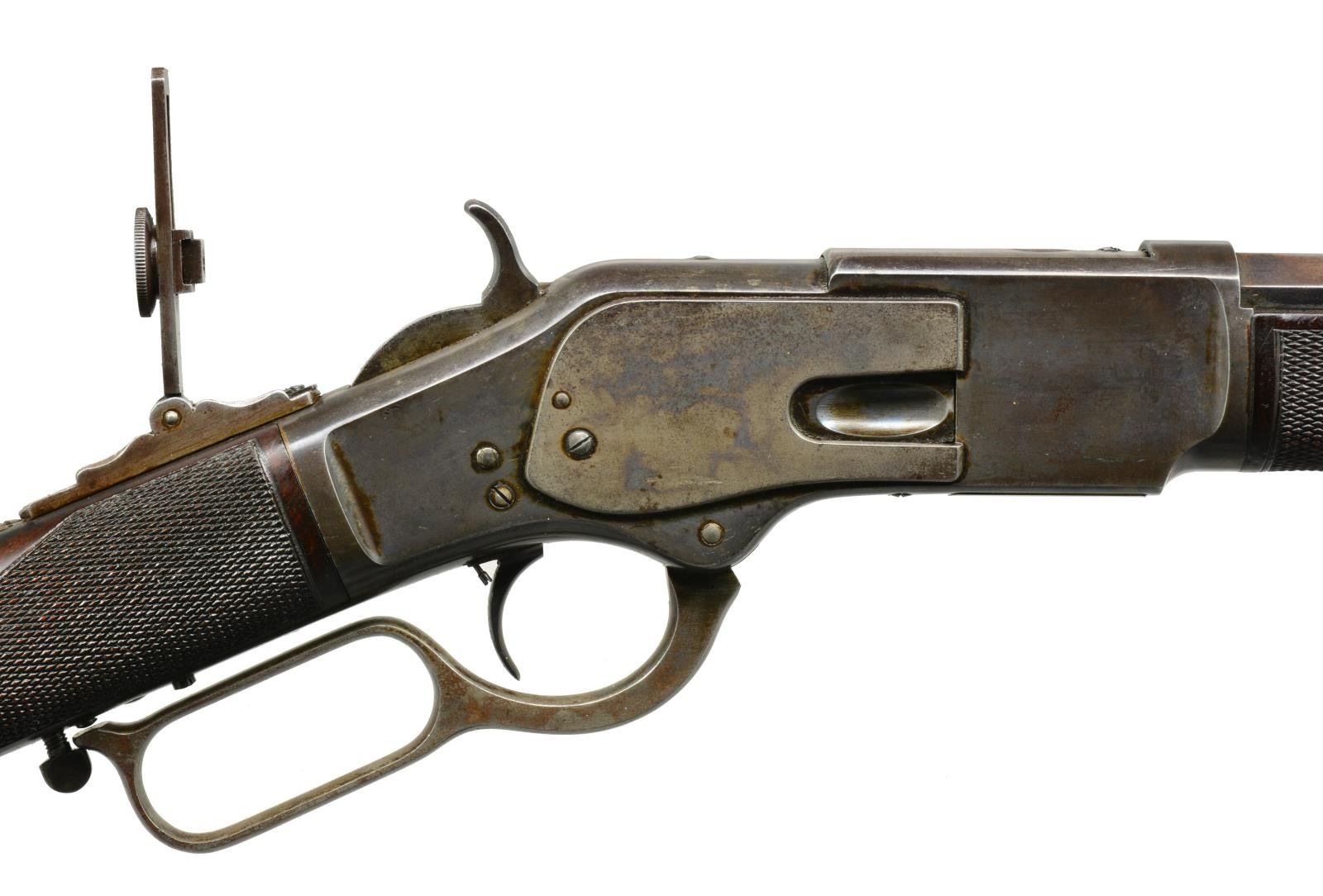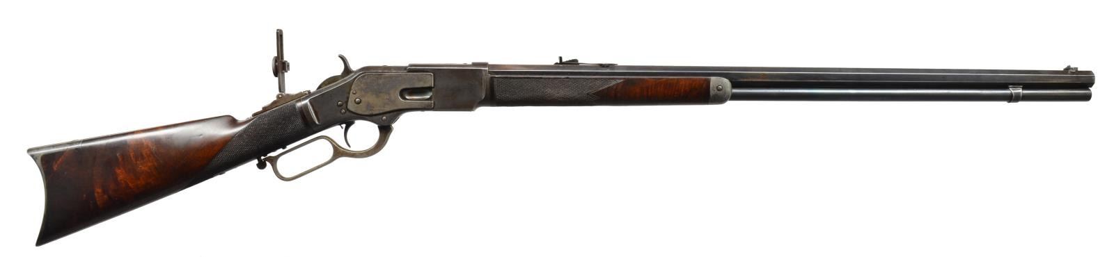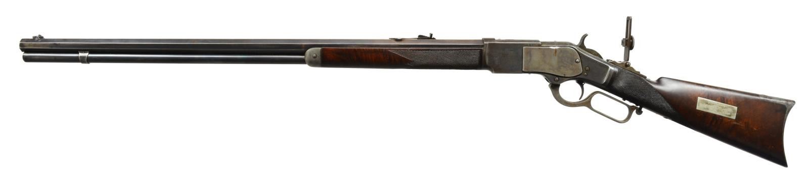 1873 EARLY FIRST MODEL DELUXE LEVER ACTION RIFLE. Cal. 44 WCF. S# 27134. This rare, possibly historic, Winchester has features that closely match the famous "One of One Thousand" Winchester 1873 rifles. The 1950 Jimmy Stewart movie "Winchester 73", told the story of the One of One Thousand rifle that was first prize at the "Centennial Rifle Shoot" in Dodge City, Kansas, July 4, 1876. The left side of stock of this rifle has a 2 1/2" x 3/4" rectangular silver plate marked "First Prize / Dodge City Rifle Shoot / July 4, 1879". This rifle has a combination of features that are rarely found on early Winchester rifles. Features include: 28" oct. bbl. (4" longer than standard), case colored action, single set trigger, stock and forearm of XX fancy walnut w/ checkering, combination front sight and vernier tang sight along with flat top sporting rear sight. Rifle also features full length mag., mortised thumb print dust cover and crescent steel trapdoor buttplate. Inside left of lower tang has wood grade marking "XX" followed by assembly number "326". Matching assembly number "326" is found in top tang channel of stock. The right side plate, inside just above the loading gate is marked w/ assembly # 134. The Madis book states the 1 of 1000 was no longer listed in the 1877 catalog though exception were made and several 1 of 1000's remained on hand .S# 27141 is a known 1 of 1000. Records show, this rifle S# 27134, was shipped 9-3-1877. This date may account for the lack of the 1of 1000 designation. UNATTACHED ACCESSORIES: Cody Firearms Museum records search listing the following information: "Date in: 9-1-1877 / Rifle / Bbl. shape: Oct. / Length: 28 / Trigger: Set / Stock: Checkered stock / Other Features: CH / Date Shipped: 9-3-1877 / Order # 9689". Also includes 3 piece cleaning rod held in buttstock compartment. NOTE: Although this rifle deserves further research, we have learned, through a prior owners verbal recollection, he was able to trace it's history back to 1956 when Helga Ball, widow of Harold Ball of Studio City, CA sold the rifle to Charles Doorman for $15. Also, prior research of the Dodge City newspaper archives failed to yield detailed information about Dodge City's 1979 July 4th rifle shoot. CONDITION: barrel and mag. tube retain 70% dull lightly faded blue showing edge wear and small spots of corrosion. Left bbl. flat ahead of forearm cap and adjacent to rear sight show small dents. Receiver retains a dark appearance showing traces of fading case colors. Sideplate, dust cover and lever have lighter appearance showing 40% fading case colors. Left sideplate shows area of deep wear along upper edge that appears to be the result of repeated contact with a hard object. Stock and forearm retain original finish showing age related wear with scattered scratches and handling marks. Butt section of stock shows small grain checks and spots of wear. Bore is bright w/ sound strong rifling showing small spots of very light pitting. (01-17678/DS). ANTIQUE. $18,000-27,000.
