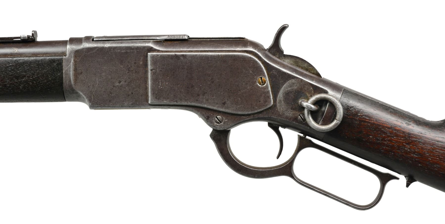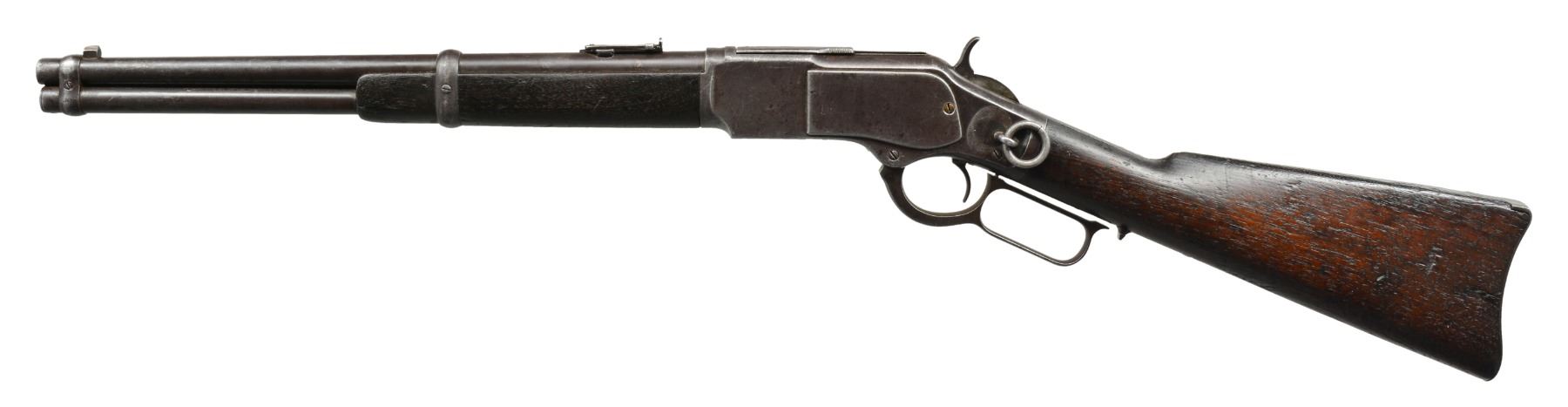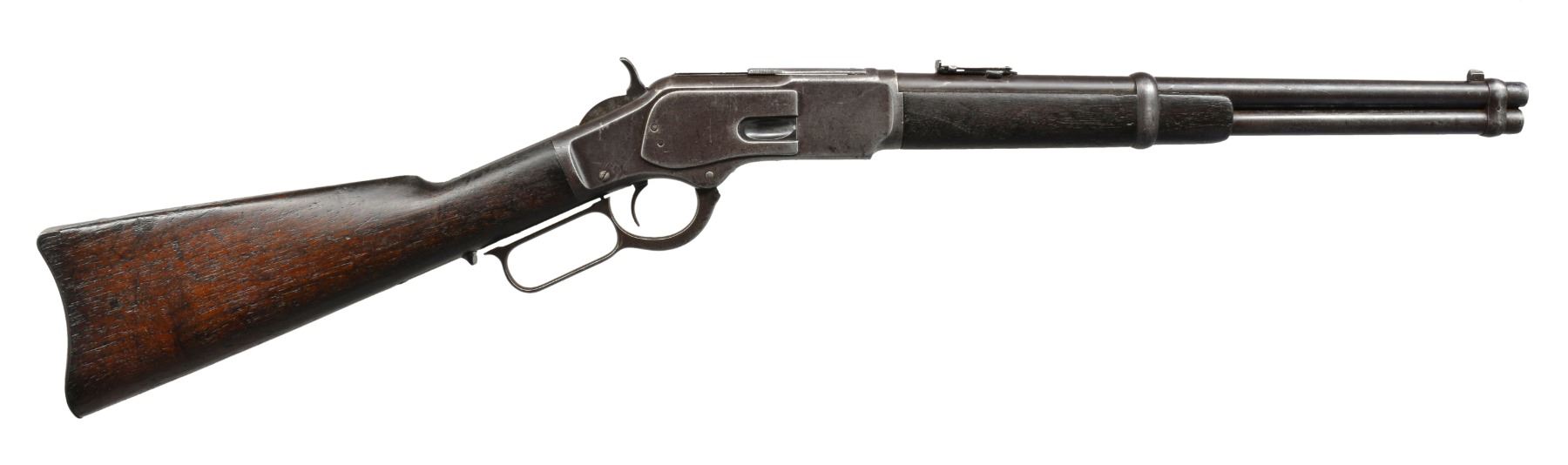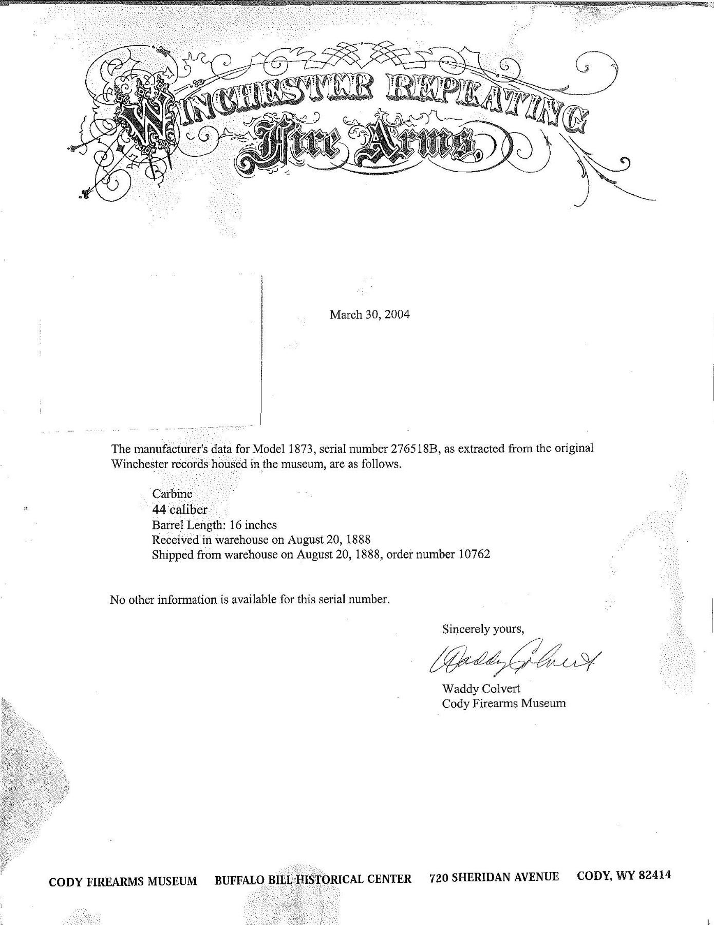 Cal. 44 WCF. S# 276518B. Bbl. 16". Blade front sight w/ graduated leaf carbine rear sight having 1873 date. Full length mag. Action has saddle ring on left side. Proper 7 7/8" trapper length walnut forearm & straight grip walnut stock w/ trapdoor carbine buttplate. UNATTACHED ACCESSORIES: Cody Firearms Museum records search lists the following information: "SN applied: 8-8-1888 / Date in: 8-20-1888 / Carbine / Caliber: 44 / Bbl. length: 16 / Date shipped : 8-20-1888 / Order # 10762". Also includes a Cody letter dated March 30, 2004 confirming the same information. CONDITION: metal finish is fading to brown patina showing scattered light pitting & handling marks. Stock & forearm have aged darkened appearance showing numerous scratches & dents. Bore shows pitting over largely intact rifling. (01-17679/DS). ANTIQUE. $5,000-7,000.