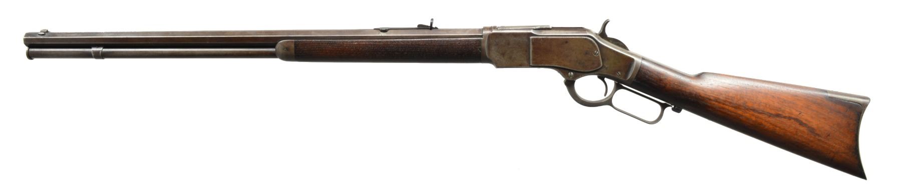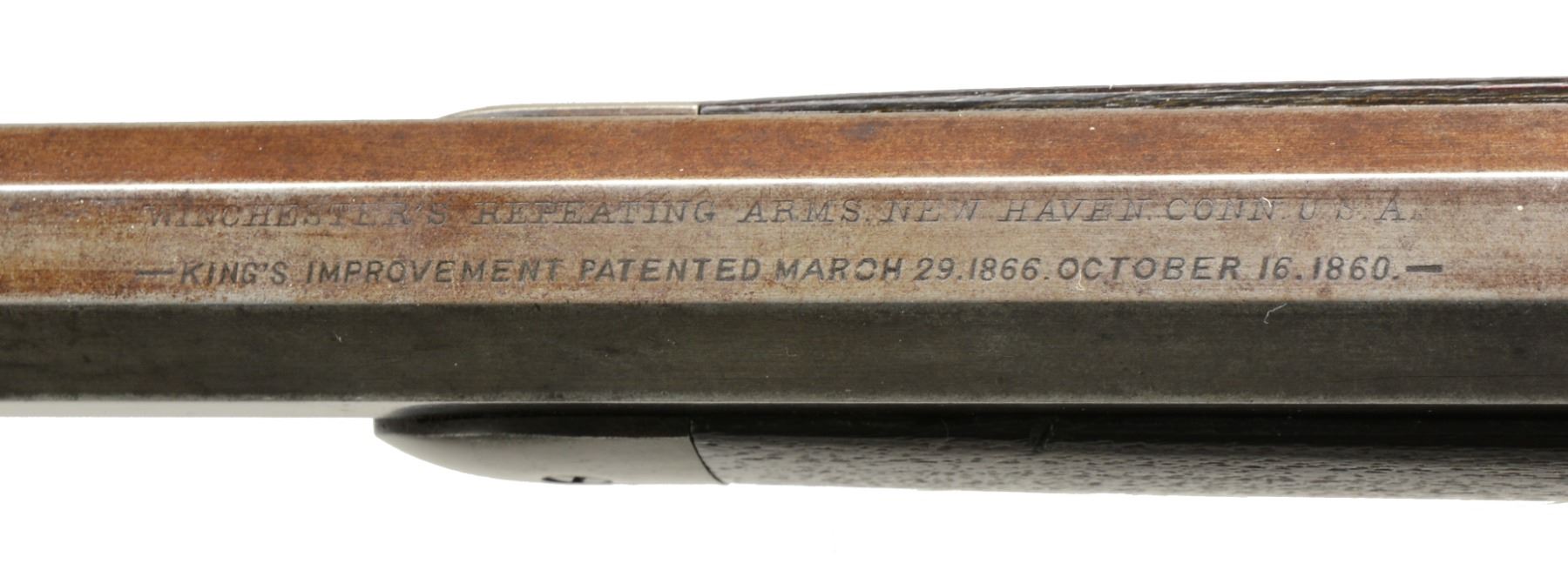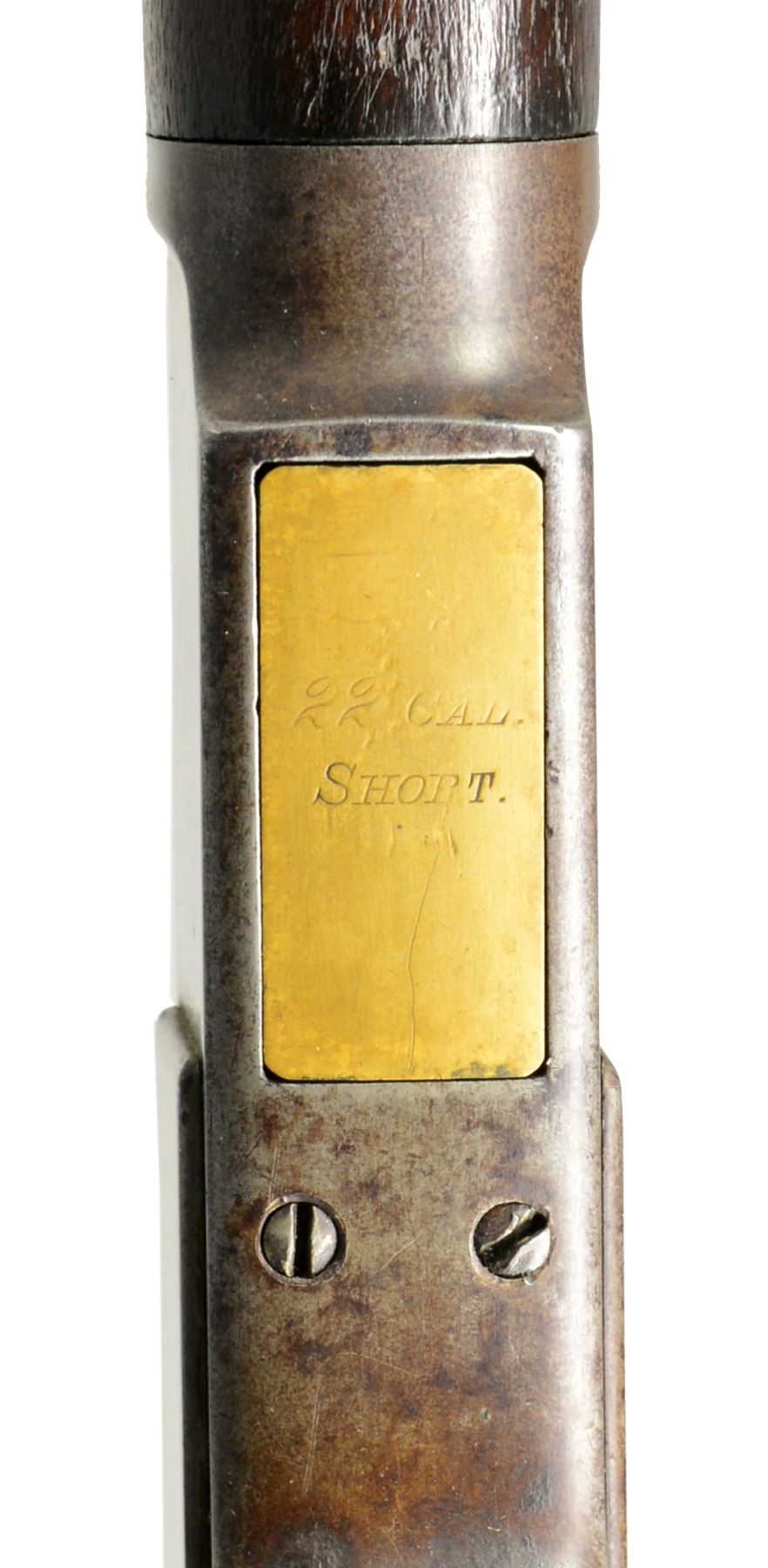 Cal. 22 Short. S# 281888B. Bbl. 24" oct. w/ sporting front sight & elevator adj. sporting rear sight. Full length mag. w/ intact inside tube. Third model action. Walnut forearm & straight grip stock w/ crescent steel buttplate. 1888 Mfg. CONDITION: metal finish has faded to a mottled brown patina showing sm. dents on front ring of receiver & around rear sight. Wood shows moderate wear w/ scattered sm. dents & handling marks. Dark heavily pitted bore. (01-17493/DS). ANTIQUE. $2,000-3,000.