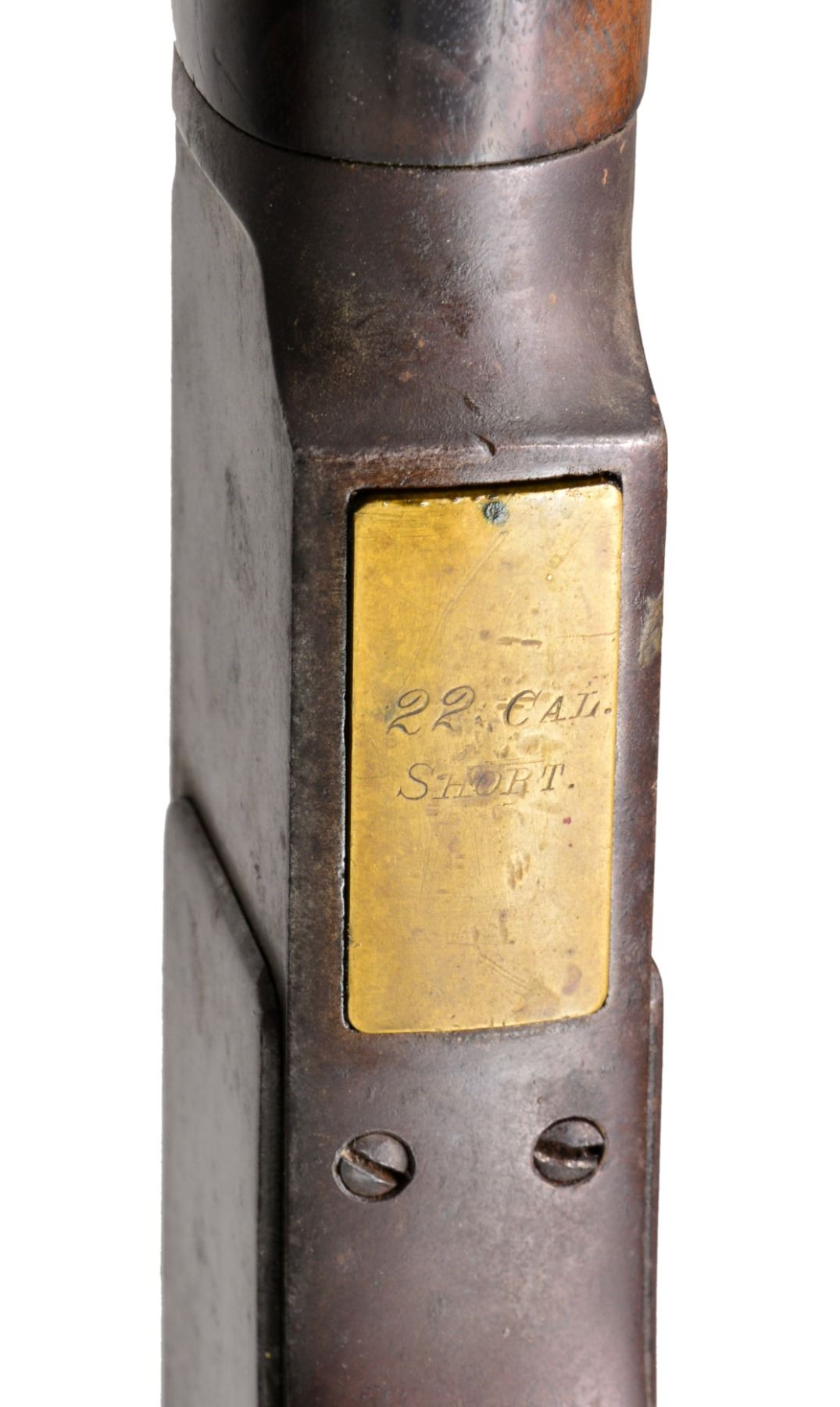Cal. 22 Short. S# 353142B. Bbl. 24" oct. Full length mag. Sporting front sight w/ replacement German silver blade & sporting rear sight missing elevator. Blue finish. Walnut forearm & straight grip rifle stock w/ crescent steel buttplate. Mfg. 1890. CONDITION: metal has faded to a crusty brown patina w/ scattered spots of surface corrosion. Stocks have worn age darkened appearance showing scratches, dents & mildew spots. Dark bore w/ partially intact heavily worn rifling. Lever latch is missing. Inside mag. tube is intact with older solder at front. Rear mag clip & extractor appear to be replacement. PROVENANCE: Estate Collection of Dan Poppen. (01-17348/DS). ANTIQUE. $800-1,200.