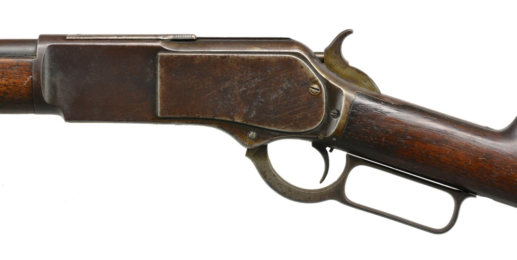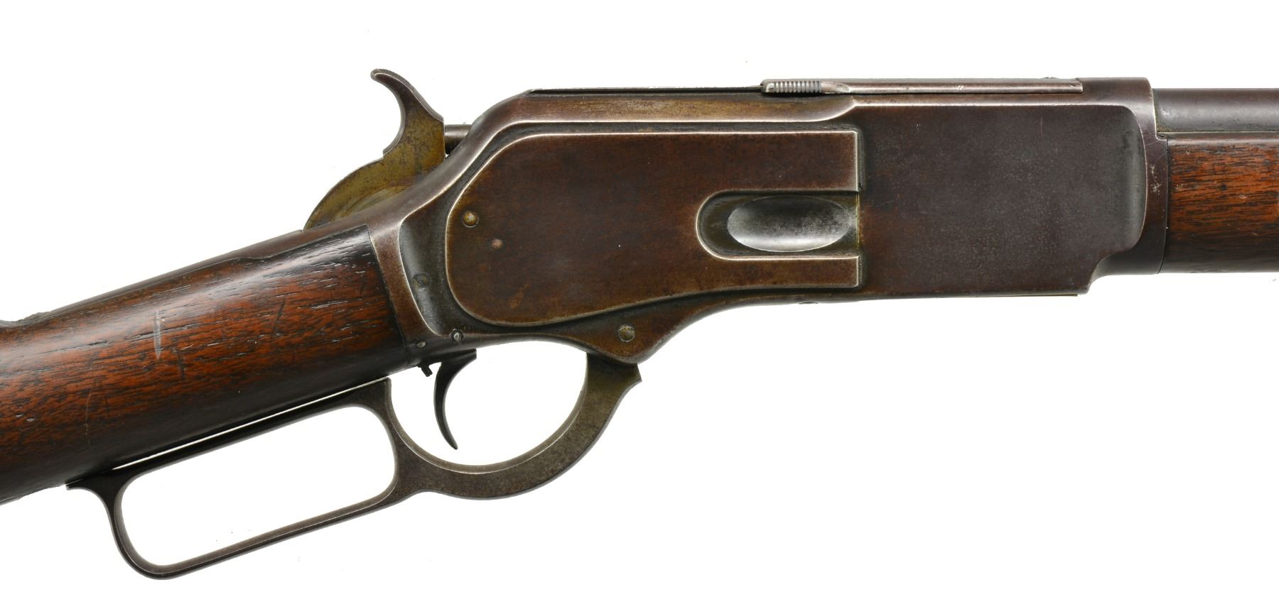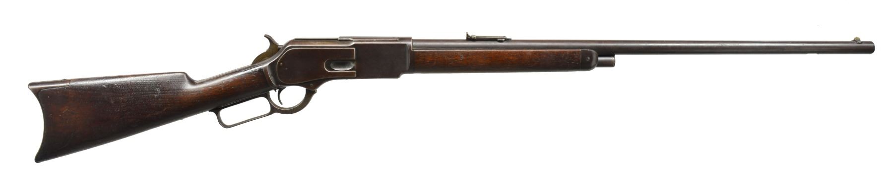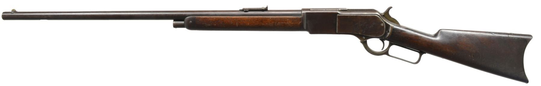 Cal. 40-60 WCF. S# 55496. Bbl. 28" rnd. w/ sporting front sight & graduated leaf rear sight. Mag. is shortened to 1/2 length. Blue finished rifle w/ case colored hammer & lever. Single set trigger. Walnut forearm & straight grip stock w/ crescent steel trapdoor buttplate. 1885 Mfg. CONDITION: bbl. & action finish have faded to a pleasing brown patina showing some surface corrosion. Hammer & lever have faint traces of case colors. Lever latch is removed. Trigger is not adjusted to set properly. Stock & forearm have dark aged appearance showing dents & handling marks. Bore has intact rifling w/ a light shine showing some very light pitting. (01-17425/DS). ANTIQUE. $1,500-2,000.