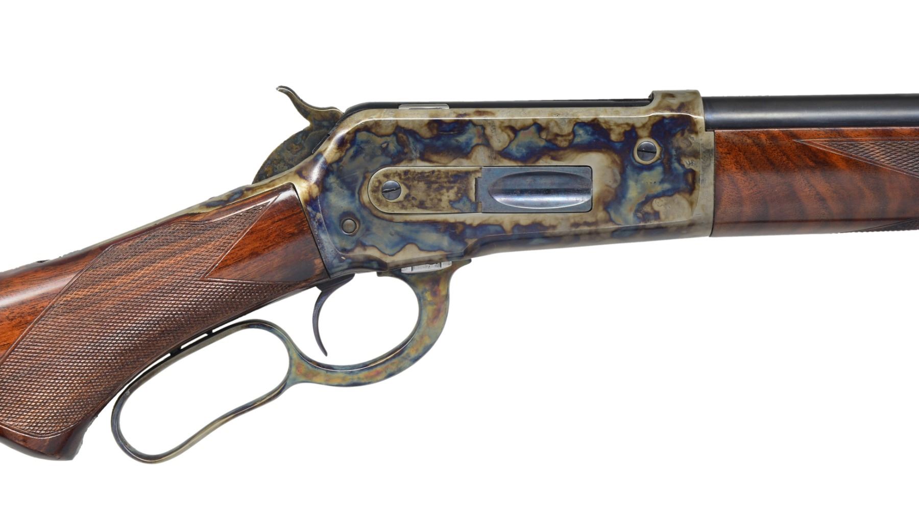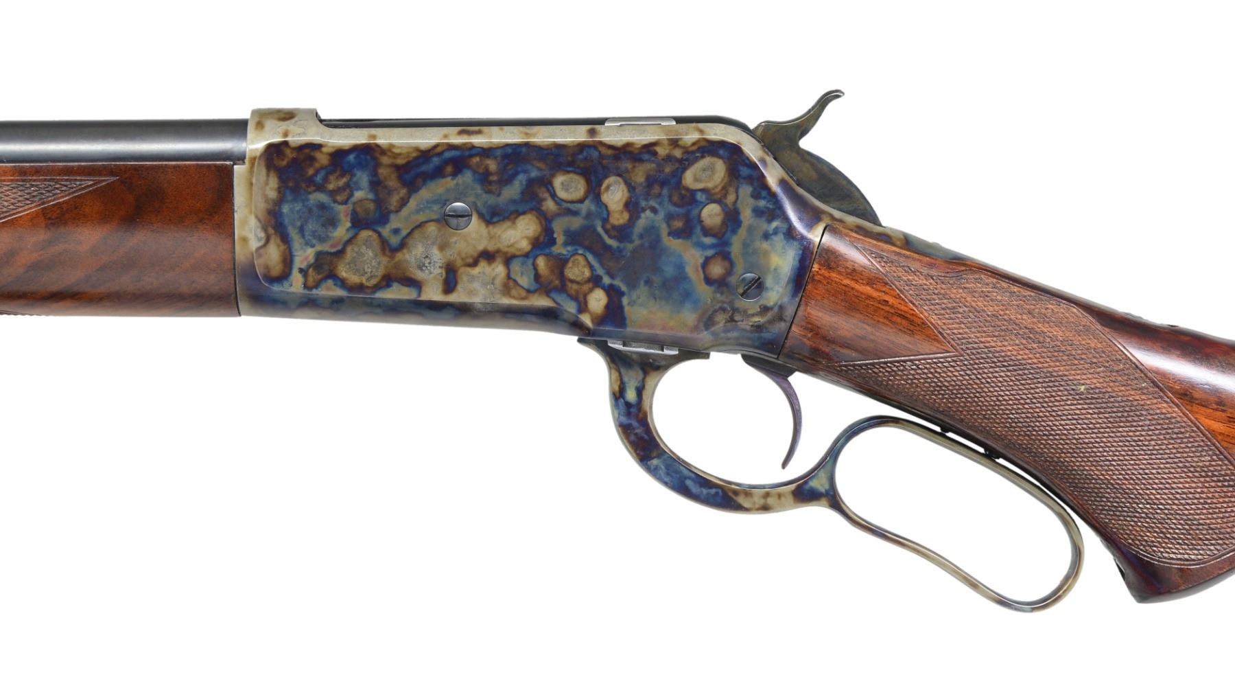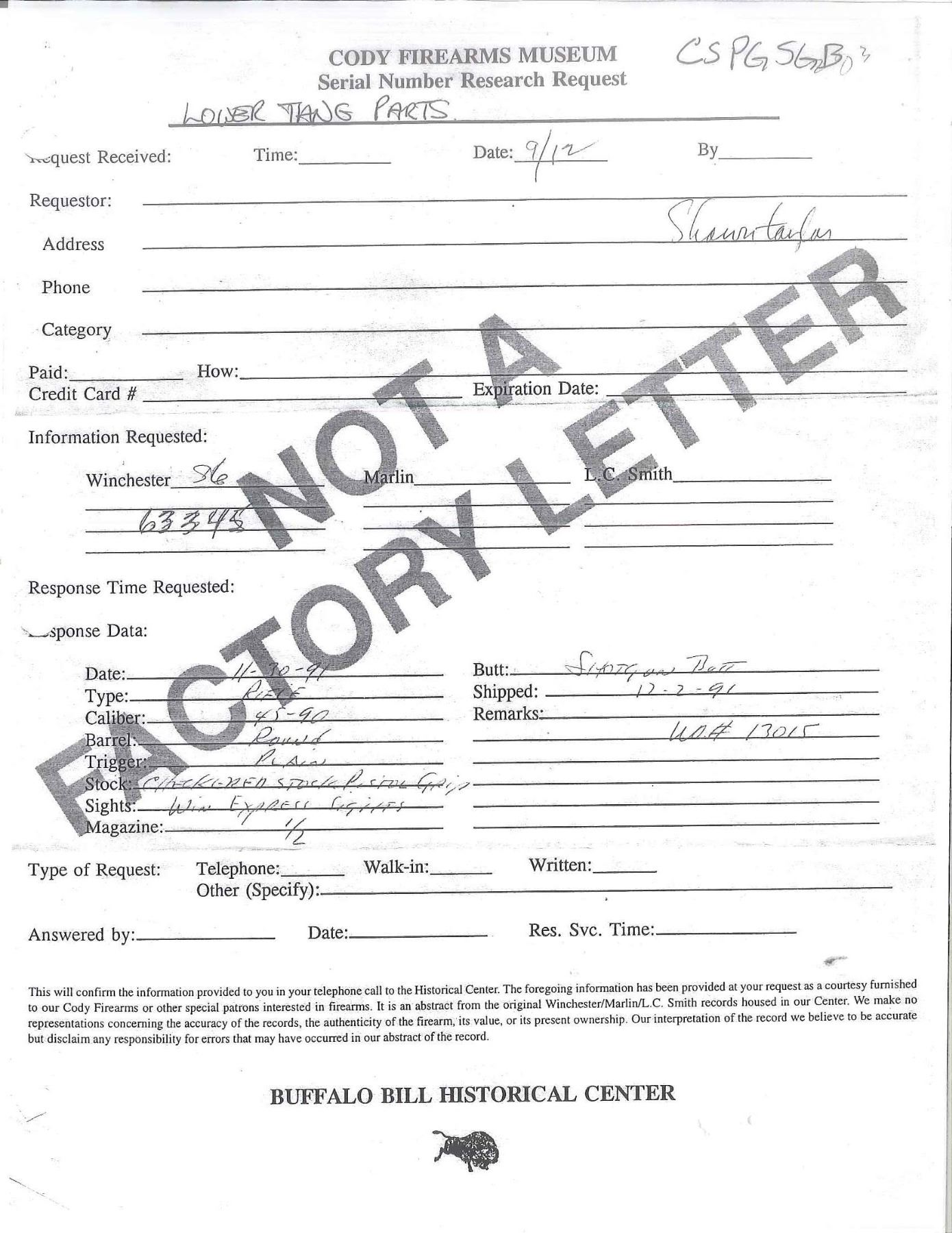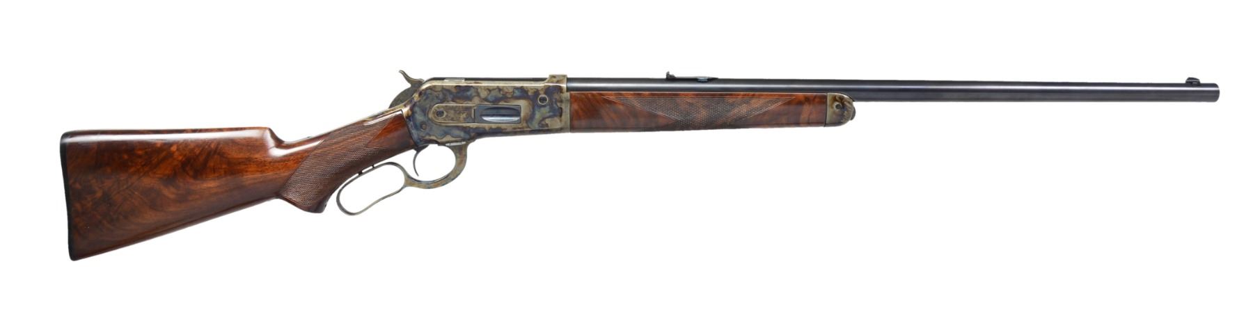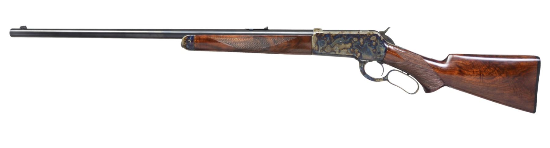 Cal. 45-90 WCF. S# 63345. Bbl. 26" rnd. w/ Marbles No. 31W white bead front sight & express rear sight. Button mag. Case colored action & forearm cap. Replacement fancy forearm & pistol grip walnut stock have style H checkering & hard rubber shotgun buttplate. Mfg. 1891. UNATTACHED ACCESSORIES: Cody Firearms Museum research request confirming original configurations of the rifle. CONDITION: nicely restored rifle by Mike Hunter Restorations. Bbl. & action retain 99% restored blue & case colored finish. Very good wood finish. Bright bore w/ strong sharp rifling. (01-16637/DS). ANTIQUE. $3,500-4,500.