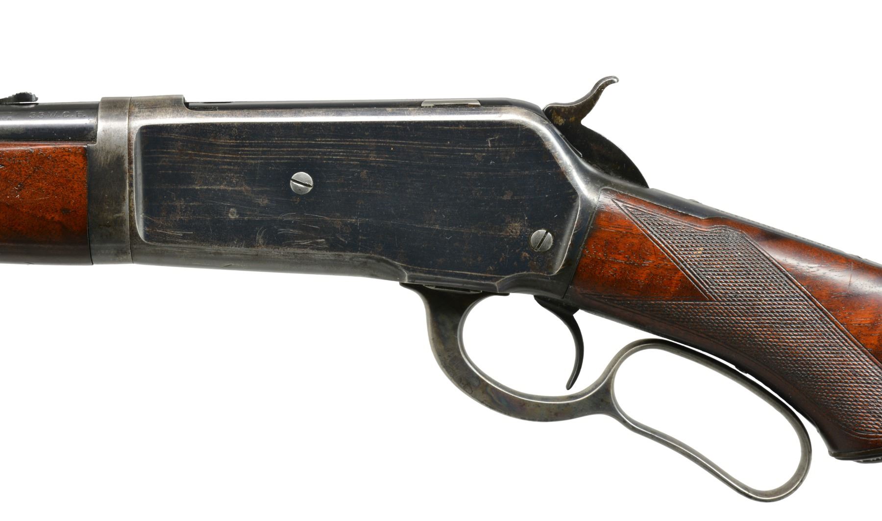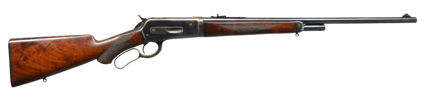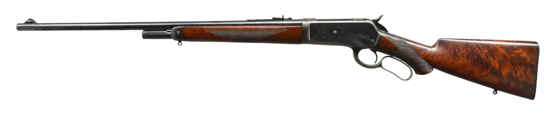 ACTION RIFLE. Cal. 33 WCF. S# 153357. Bbl. 24" tapered rnd. of takedown style. Ramp mounted Lyman Sheared ivory bead front sight w/ flat top elevator adj. sporting rear. Half length takedown mag. Blued action w/ case colored lever. Forearm & pistol grip stock of fancy black walnut featuring style H checkering, sling eyes, hard rubber grip cap & hard rubber shotgun buttplate. Mfg. 1914. CONDITION: bbl. & mag. tube retain over 90% lightly faded blue showing spots of freckling. Action retains 75% case colors showing spots of flaking & corrosion. Lever retains 70% lightly visible darkened case colors. Stocks have lightly worn original finish showing scratches, marks & sm. grain checks. Bore retains sound rifling. (20-668/DS). CURIO. $3,000-4,500.