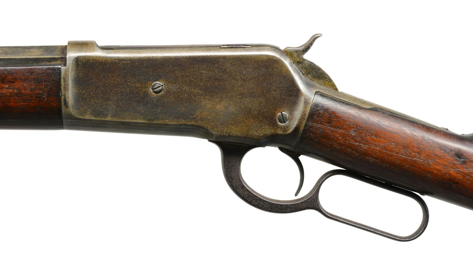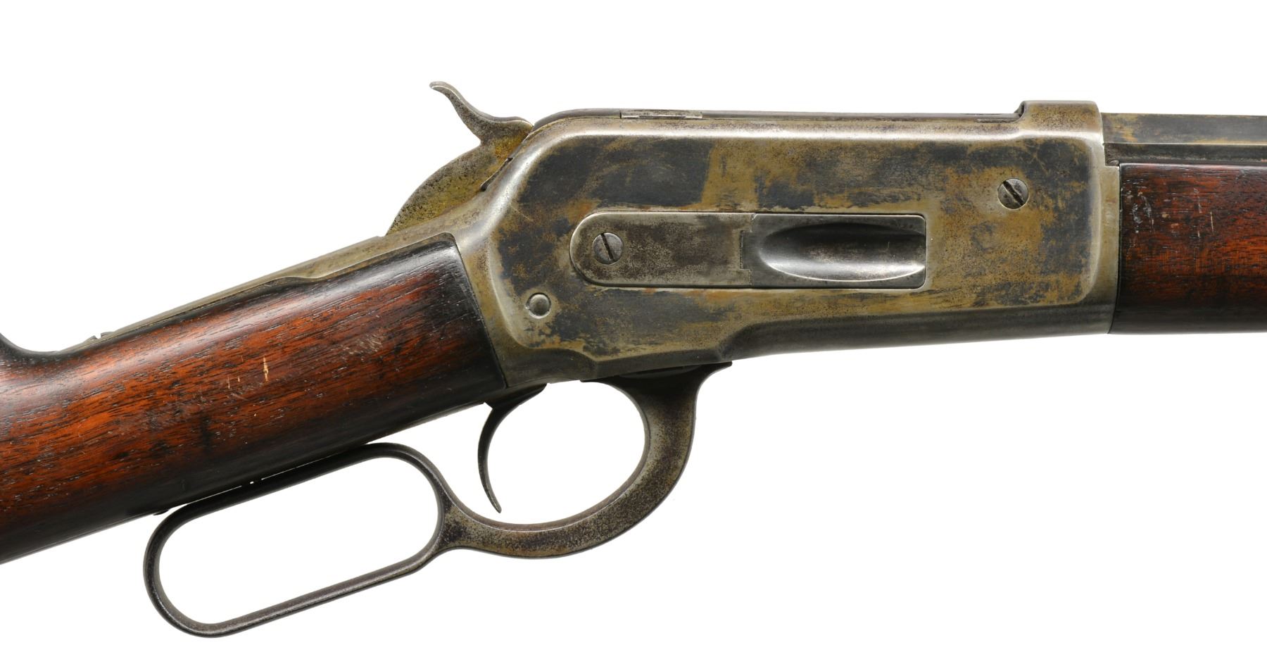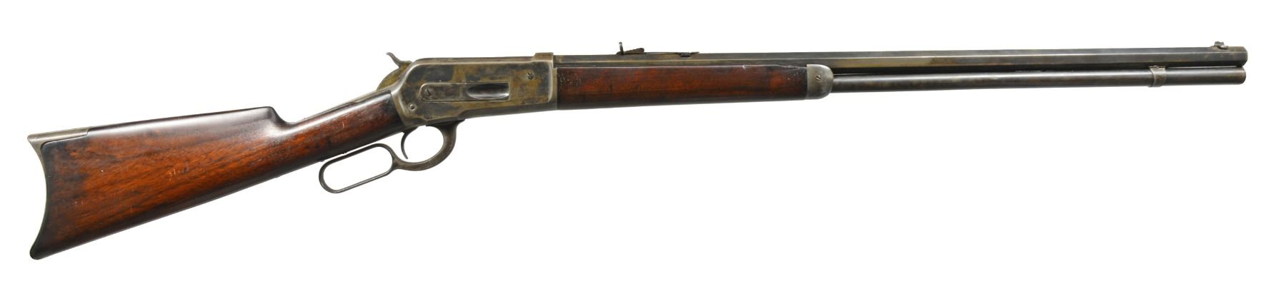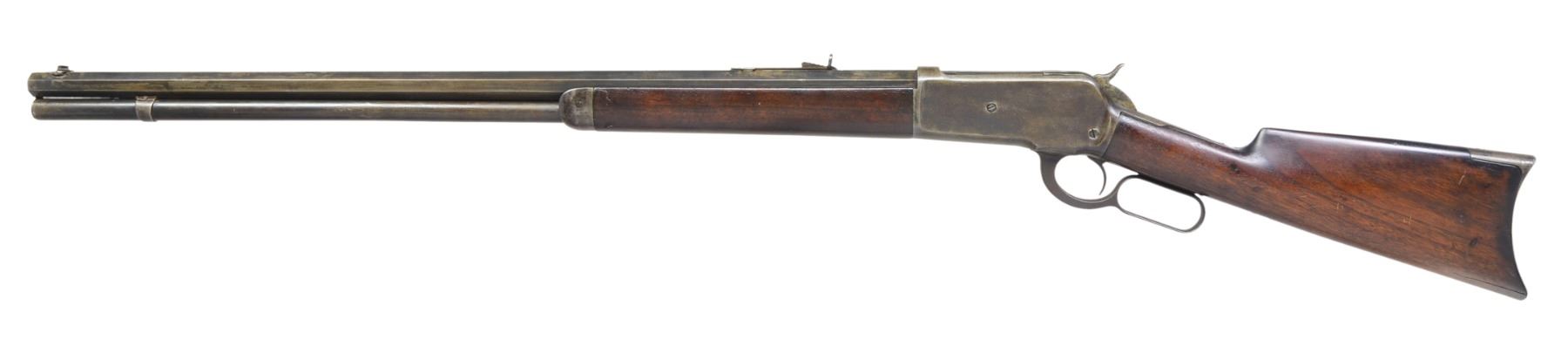 Cal. 38-56 WCF. S# 96620. Bbl. 28" oct., 2" longer than standard. Sporting front sight w/ broken blade & elevator adj. rear sight. Full length mag. tube. Walnut forearm & straight grip stock w/ crescent steel buttplate. Mfg. 1895. CONDITION: metal has mottled gray appearance from touch up finish showing areas of very light pitting. Refinished wood has dark appearance showing scratches & marks. Forearm shows cracks & chips on both sides of bbl. channel close to & around forearm cap. Stock has 2 lg. cracks extending from toe. Bore has darkened appearance w/ worn rifling showing scattered pitting. (01-17073/DS). ANTIQUE. $2,000-3,000.