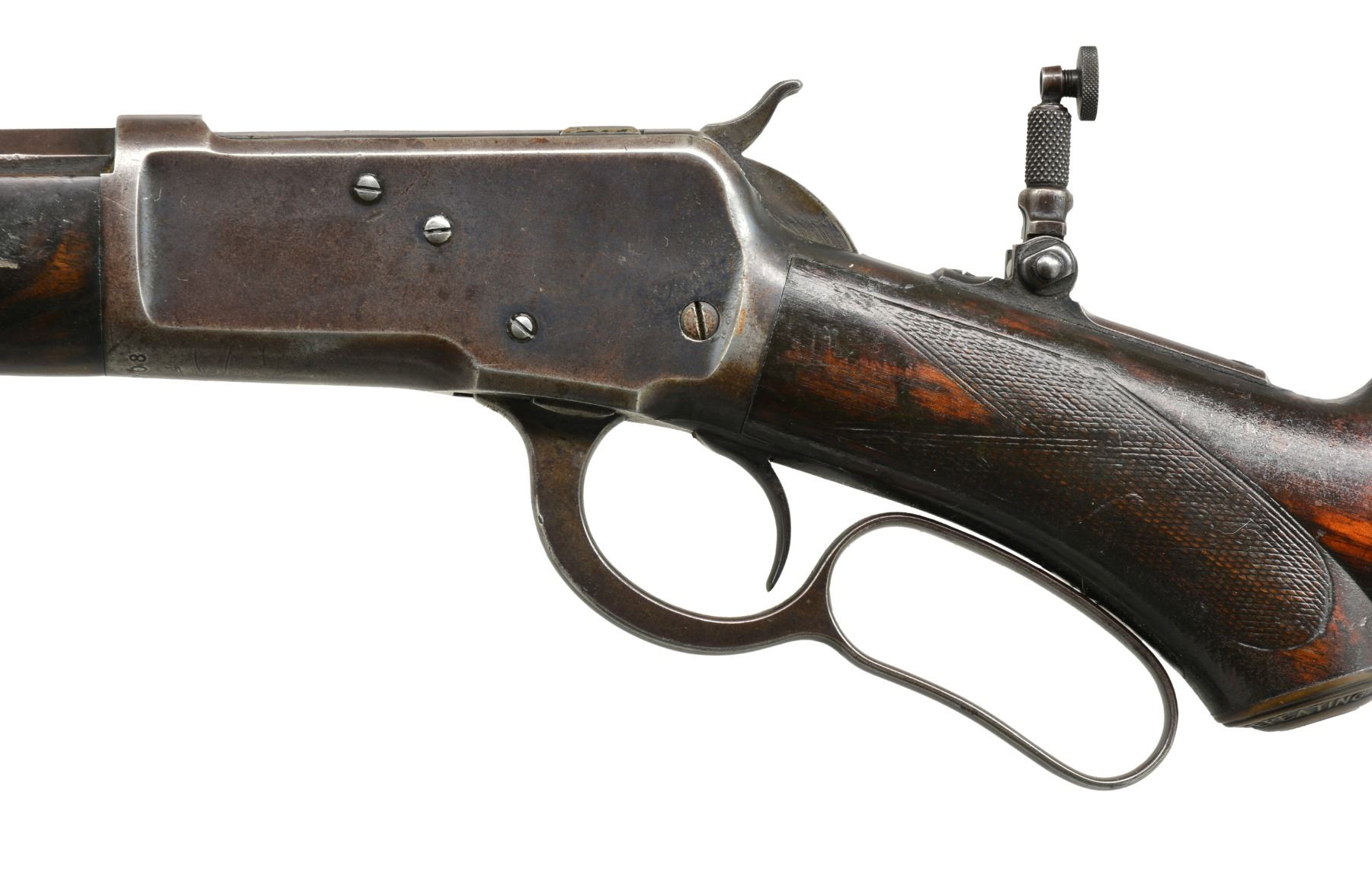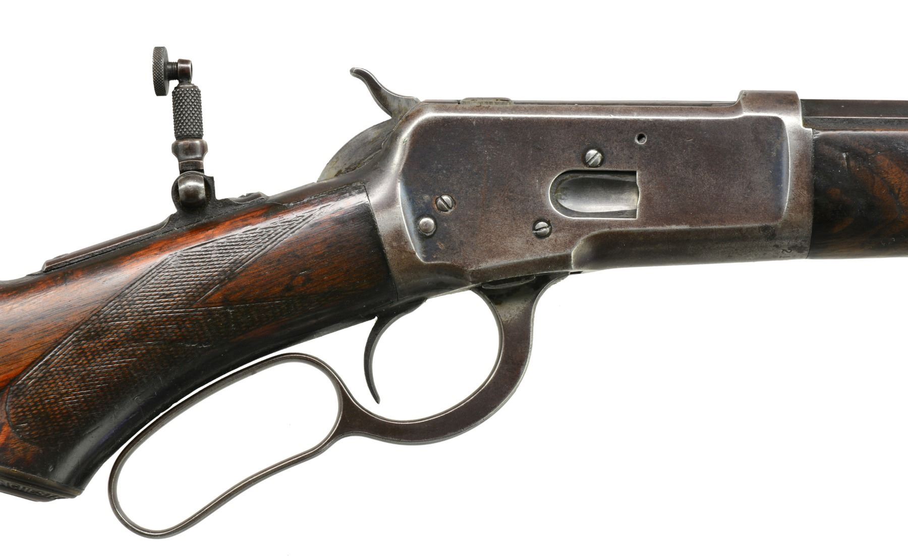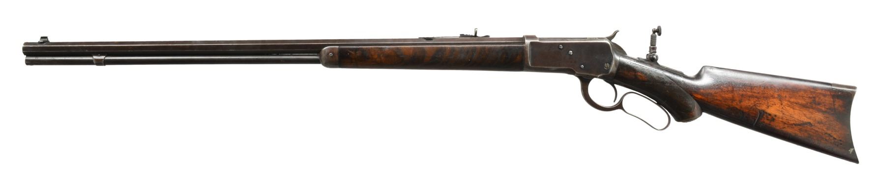 Cal. 25-20 WCF. S# 216708. Bbl. 26" oct., 2" longer than standard. Bead front sight, semi buckhorn sporting rear sight & combination tang sight. Full length mag. Forearm & pistol grip walnut stock feature style I factory checkering, hard rubber grip cap & crescent steel buttplate. Mfg. 1903. CONDITION: blue is fading to a brown/gray patina showing spots of corrosion. Stock & forearm have added finish over substantial wear & numerous dents, scratches & handling marks. Bore is dark w/ some pitting. (20-682/DS). CURIO. $2,250-3,000.