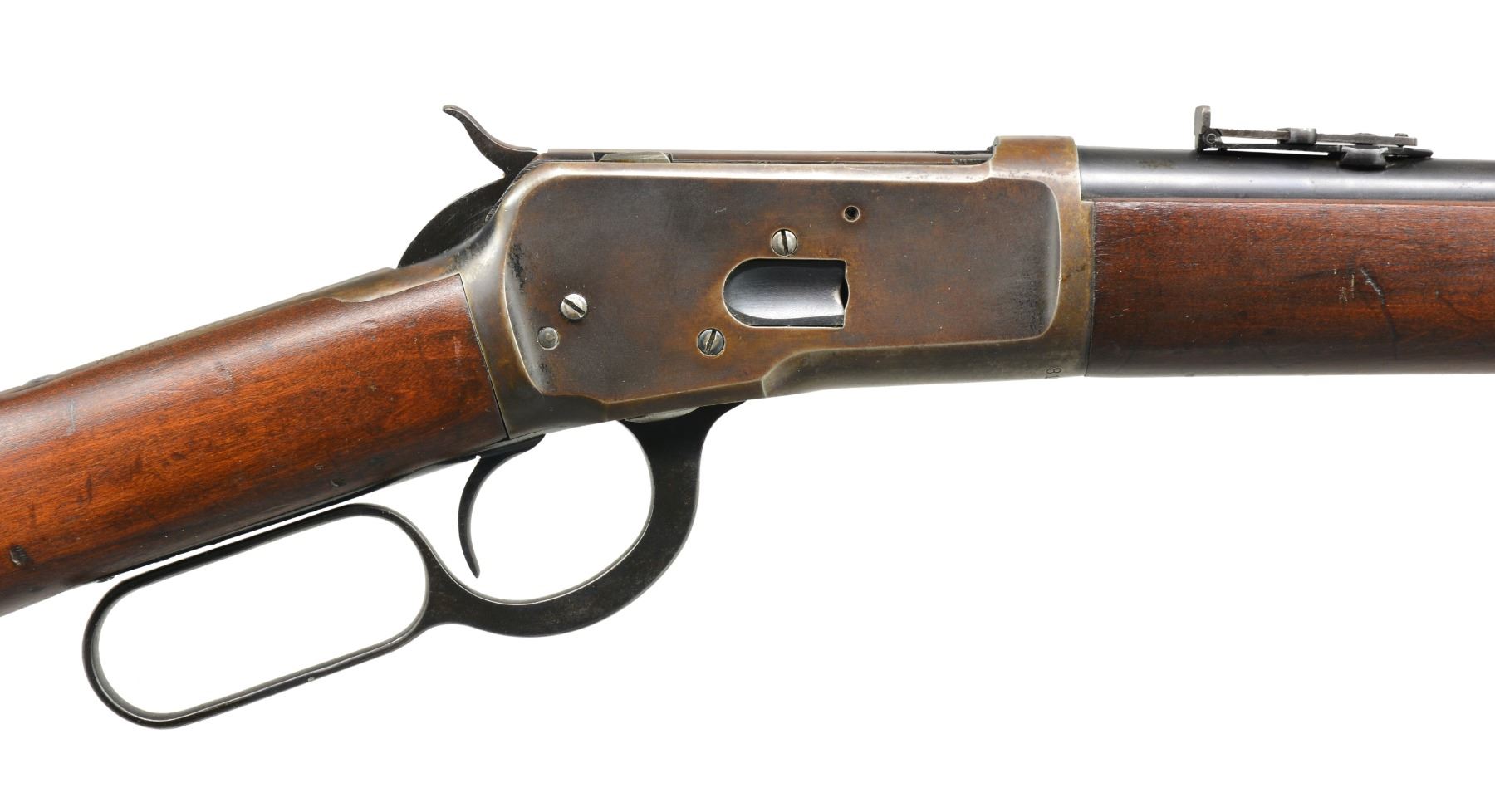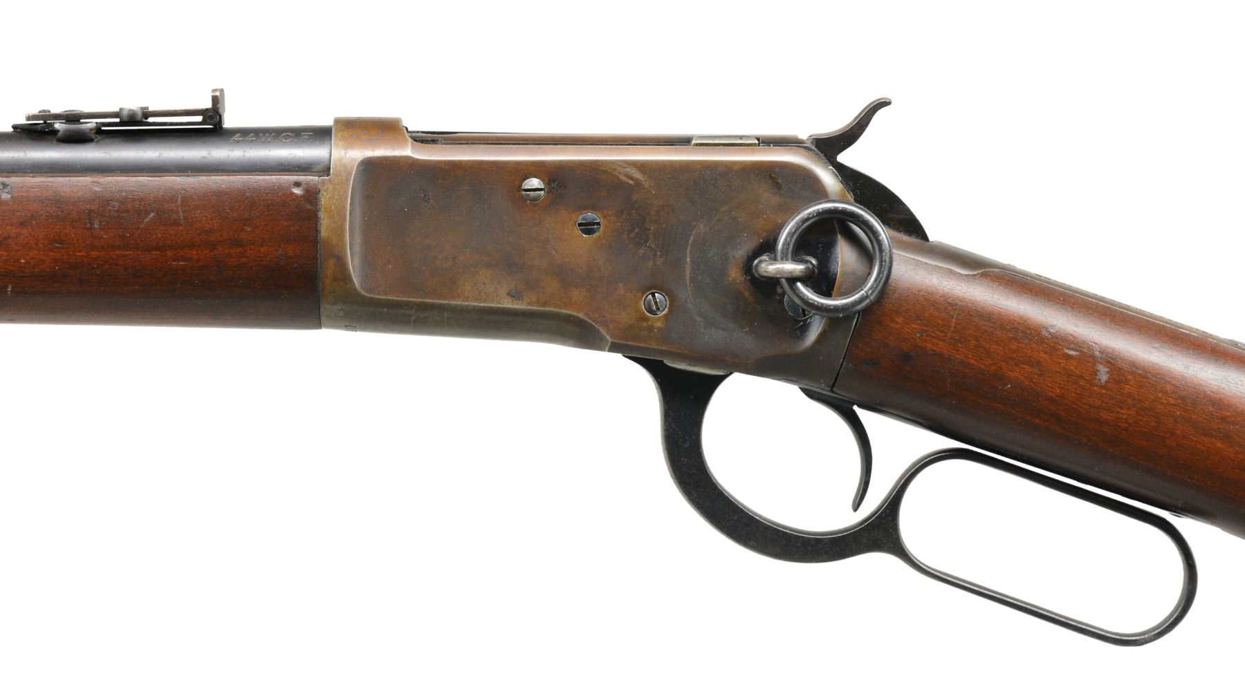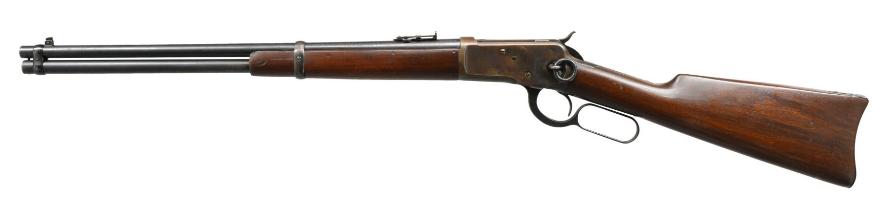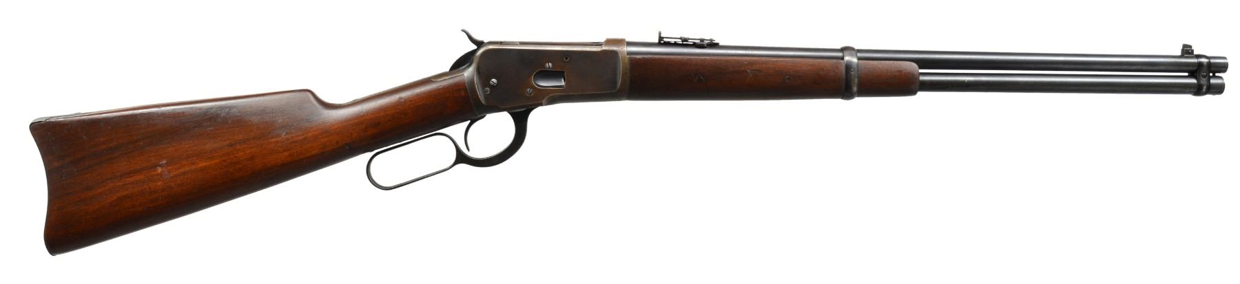Cal. 44 WCF. S# 816741. Bbl. 20" carbine style. Pinned blade front sight w/ adj. leaf carbine rear sight. Full length mag. Blue finished action has saddle ring on left side. Gumwood forearm & straight grip stock w/ steel carbine buttplate. Mfg. 1918. CONDITION: bbl. & mag. tube retain 80% lightly faded blue showing scattered spots of freckling & corrosion. Receiver retains blue in protected areas w/ balance fading to smooth brown patina. Stock & forearm show light wear w/ scattered scratches & handling marks. Stock has open grained check on right side of butt. Bore is generally bright w/ sound rifling showing scattered light pitting. (20-565/DS). CURIO. $2,000-3,000.