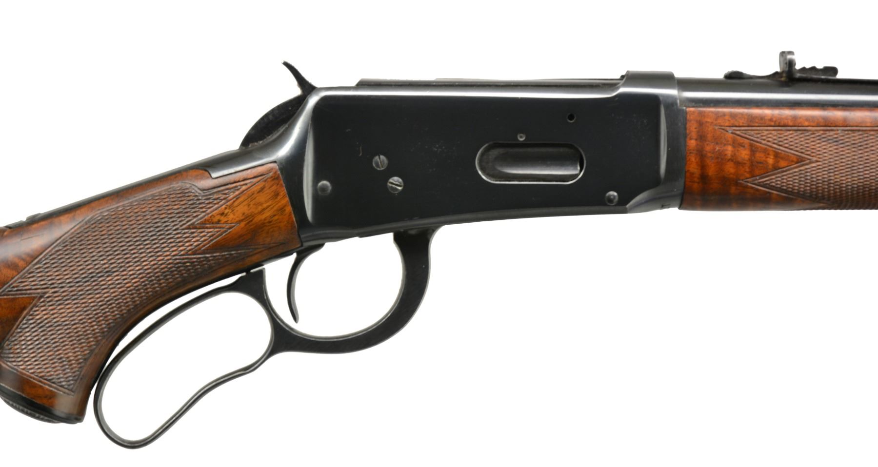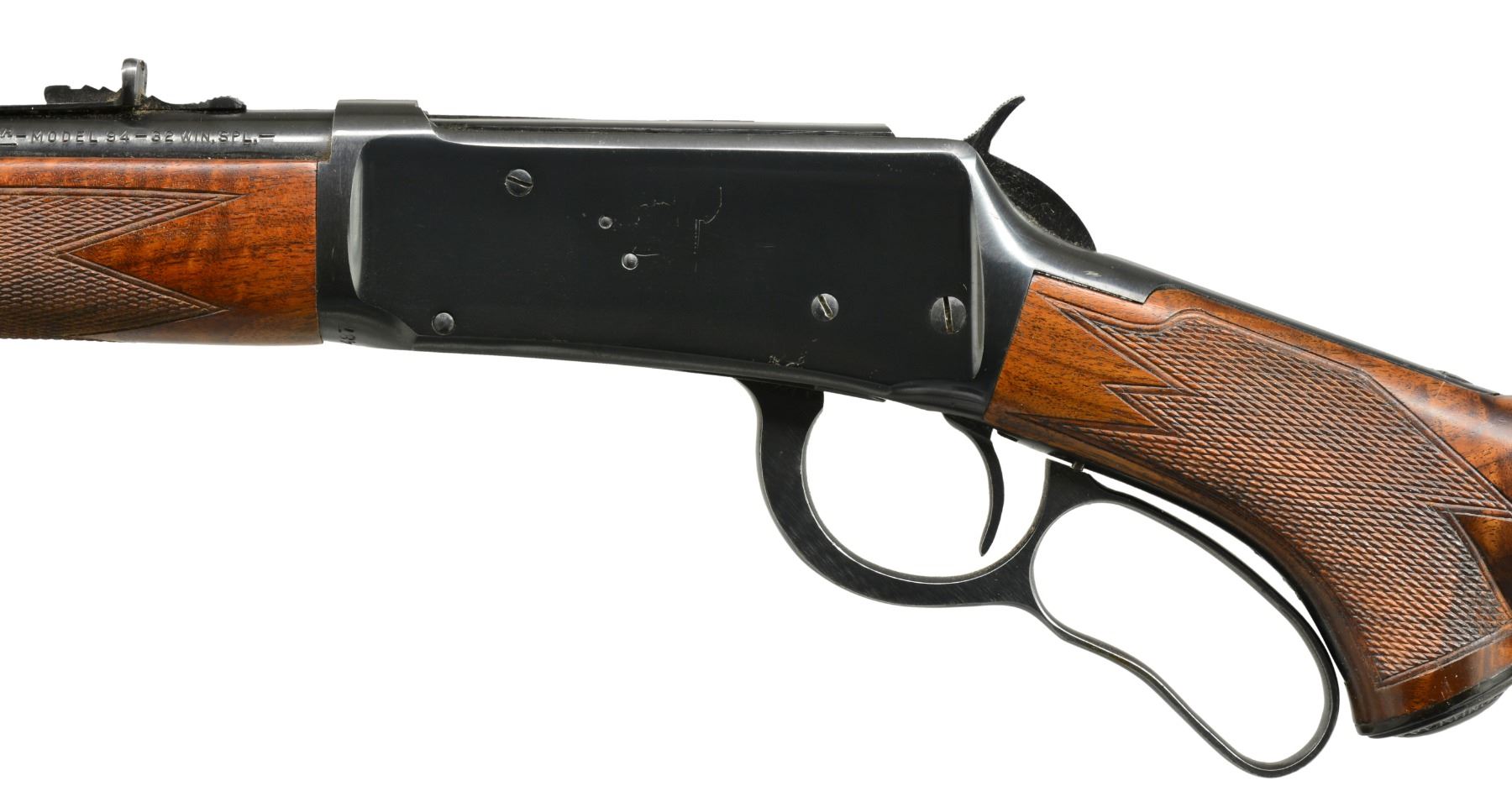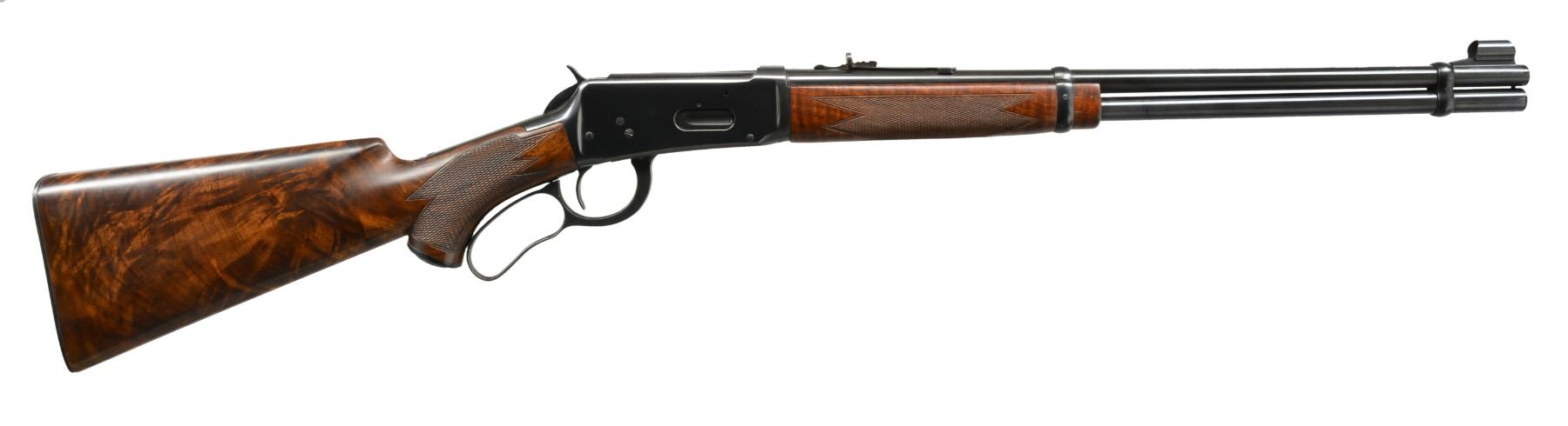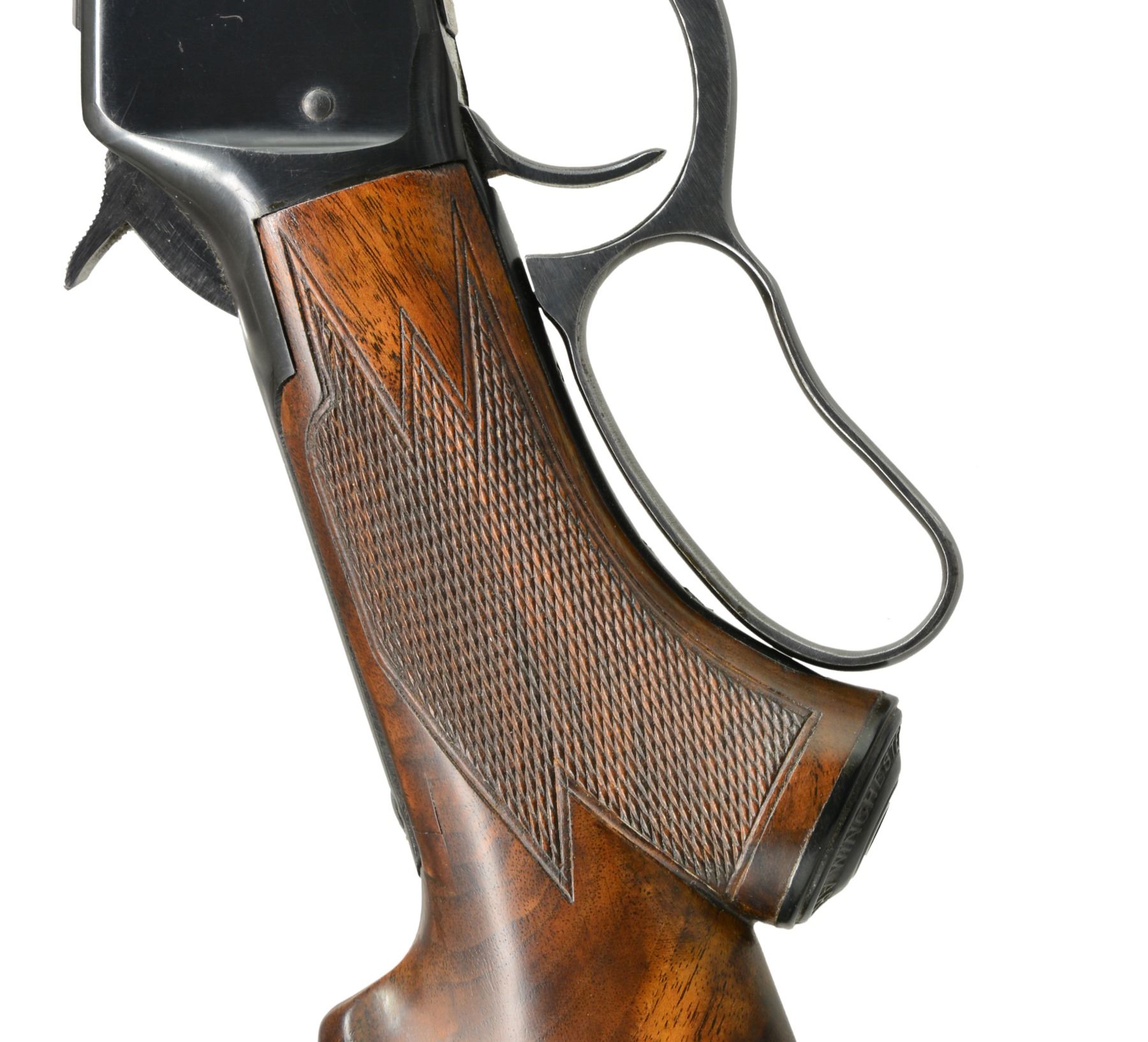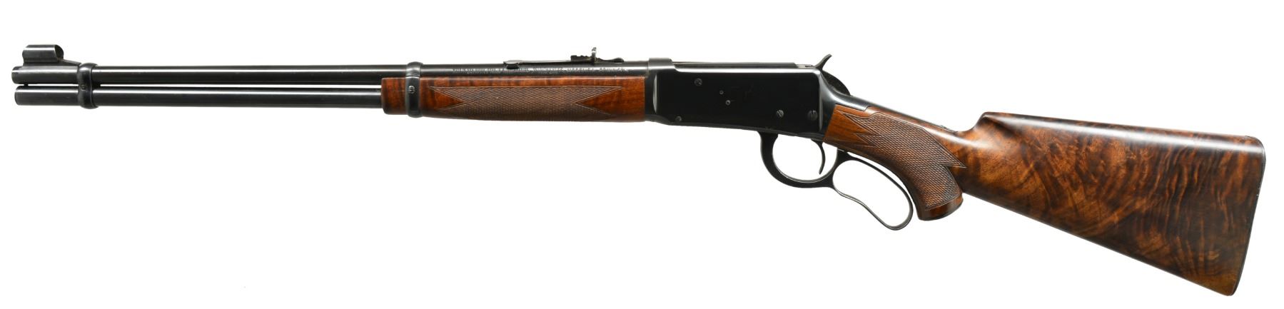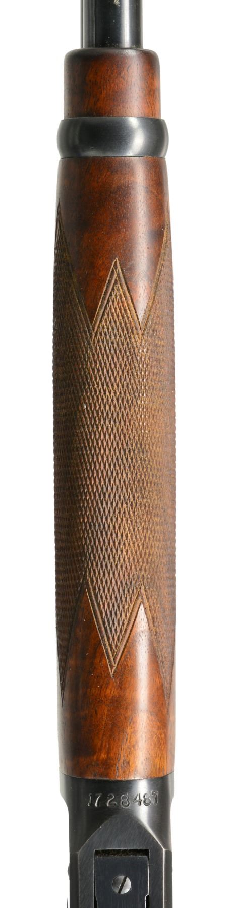 ACTION CARBINE. Cal. 32 Win. Spl. S# 1728487. Bbl. 20" carbine style w/ ramp mounted hooded bead front sight & elevator adj. semi buckhorn sporting rear sight. Full length mag. Blue finish. Action is pistol grip style which is very seldom encountered on Post War model 94's. S# indicates 1951 mfg. Short wood band fastened forearm & hard rubber capped pistol grip stock of fancy black walnut featuring point pattern factory hand checkering that wraps around forearm. Checkered steel buttplate as found on the Model 64 or 70. CONDITION: bbl. & action retain 97% bright original blue showing sm. scratches & freckling. Top tang screw shows screwdriver distortion. Stock & forearm have very good finish showing light wear & a few sm. marks. Stock shows sm. added wood repair right of top tang. Bright near excellent bore. (20-855/DS). CURIO. $3,000-5,000.