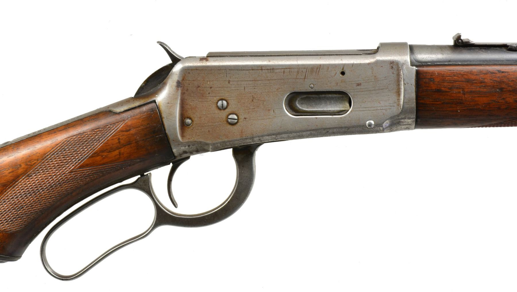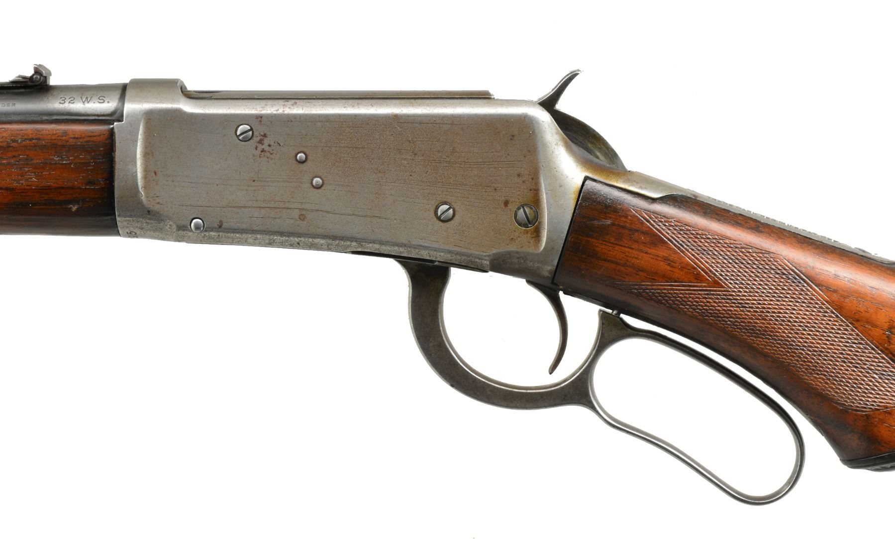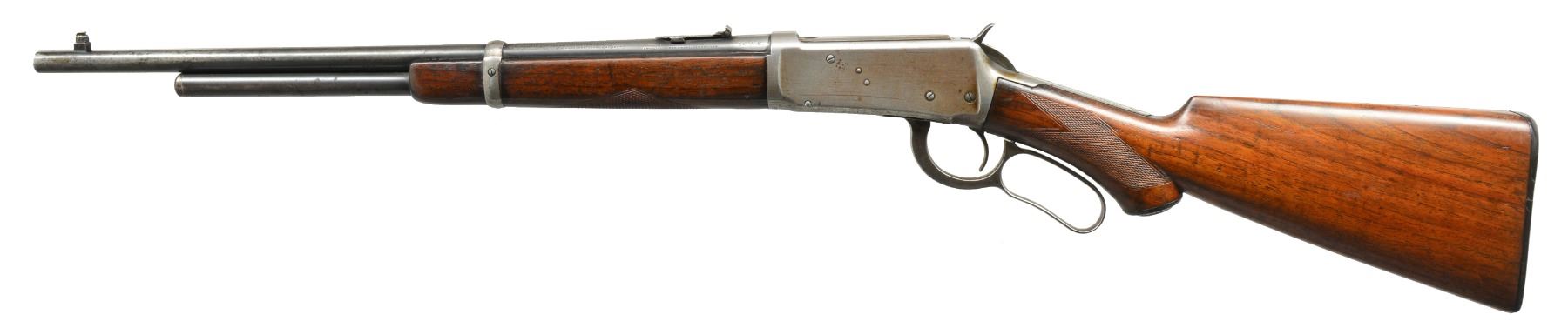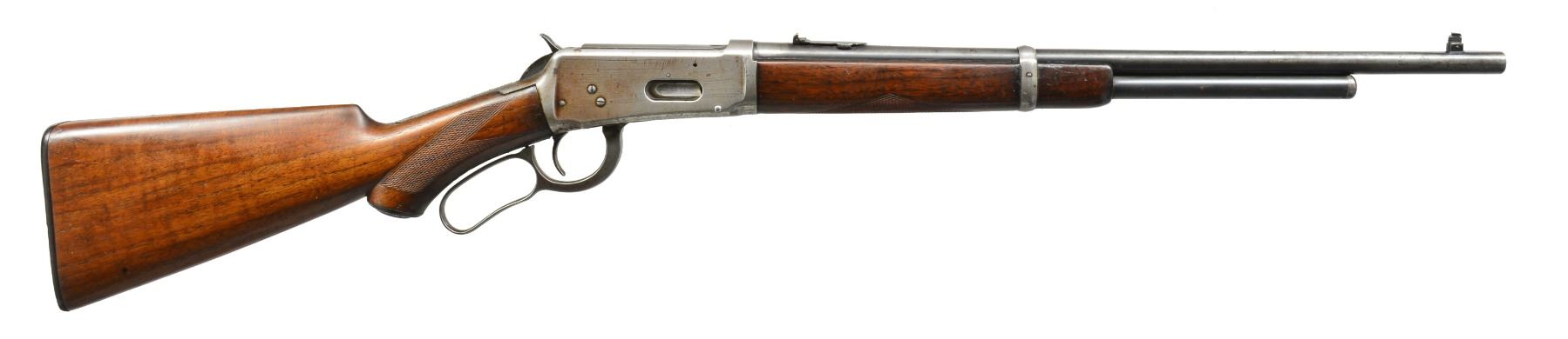 Cal. 32 WS. S# 475195. Bbl. 20" carbine style w/ replacement pinned blade front sight & 3 leaf express rear sight. 3/4 Length mag. Carbine forearm & hard rubber capped pistol grip stock w/ hard rubber shotgun buttplate having style I factory checkering. 1909 Mfg. CONDITION: bbl. & mag. tube retain 40% dull fading blue showing spots of corrosion. Top of bbl. has file marks between rear sight & proof mark. Action finish has faded to gray showing scratches & spots of pitting. Sanded & refinished wood show handling marks & freshened checkering. Dark worn bore shows scattered pitting. (20-647/DS). CURIO. $1,500-2,500.