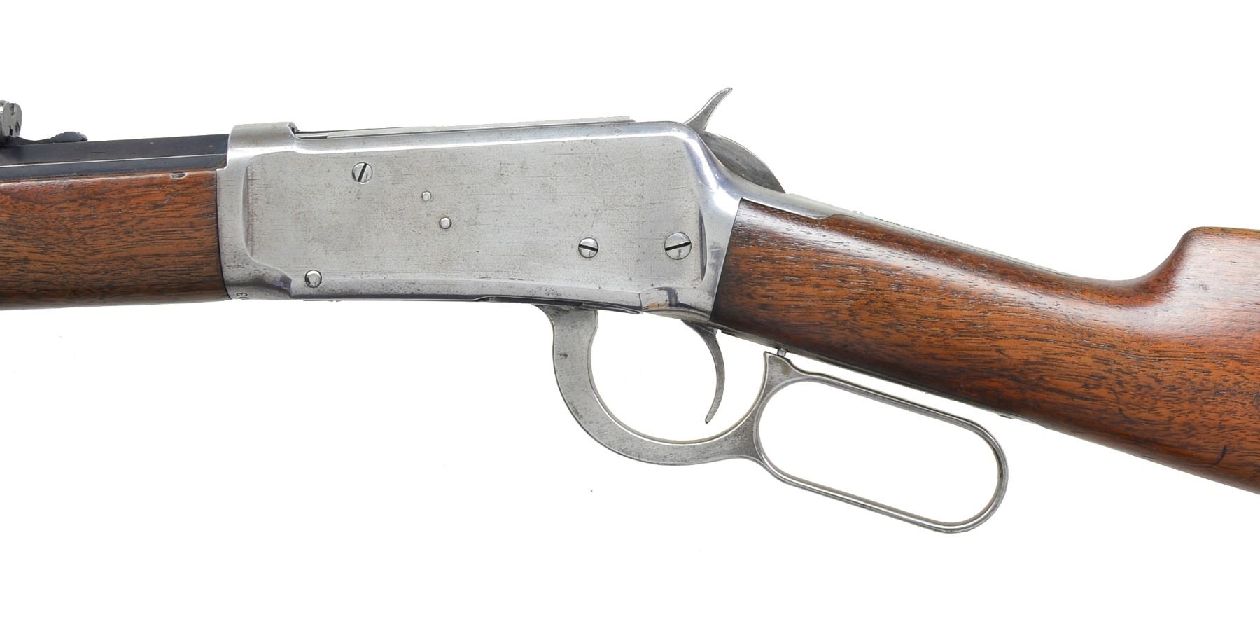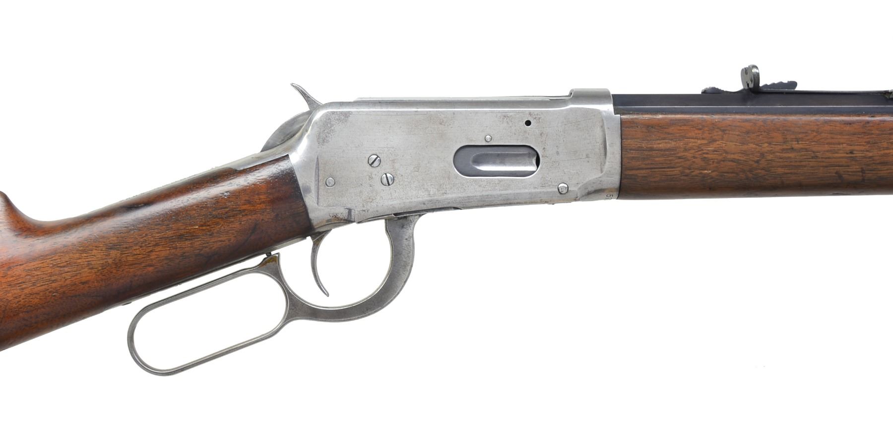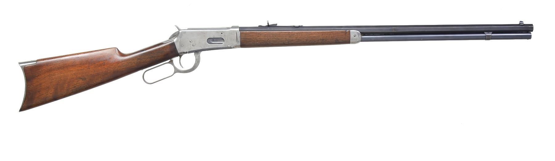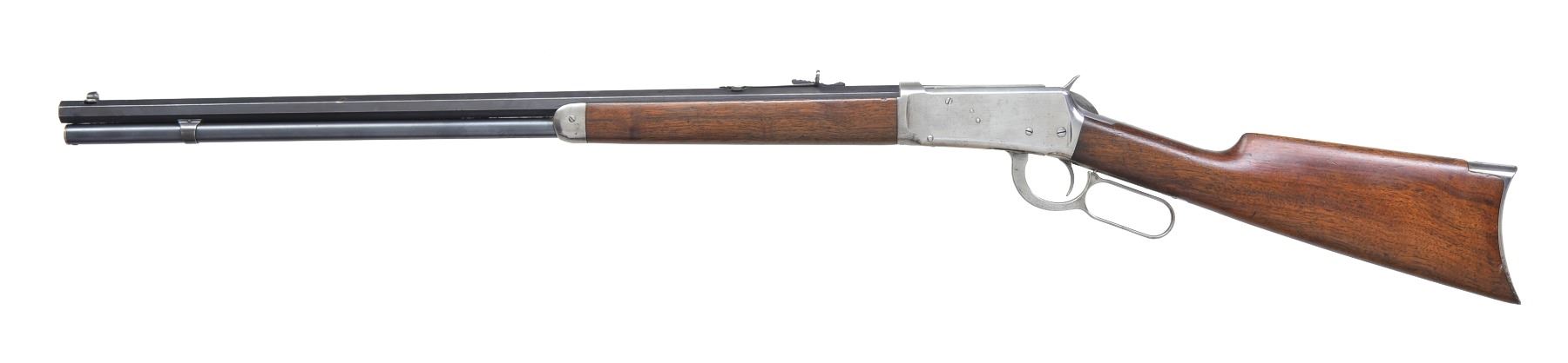 Cal. 38-55. S# 573003. Bbl. 26" oct. Sporting front sight w/ semi buckhorn sporting rear sight. Full length mag. Walnut forearm & straight grip stock w/ crescent steel buttplate. 1911 Mfg. CONDITION: bbl. & mag. tube retain 80% lightly faded blue showing edge wear. Action has faded to gray & is cleaned bright. Wood shows wear w/ scattered scratches, dents & handling marks. Bore is generally bright retaining sound rifling. (20-693/DS). CURIO. $1,250-1,750.